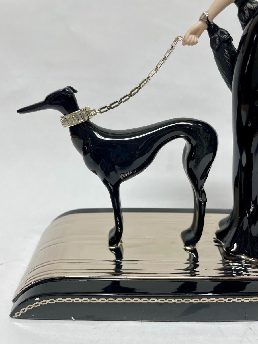 Hand-painted ceramic, fashionably-dressed woman walking her dog. Stands over 10" tall, 10" long at the base. Comes with original styrofoam packing/storage box. Was sealed inside box with manufacturer's packing take, box was opened only to show figurine.
