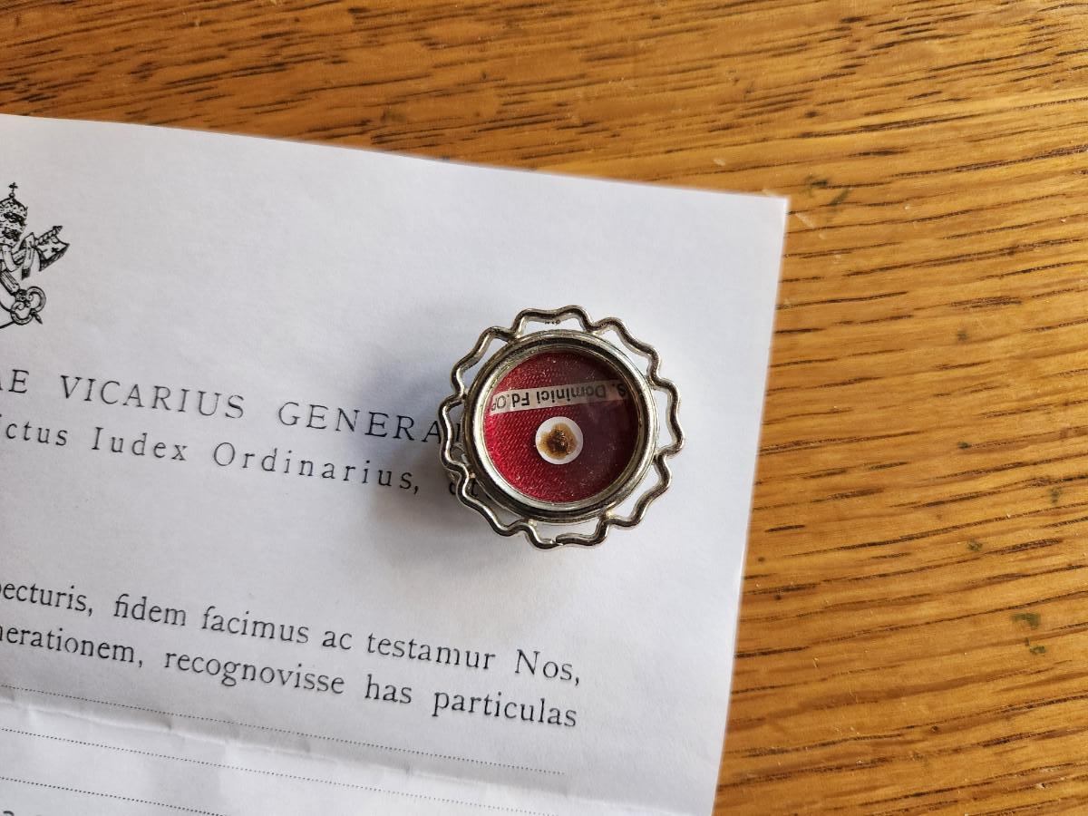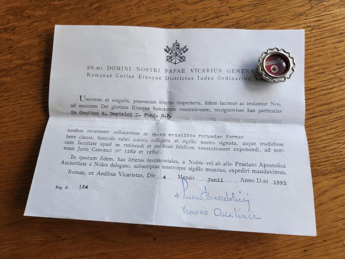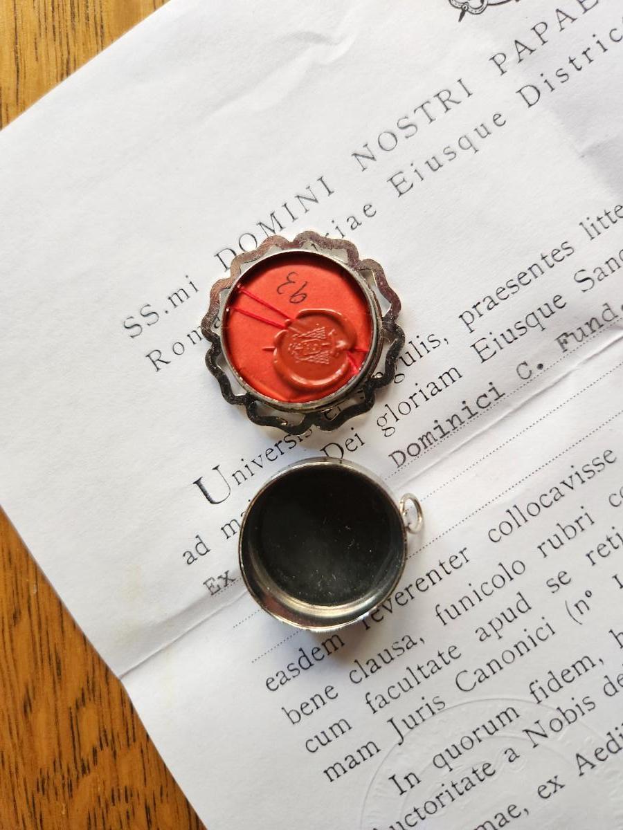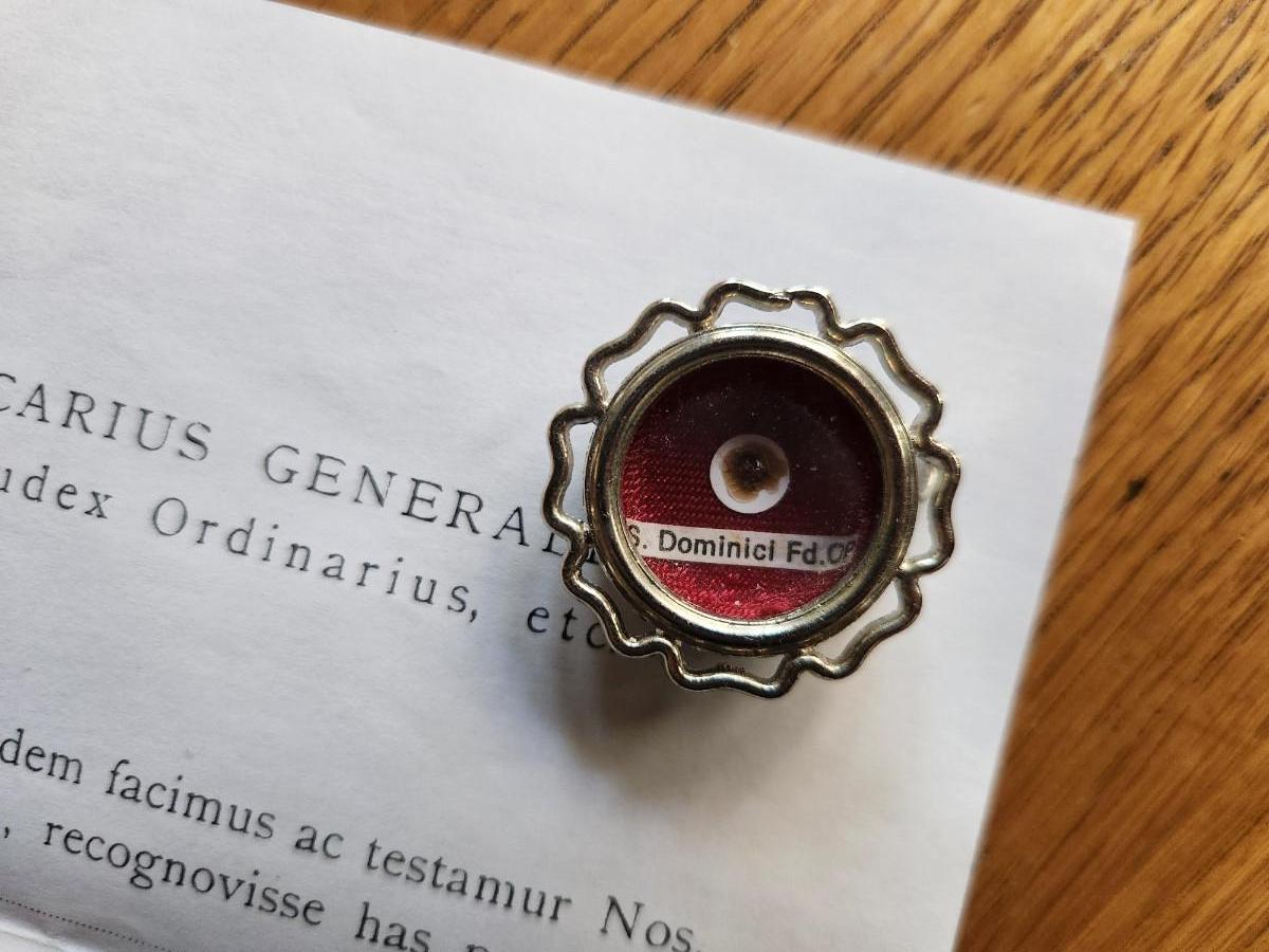 This auction lot is for a Saint's Reliquary Case. This case contains the "relic" of St. Dominici C. Fund, OP - as is the accepted tradition and custom the "relic" is not being sold, only the case that holds it. The "relic" is a gift. This item has the red sealed wax of the Ecclesiastica and comes with papers as such.