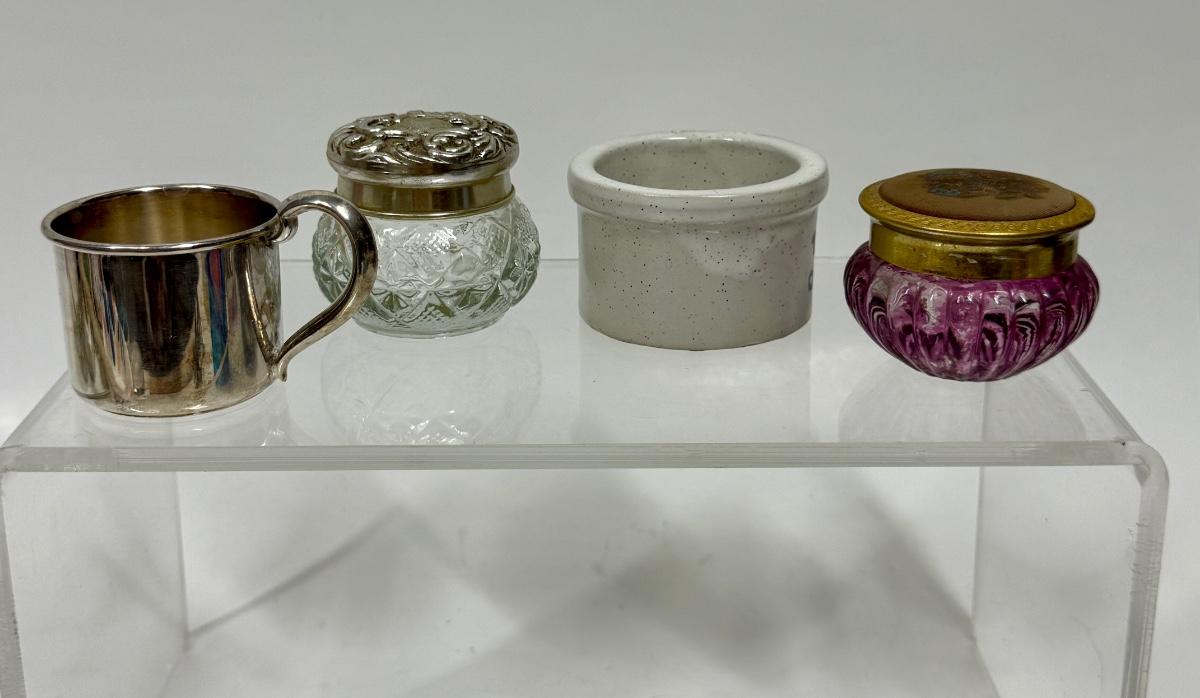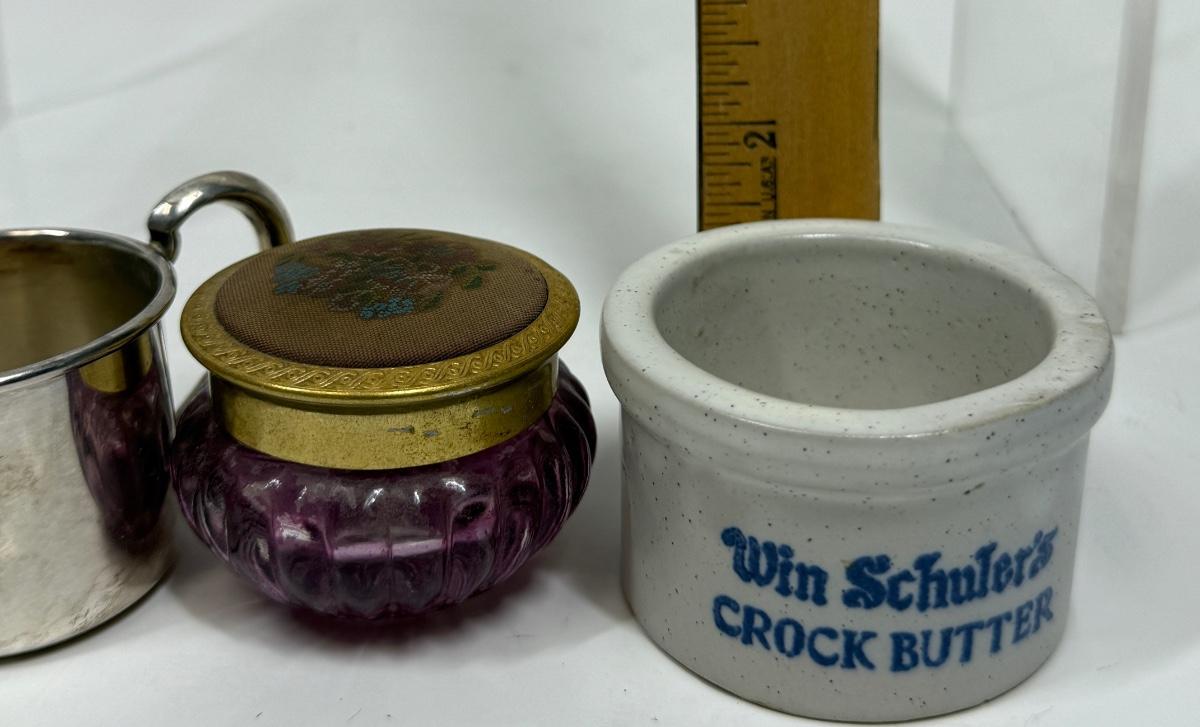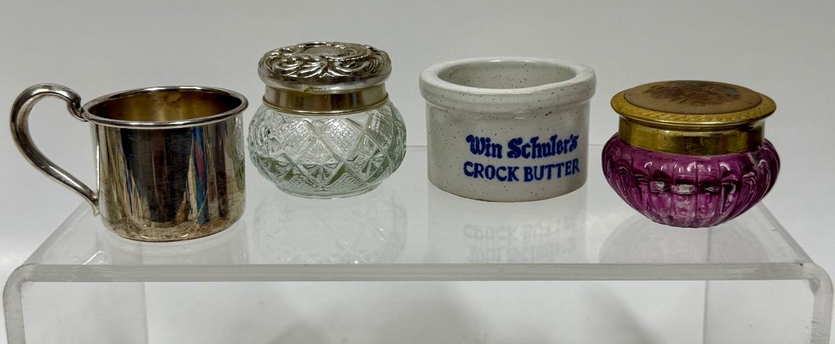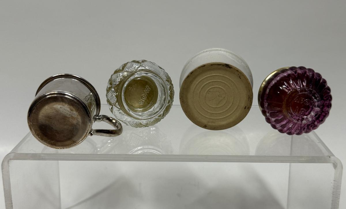 Small Lot Container Lot- @ Avon Jars, Baby Cup, and Schuber’s Crock Butter container