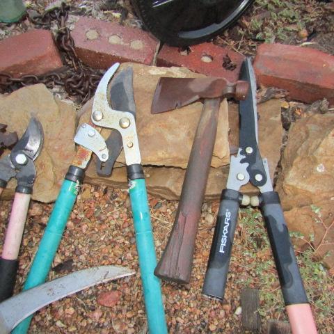 SPREADER, LOPPERS, SICKEL, HEDGE CUTTERS, AXE, SLEDGE HAMMER AND MORE