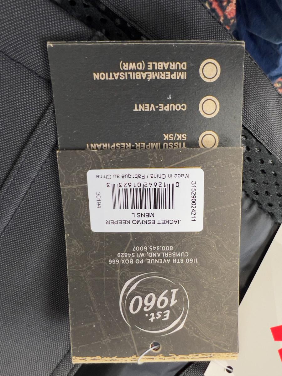 Eskimo Size Large Ice Fishing Coat, New with Tags