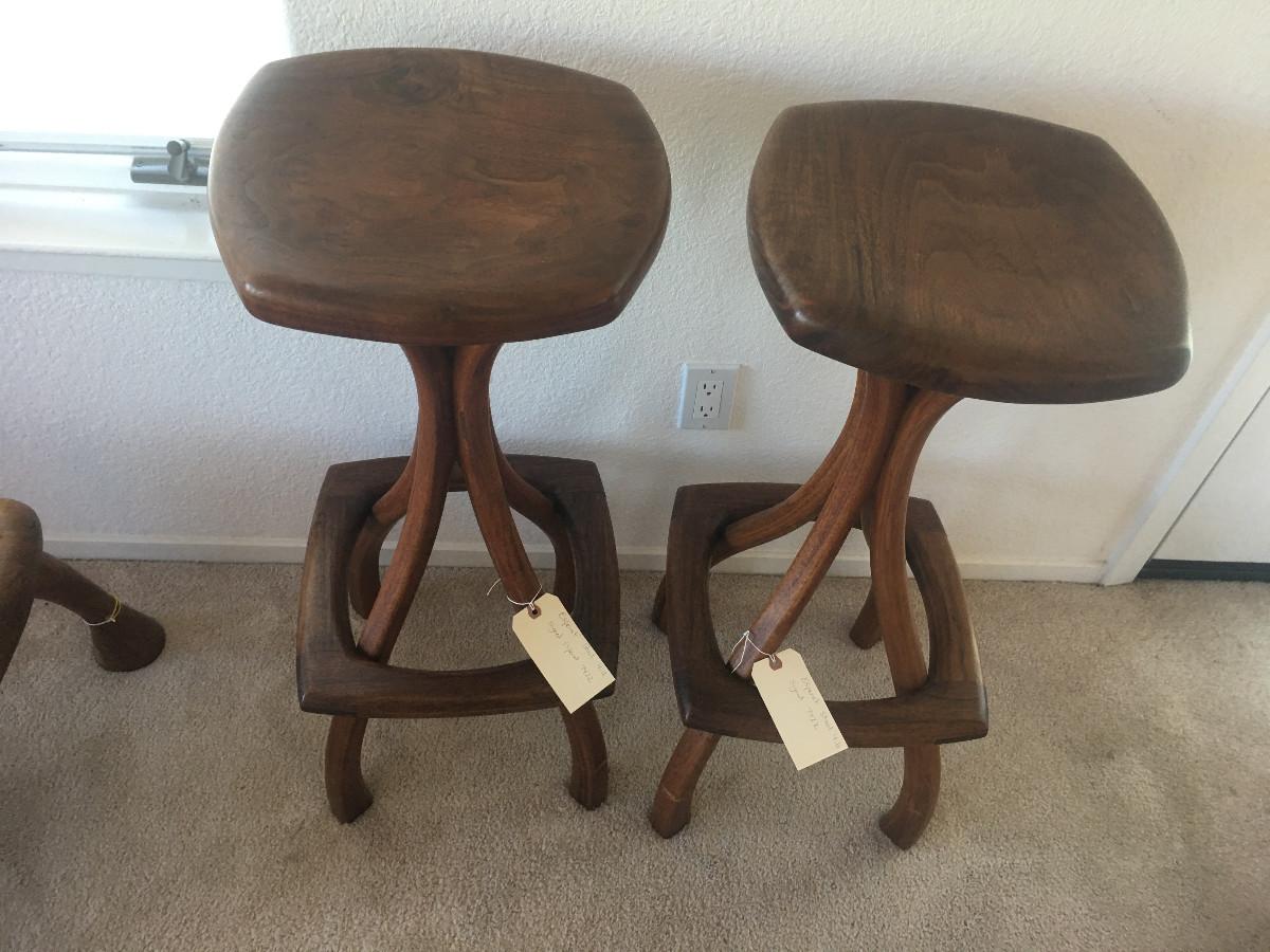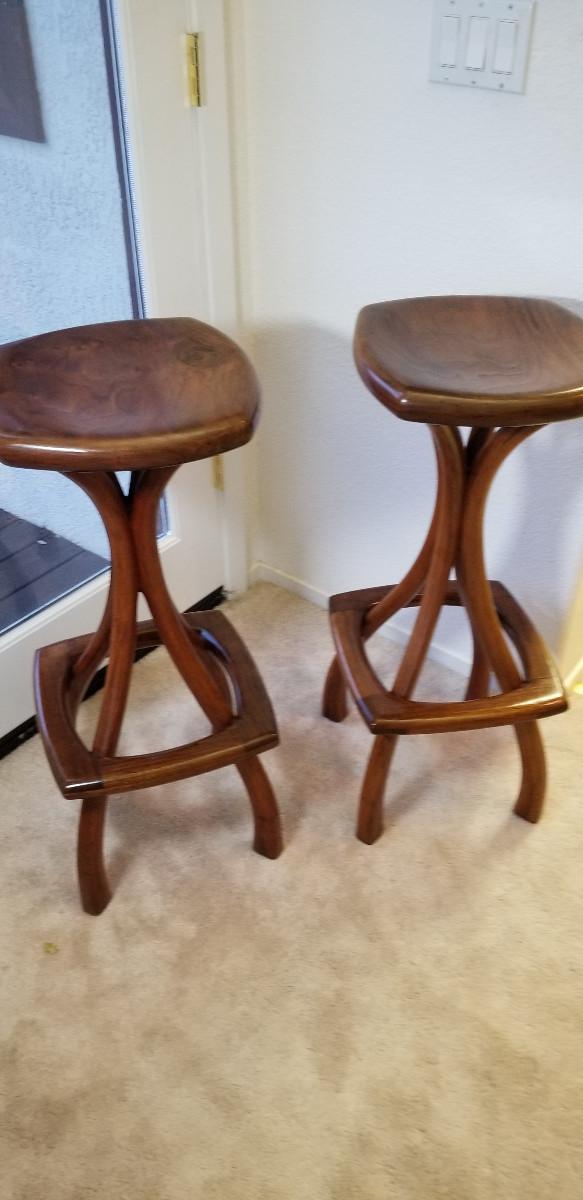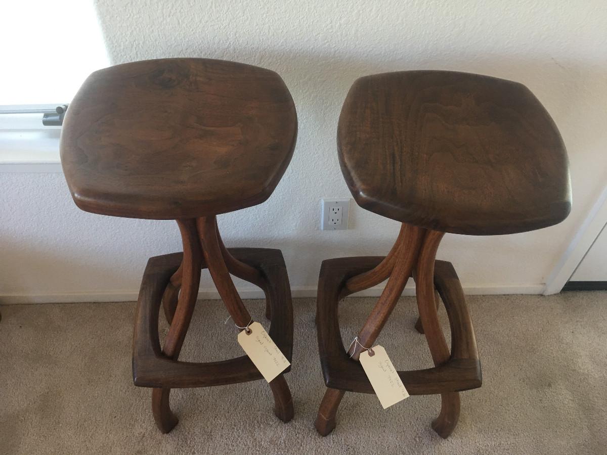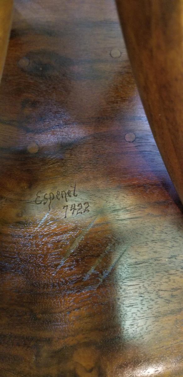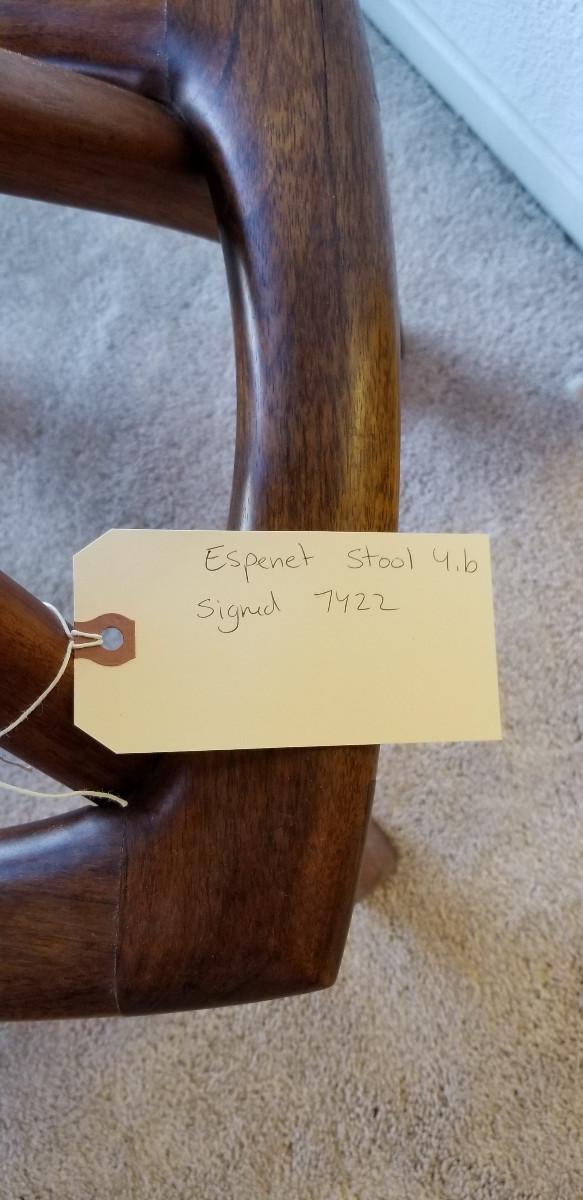Two Bar Stools. Dimensions - 33" h X 14" X 14" d. Makers Mark: “Espenet”. Item condition - appears to show normal use commensurate with age.