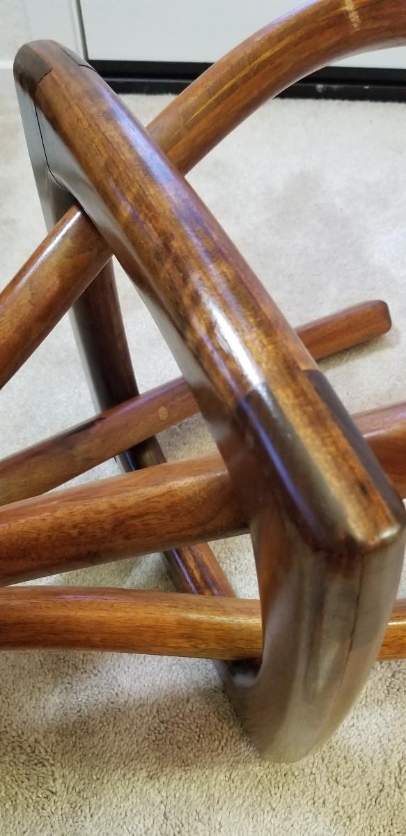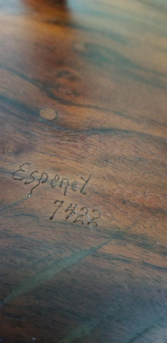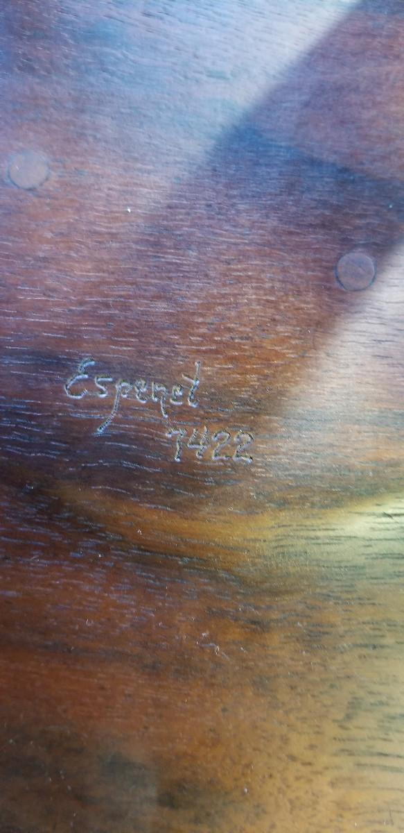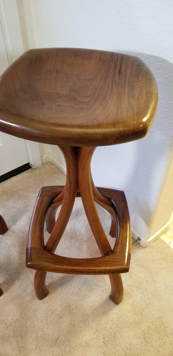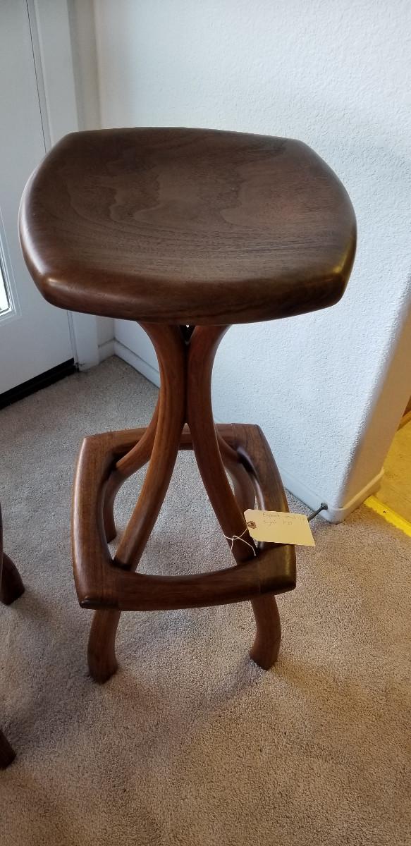 Two Bar Stools. Dimensions - 33" h X 14" X 14" d. Makers Mark: “Espenet”. Item condition - appears to show normal use commensurate with age.