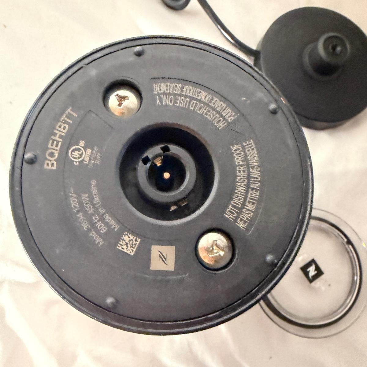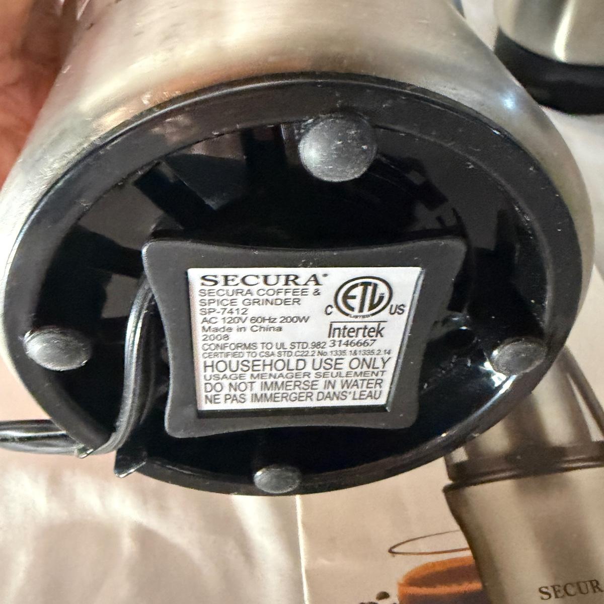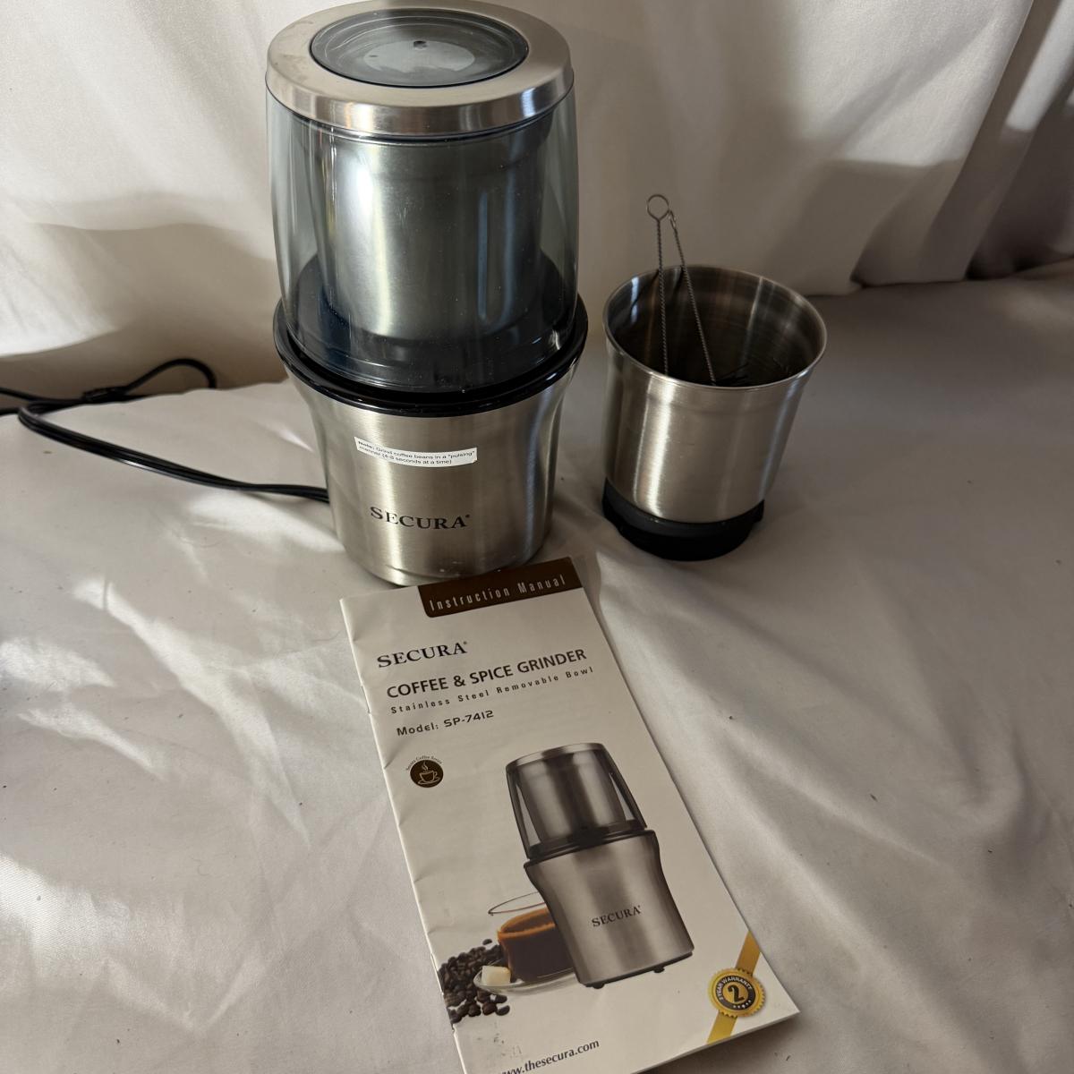 Lot includes a Fellow French press, Nespresso Aeroccino 3 milk frother, Four Bruntmor ceramic cups and saucers, Secura Coffee and spice grinder and two metal tampers. Secura grinder measures 4”D x 8”H. Grinder and frother both powered on when plugged in.