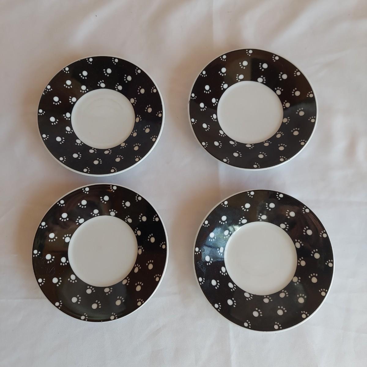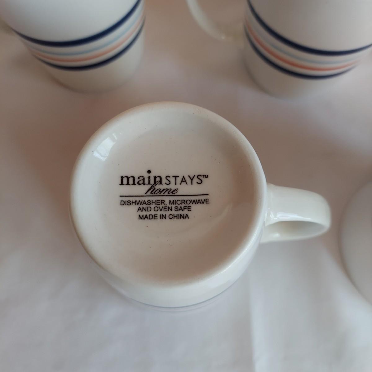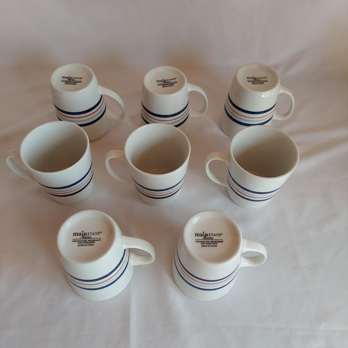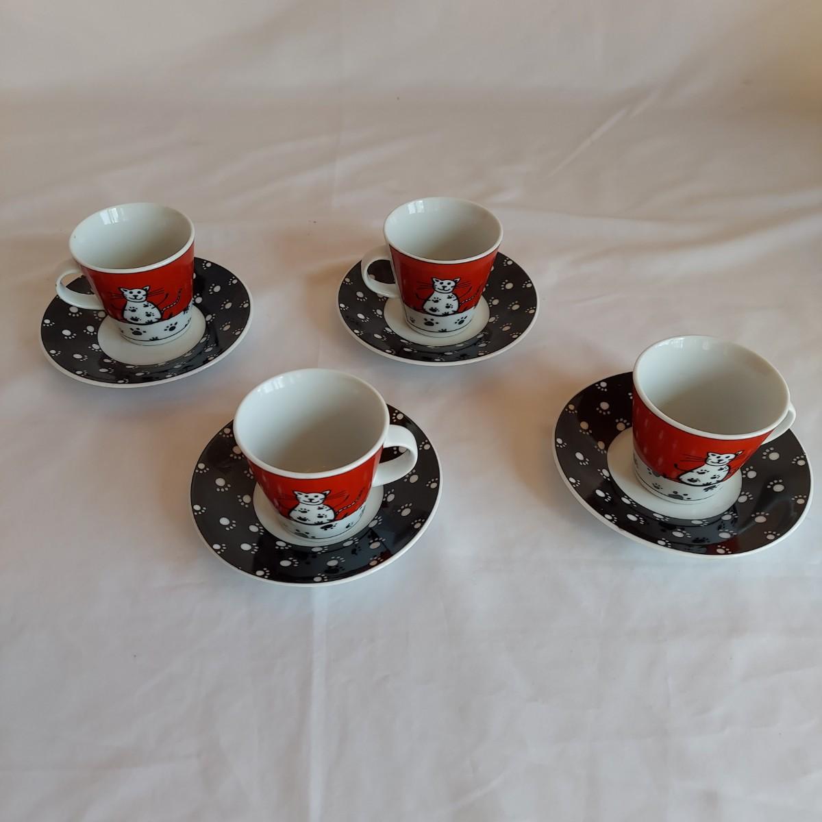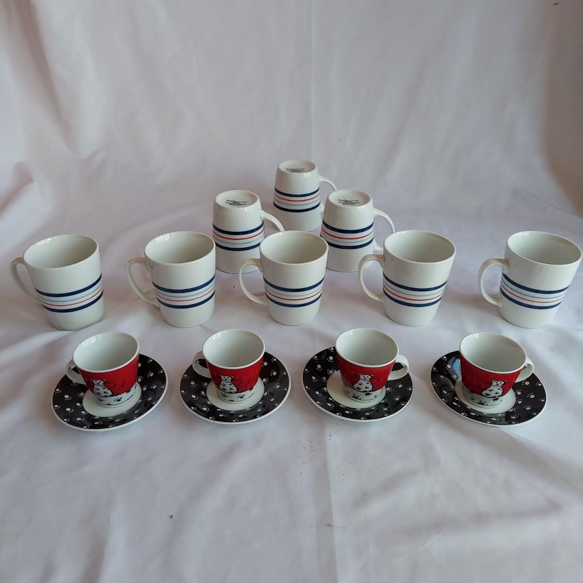 Thos lot includes four espresso cups and saucers. They're Red and Black with cats and paw prints. There are also eight Mainstays coffee mugs that are off white with red and blue stripes. Shipping available. Shipping heavy items can be costly. We suggest contacting our preferred local shipping provider, Postage Express, with dimensions and getting an estimate before bidding: (828) 670-5501or postageexpress@yahoo.com.