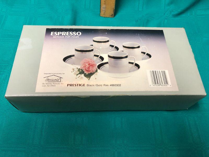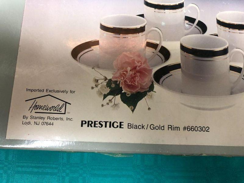 Espresso Demitasse set, new in box. black & white with gold "Prestige"