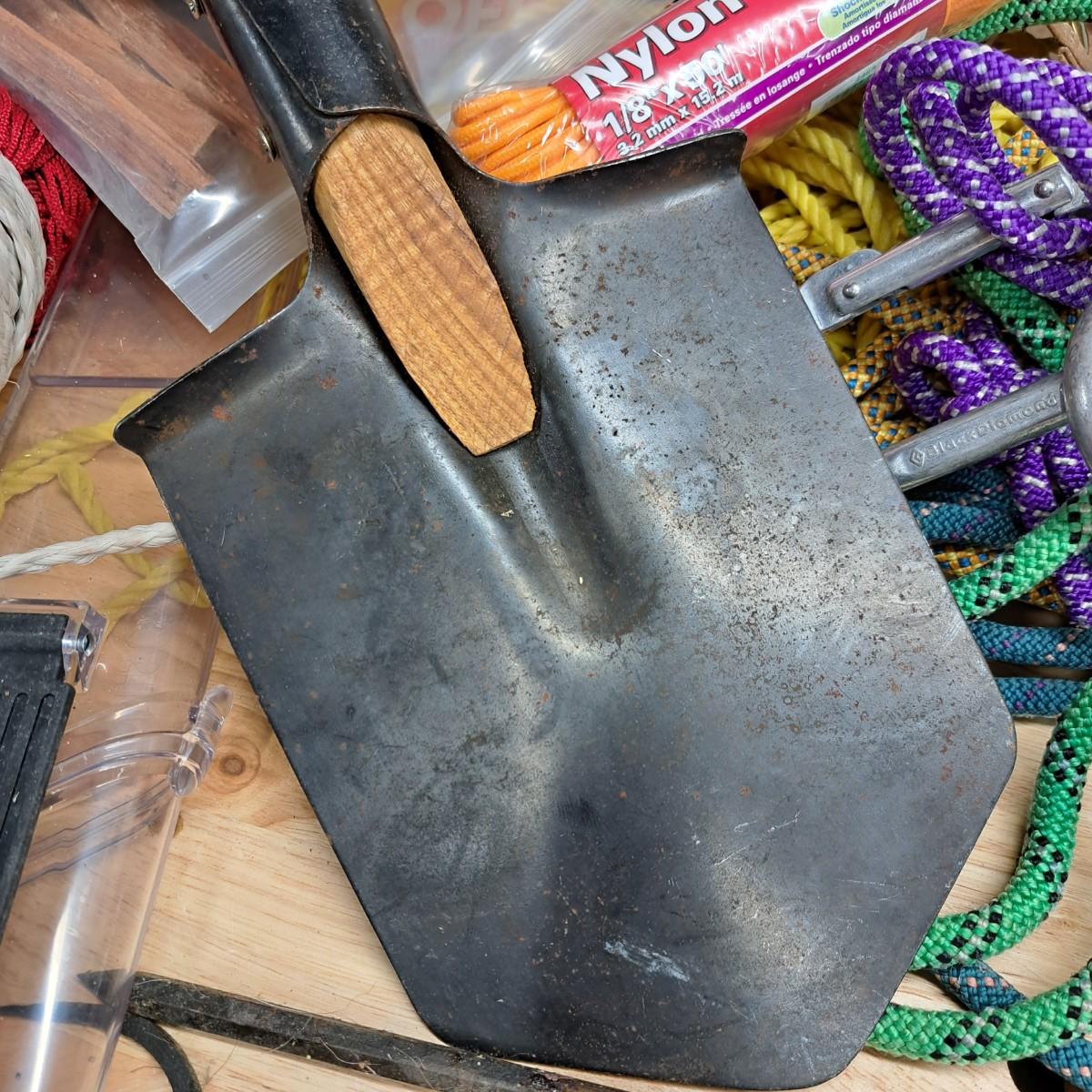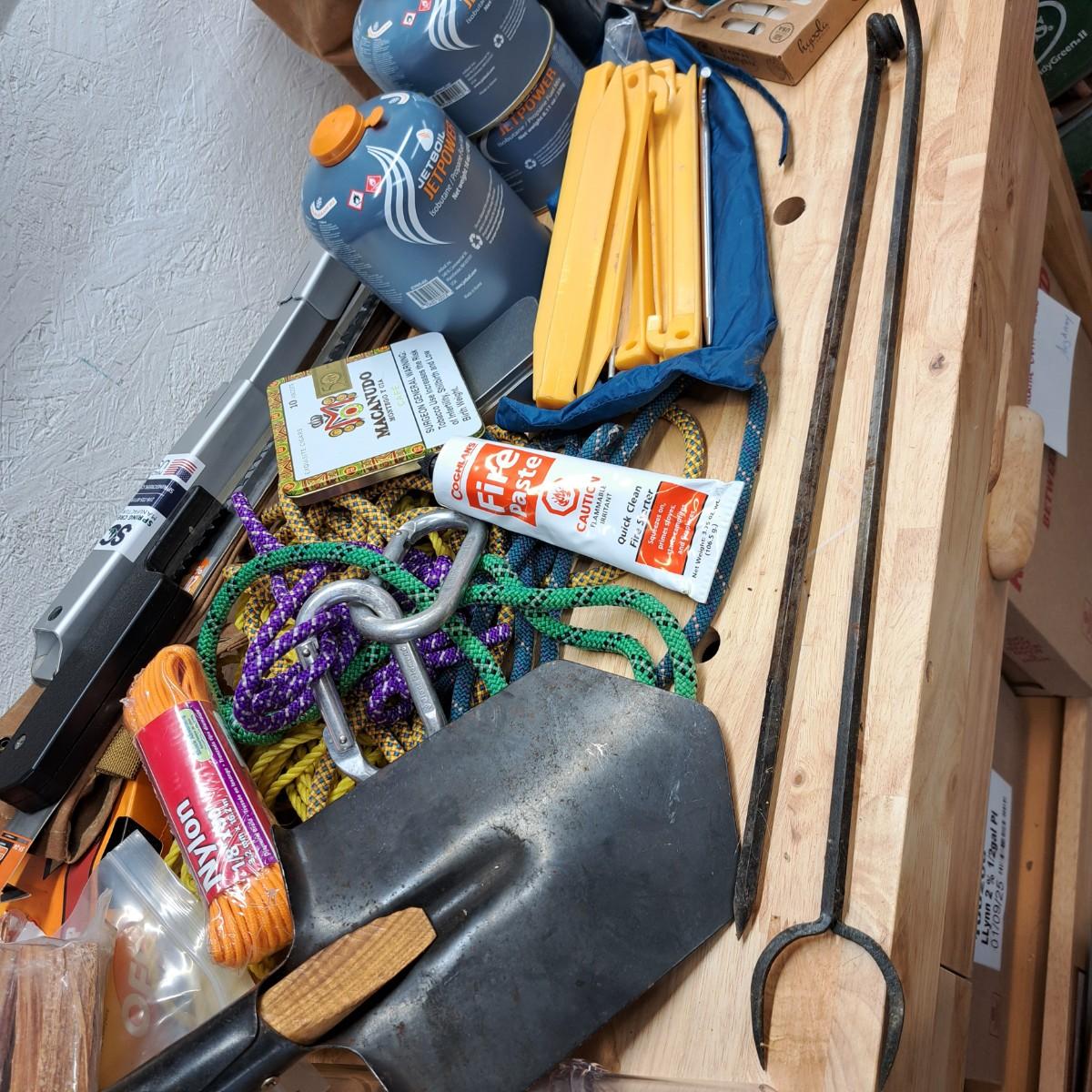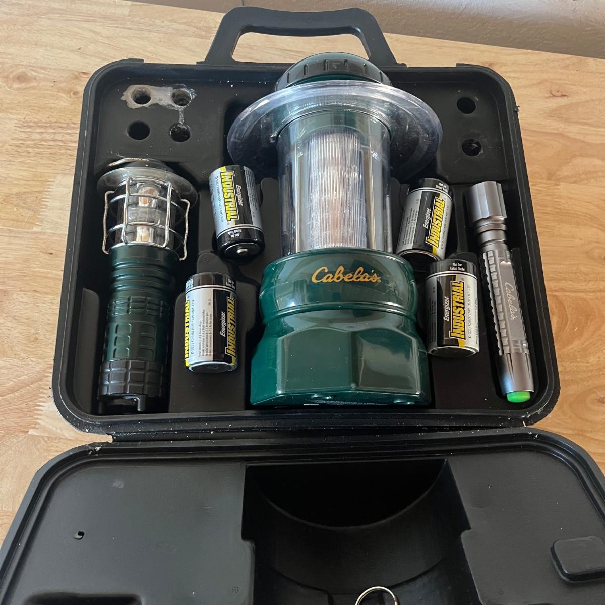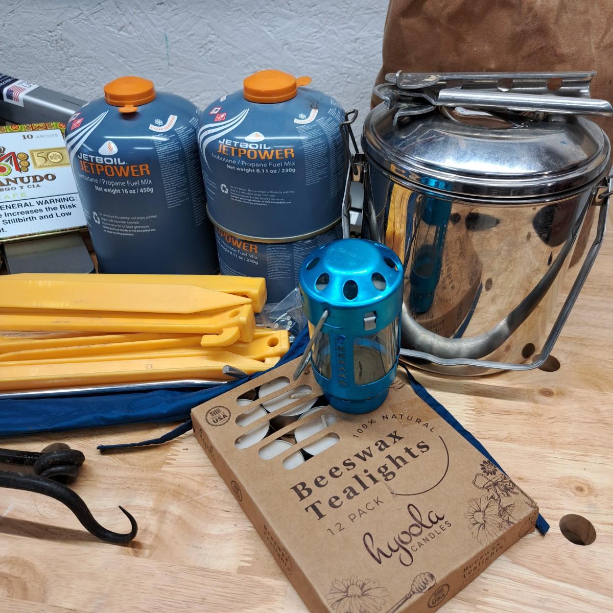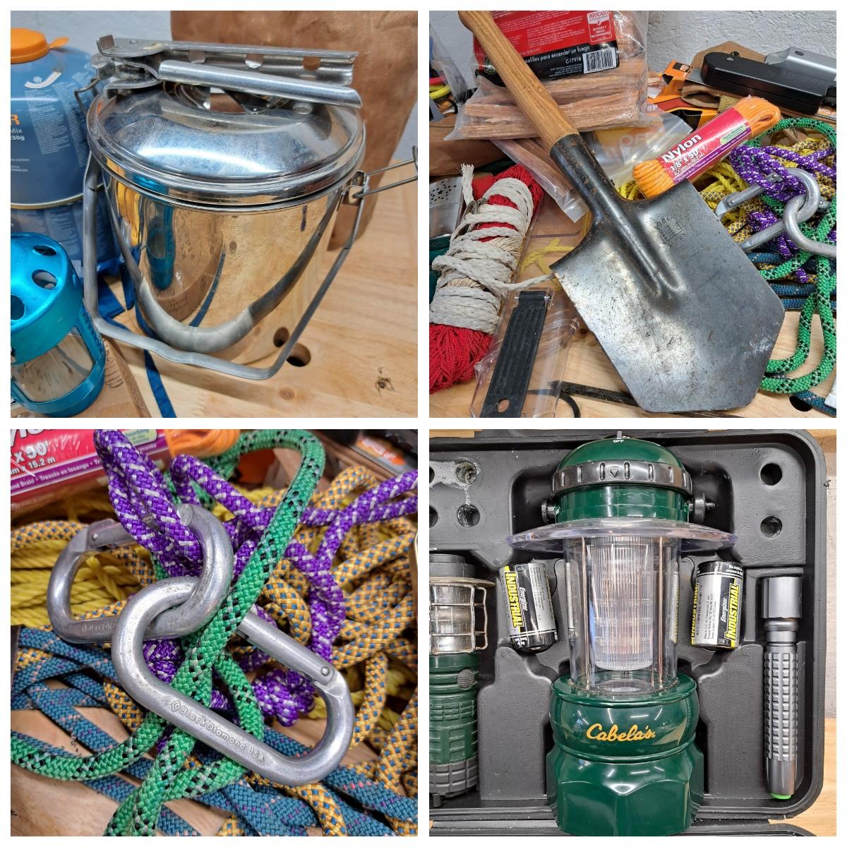 A lot of camping essentials for the avid camper! Includes a portable hand saw, aluminum camp pot, tealight lantern (*with box of beeswax tealight candles), detachable shovel, rope and climbing rope pieces and Black Diamond carabiners (2), bags of Fat Wood fire starters, bungees, clothespins, three vintage hand warmers, a pair of tooled iron fire picking tools -- and so much more. As an added bonus we are including a 12"H Cabela's battery operated lantern - including a mini lantern and flashlight - all in a handy plastic carrying case (was not tested).