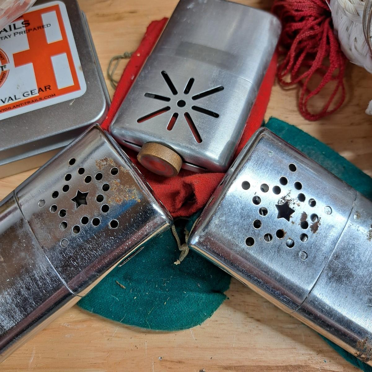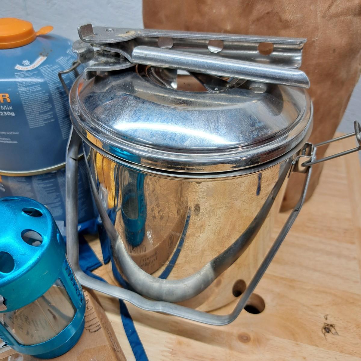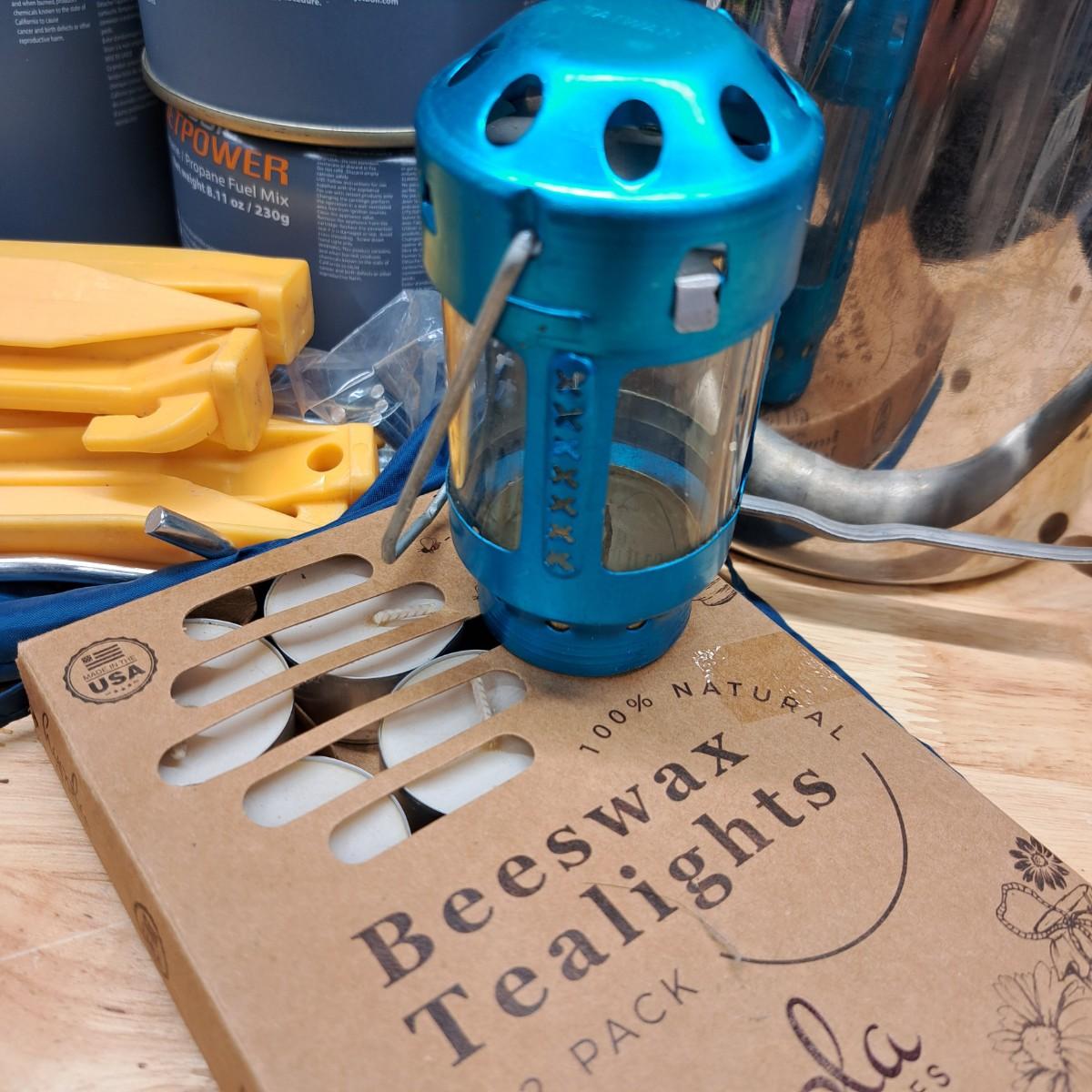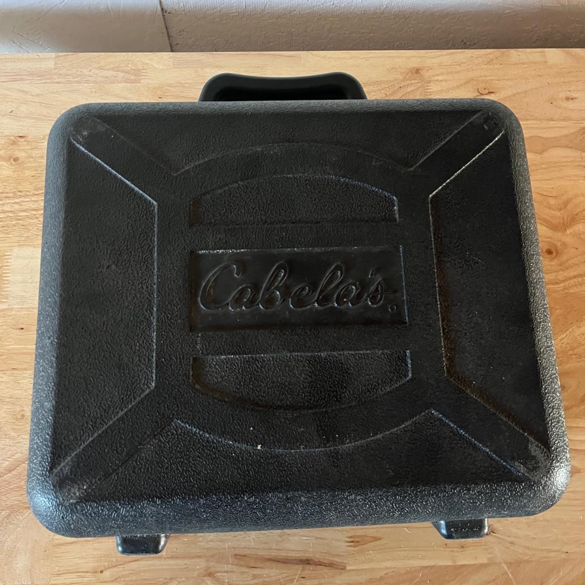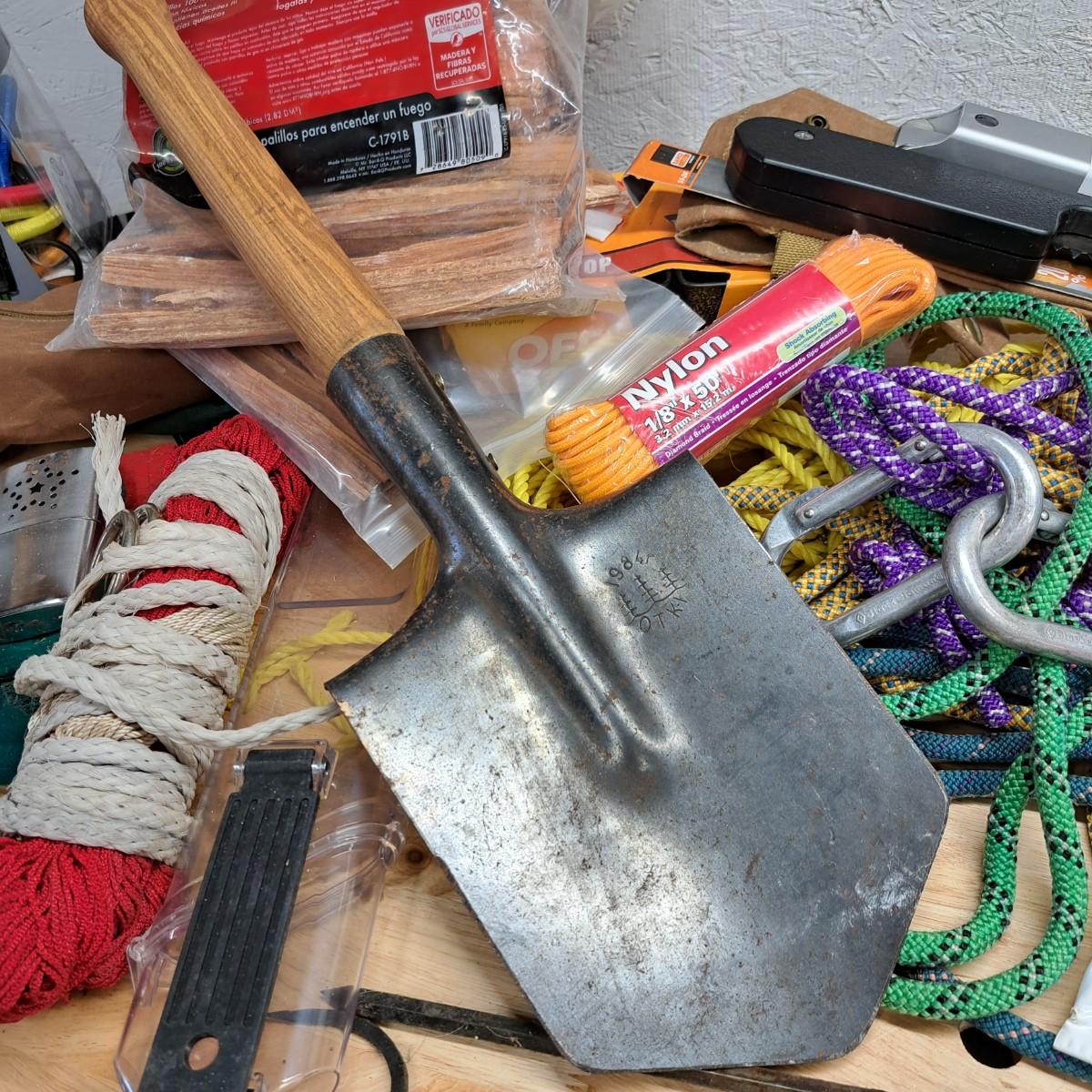 A lot of camping essentials for the avid camper! Includes a portable hand saw, aluminum camp pot, tealight lantern (*with box of beeswax tealight candles), detachable shovel, rope and climbing rope pieces and Black Diamond carabiners (2), bags of Fat Wood fire starters, bungees, clothespins, three vintage hand warmers, a pair of tooled iron fire picking tools -- and so much more. As an added bonus we are including a 12"H Cabela's battery operated lantern - including a mini lantern and flashlight - all in a handy plastic carrying case (was not tested).