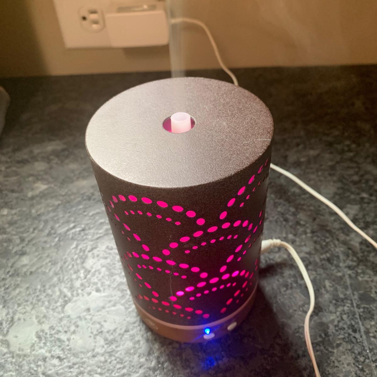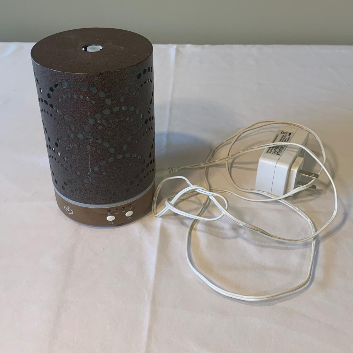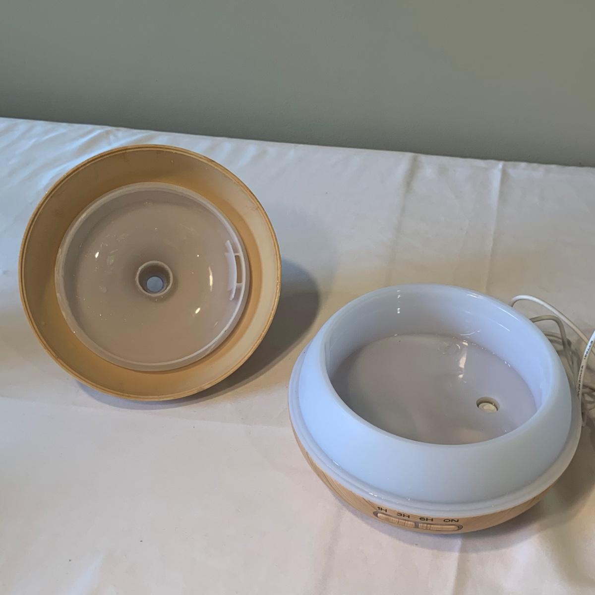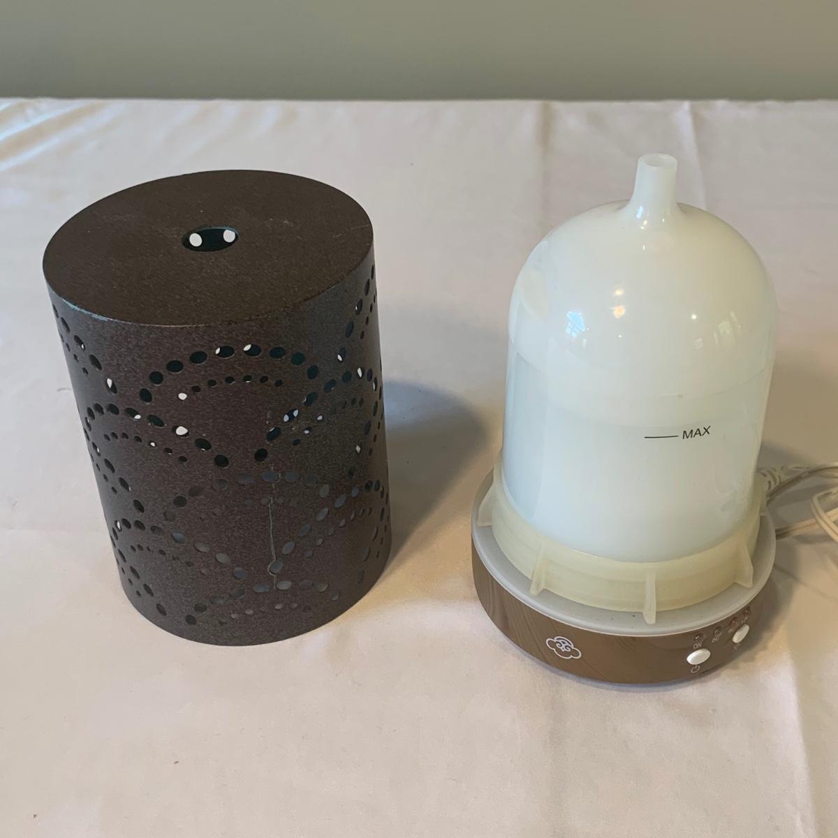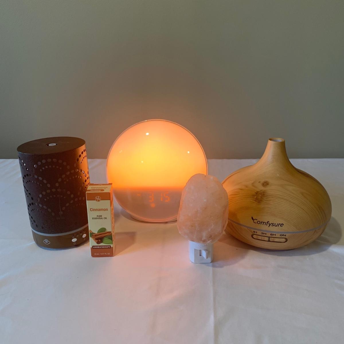 Keep a mellow mood in your home with these relaxing items. There are two essential oil diffusers. Both powered on and misted when plugged in. They both have color changing lights. The cylindrical diffuser is 3.5”D x 5.75”H. There is also an unopened cinnamon essential oil to go with the diffusers. Also included in this lot is a wake-up light alarm clock that will simulate the sunrise and sunset. It has gentle alarm sounds. And finally, a pink salt rock nightlight.