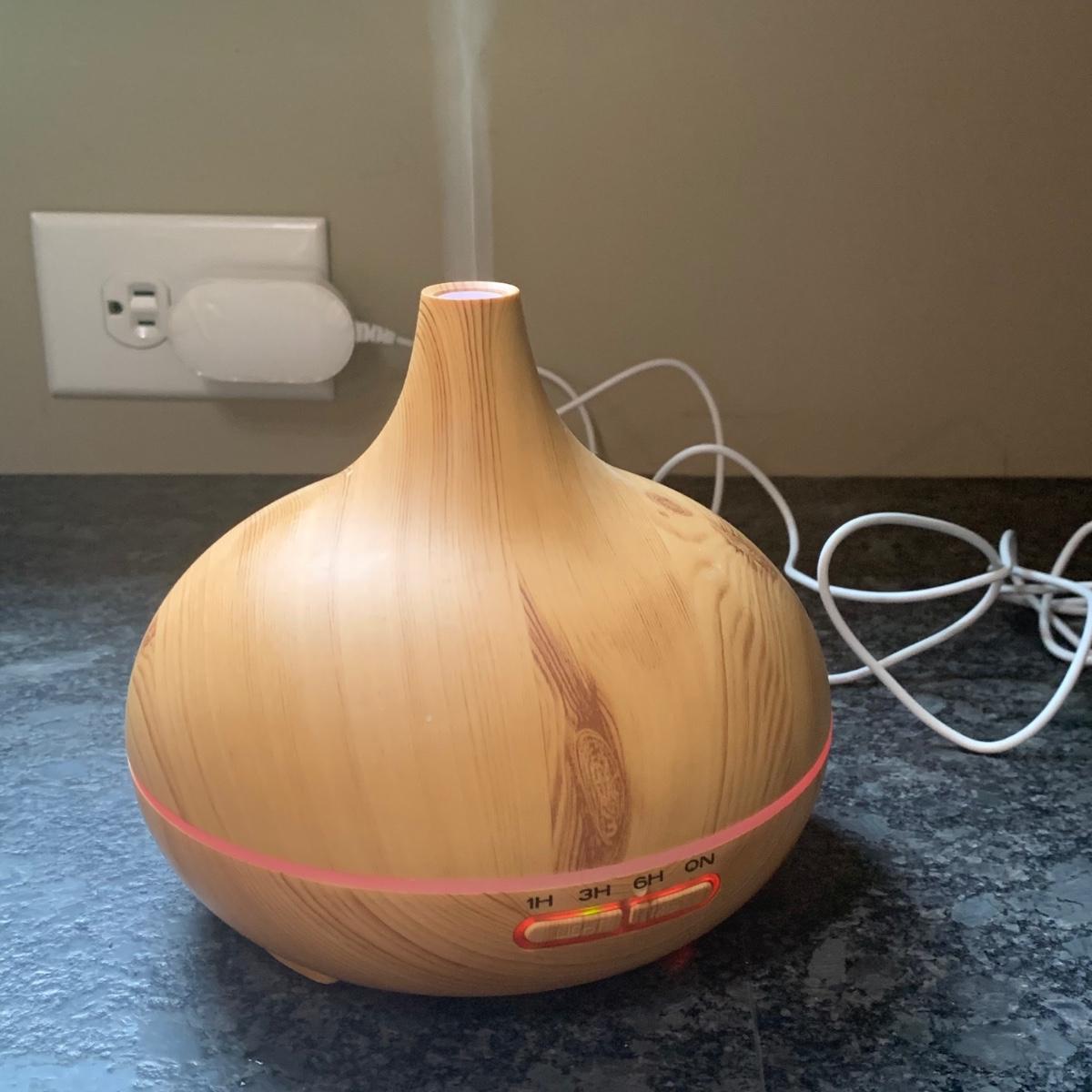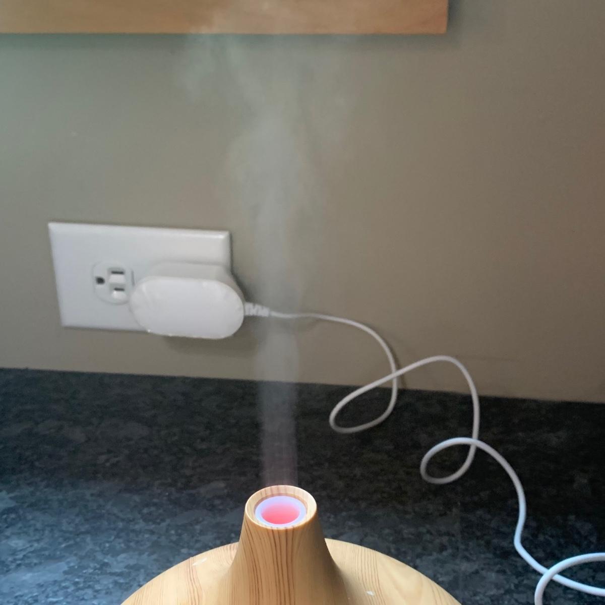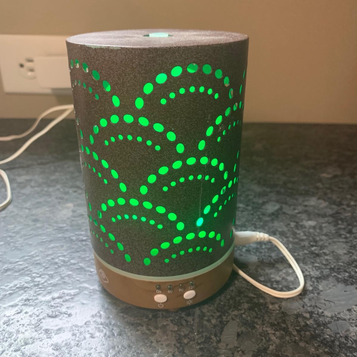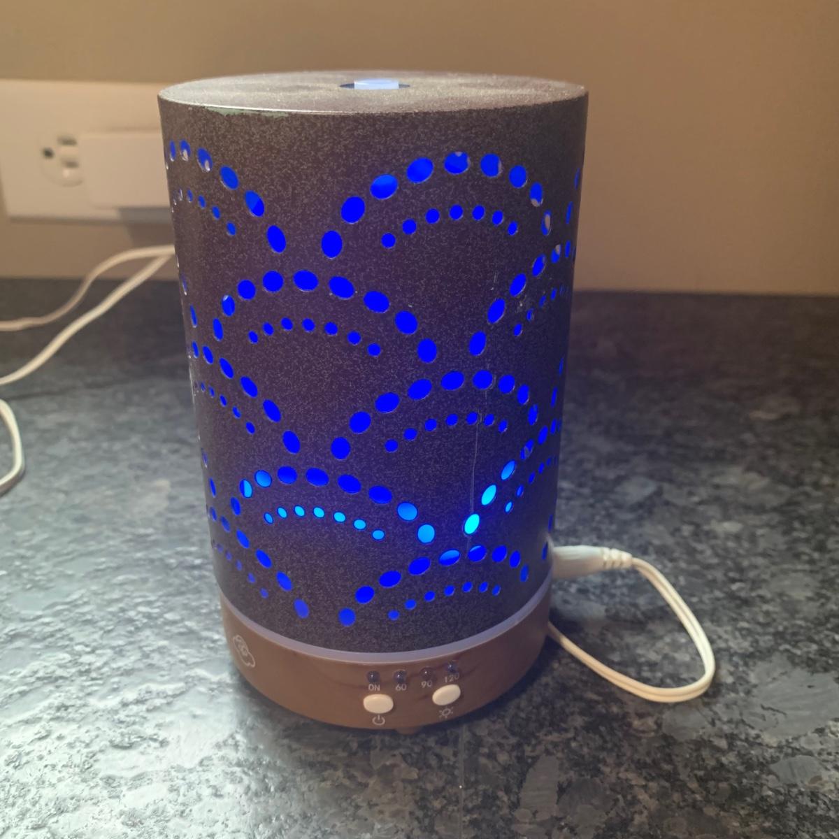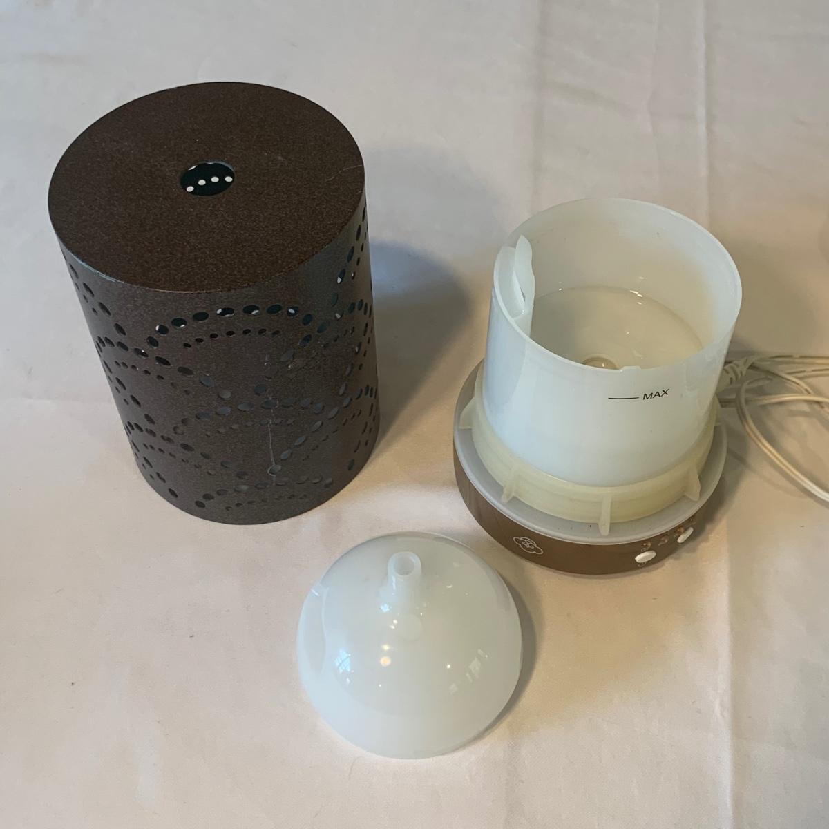 Keep a mellow mood in your home with these relaxing items. There are two essential oil diffusers. Both powered on and misted when plugged in. They both have color changing lights. The cylindrical diffuser is 3.5”D x 5.75”H. There is also an unopened cinnamon essential oil to go with the diffusers. Also included in this lot is a wake-up light alarm clock that will simulate the sunrise and sunset. It has gentle alarm sounds. And finally, a pink salt rock nightlight.