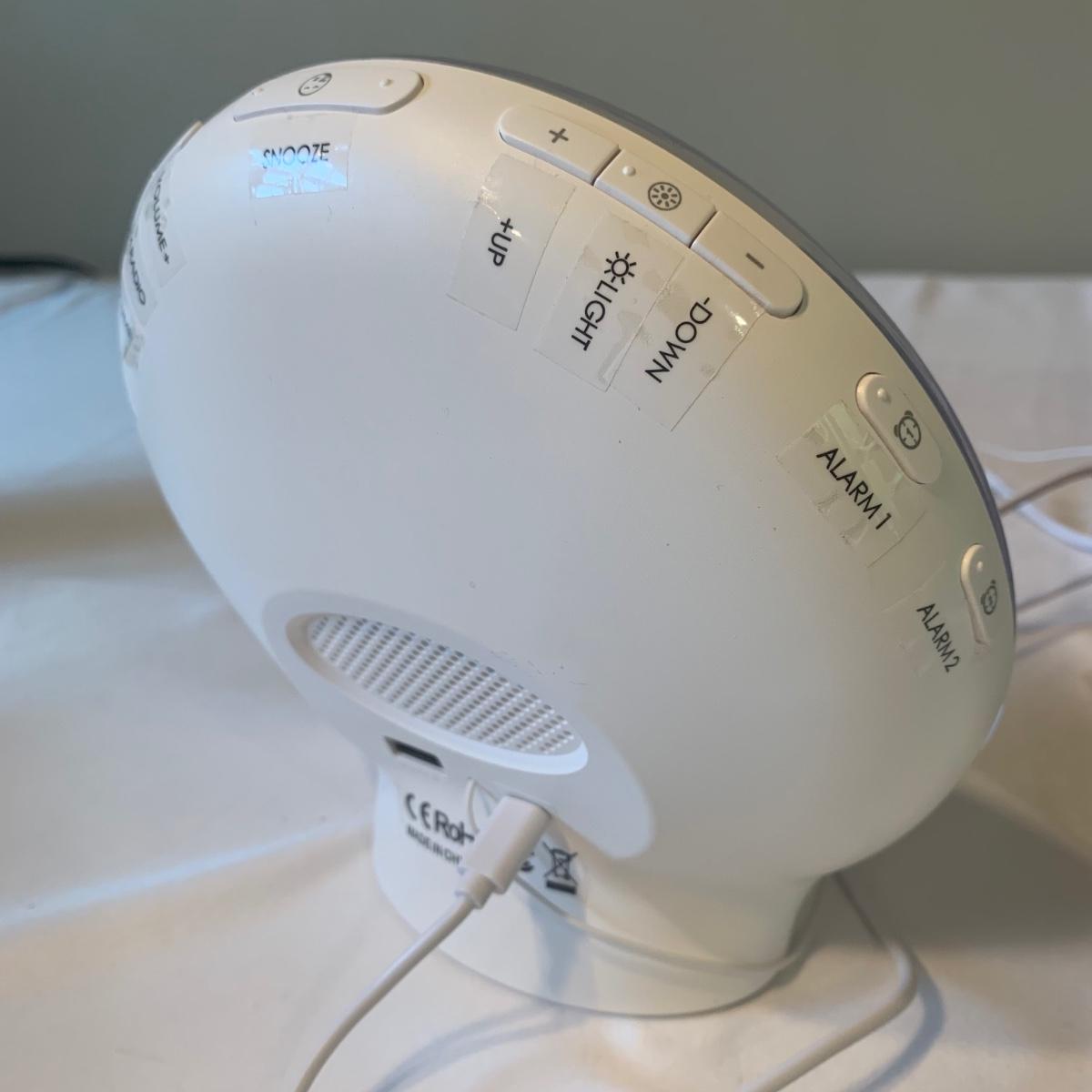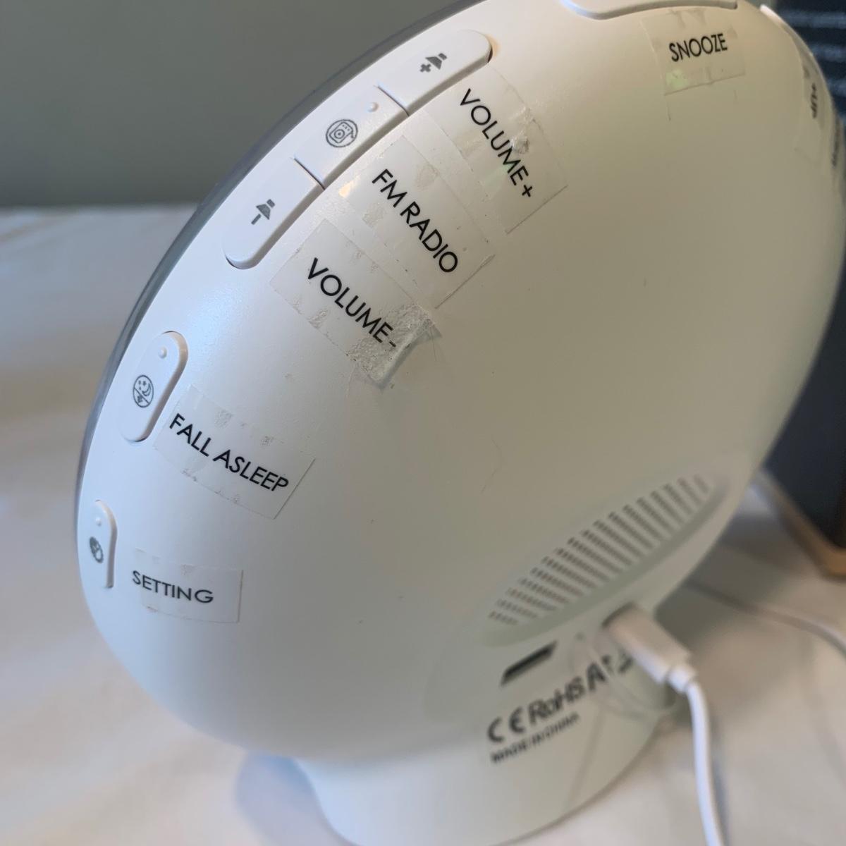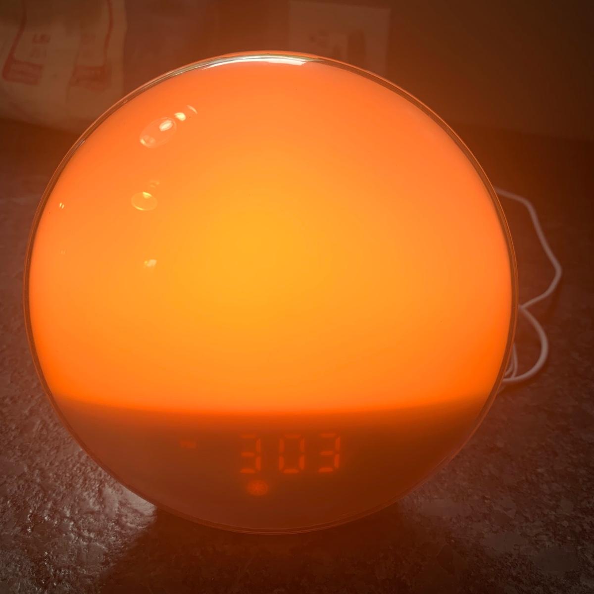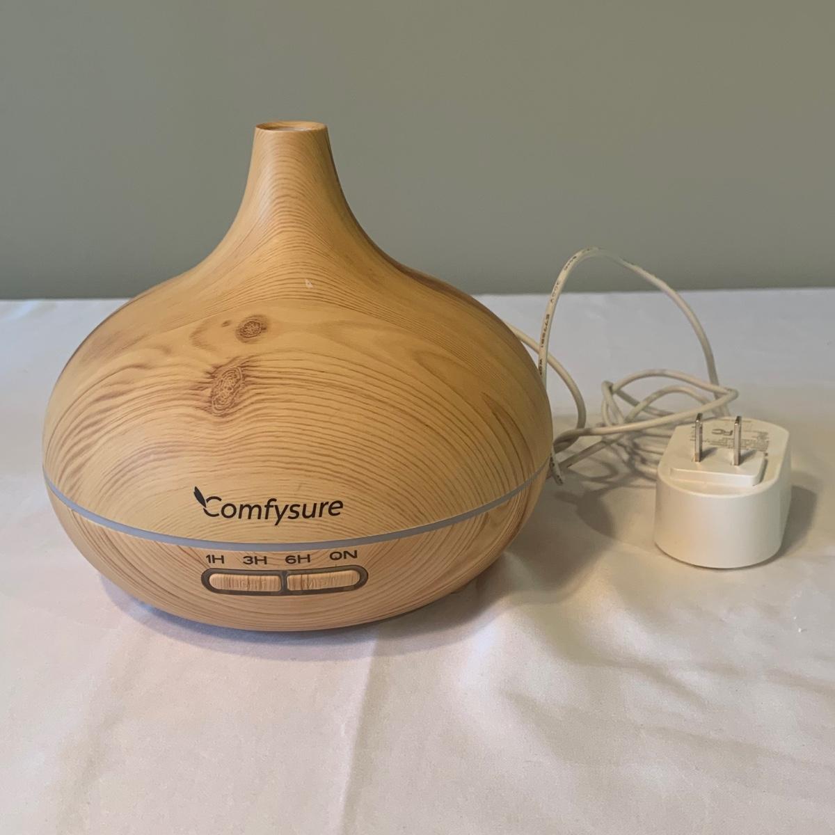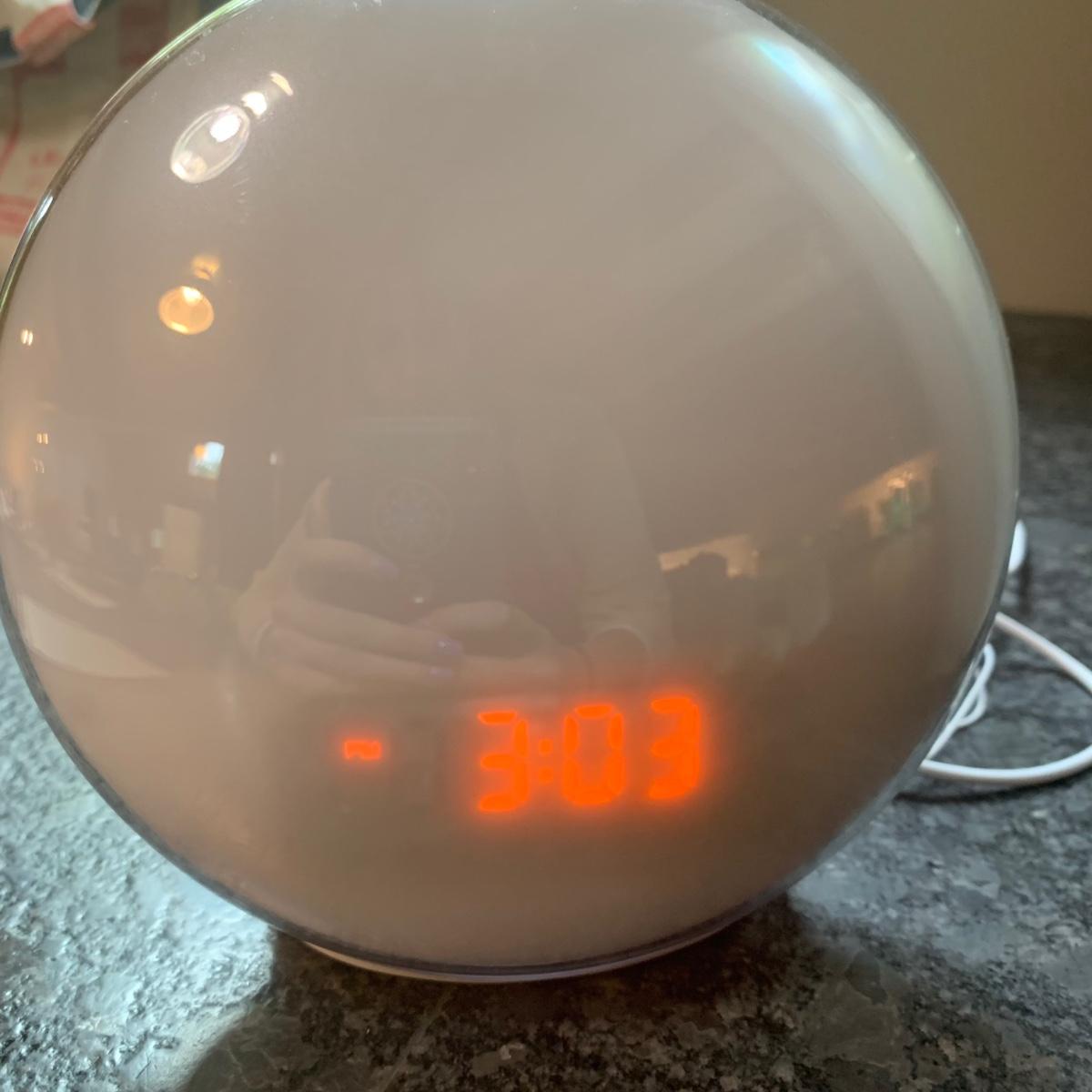 Keep a mellow mood in your home with these relaxing items. There are two essential oil diffusers. Both powered on and misted when plugged in. They both have color changing lights. The cylindrical diffuser is 3.5”D x 5.75”H. There is also an unopened cinnamon essential oil to go with the diffusers. Also included in this lot is a wake-up light alarm clock that will simulate the sunrise and sunset. It has gentle alarm sounds. And finally, a pink salt rock nightlight.