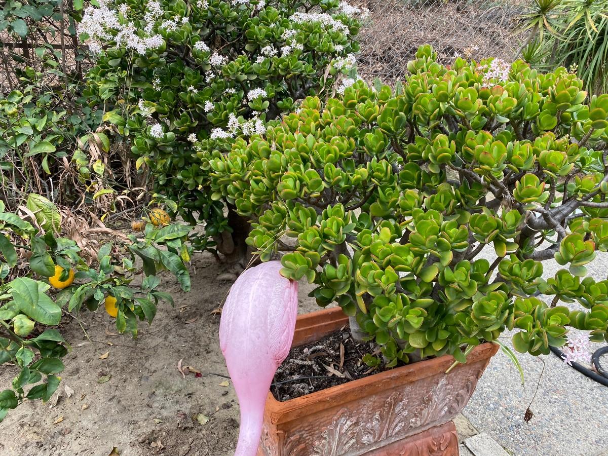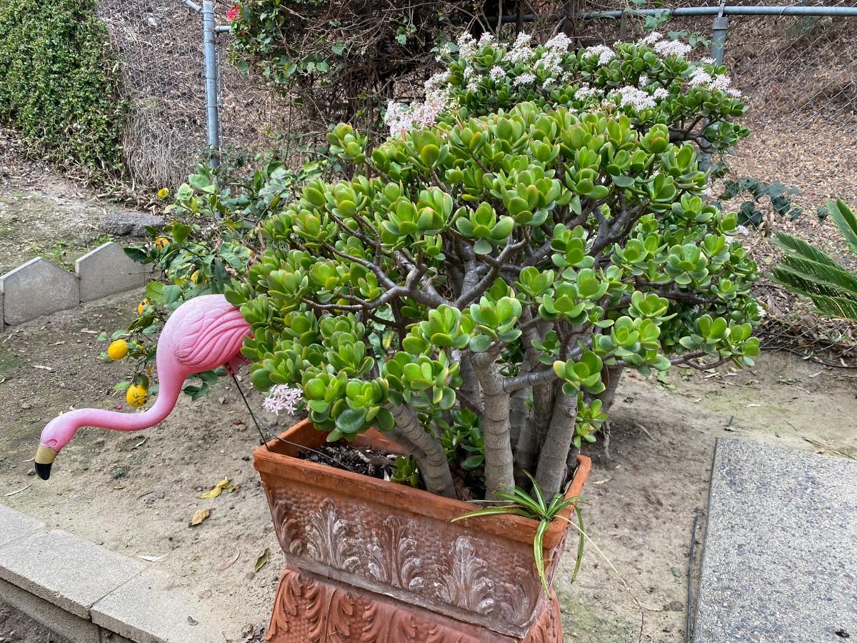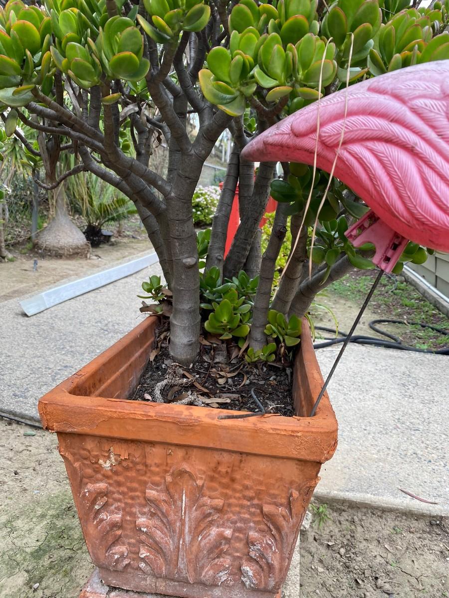Established Jade Tree with Clay Rectangle Planter and Pink Flamingo