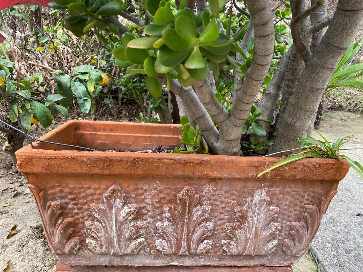 Established jade tree in a clay planter. Clay is weathered. Only the top planter is included in auction.