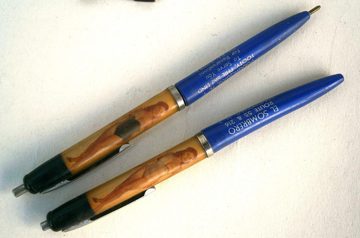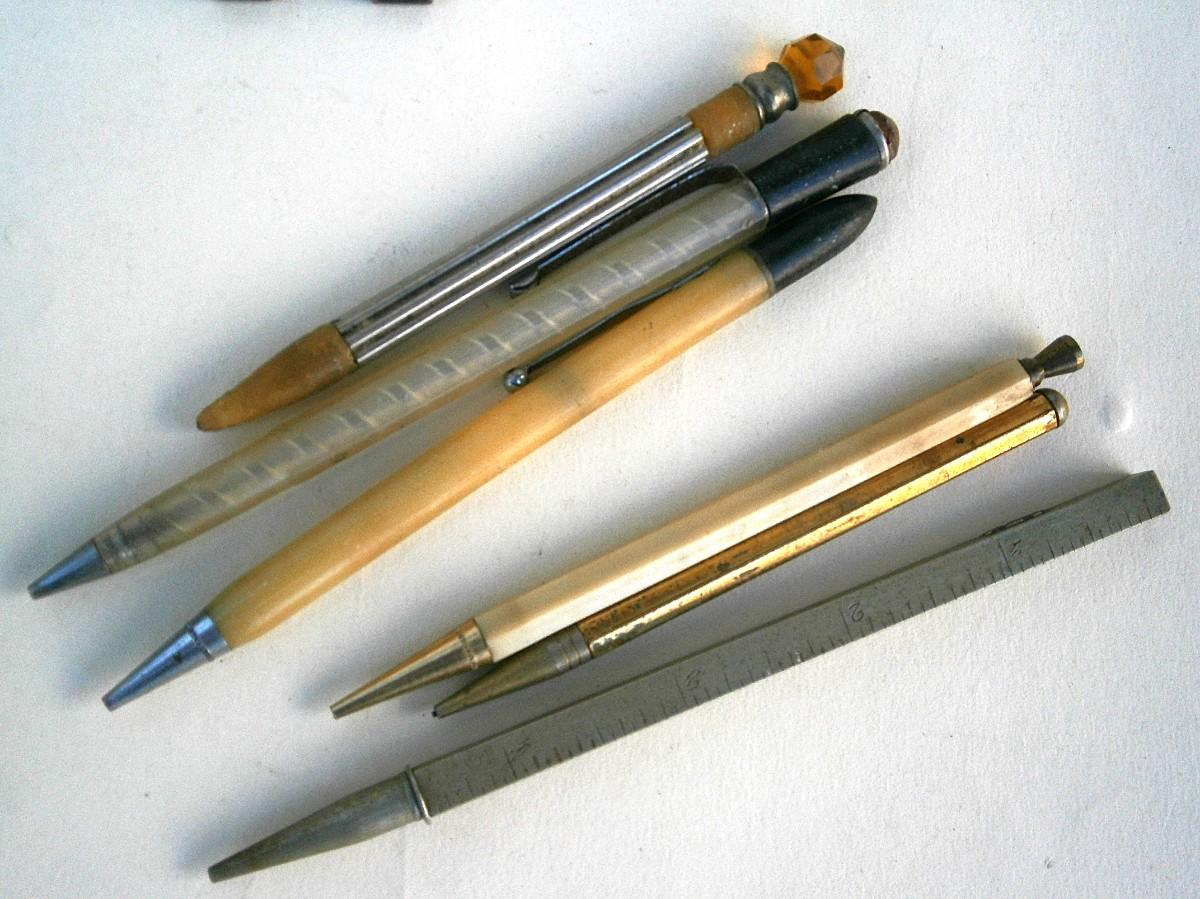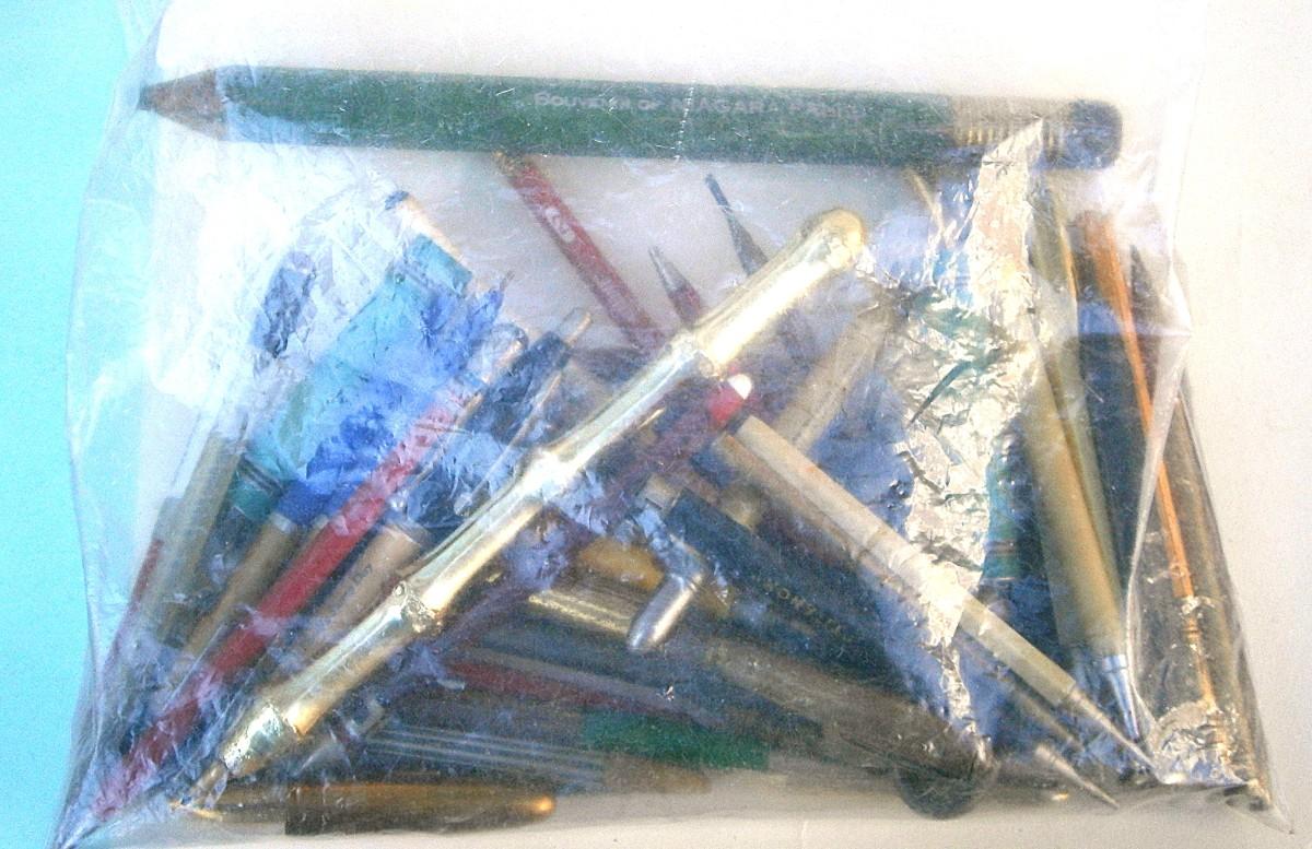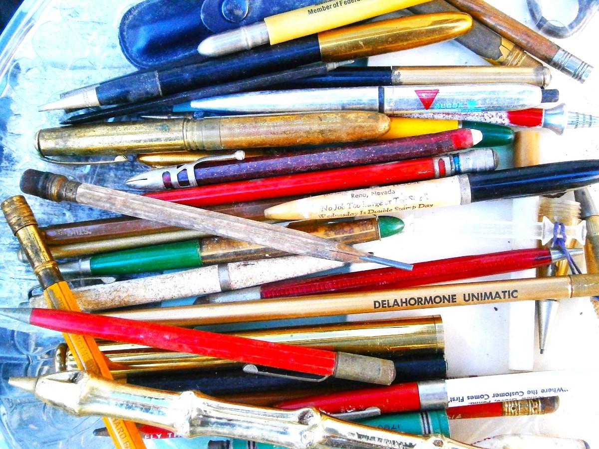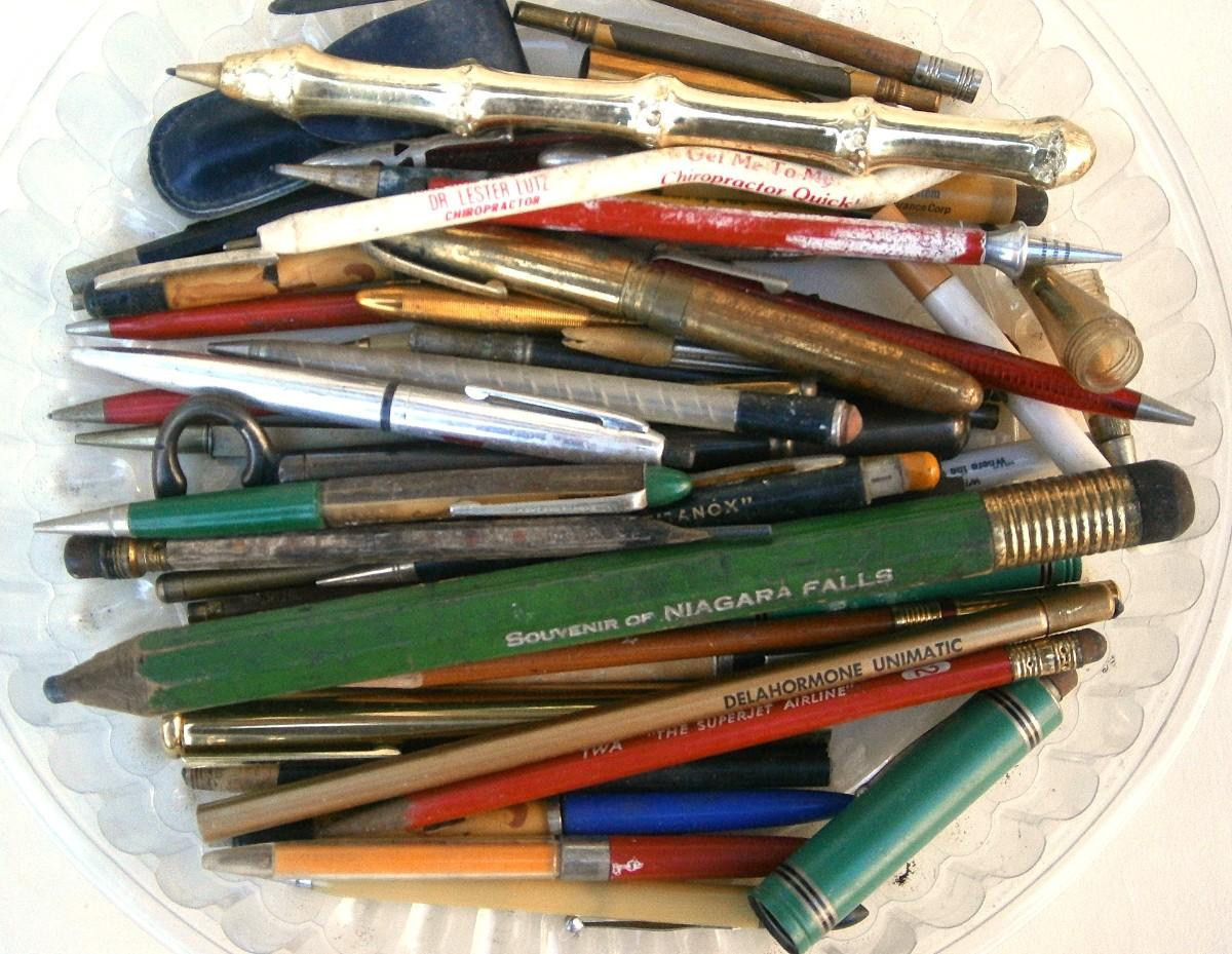 Estate accumulation of old pens and pencils. Includes many mechanical pencils, advertising pens, some interesting ones. Sold as found.