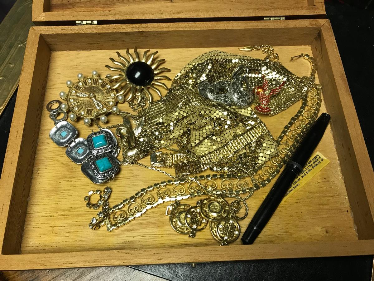 Cigar box contains estate jewelry etc