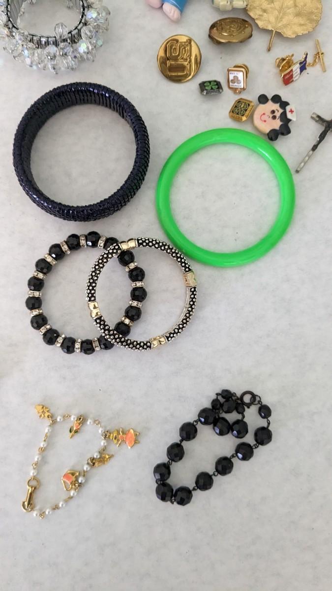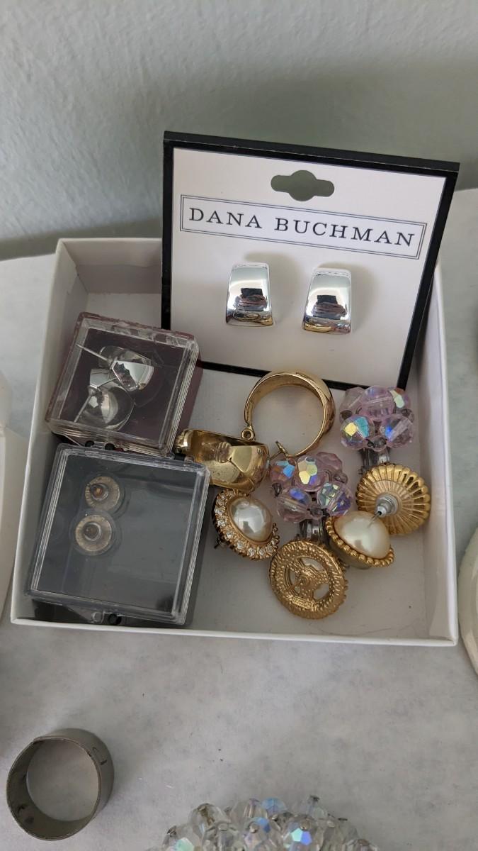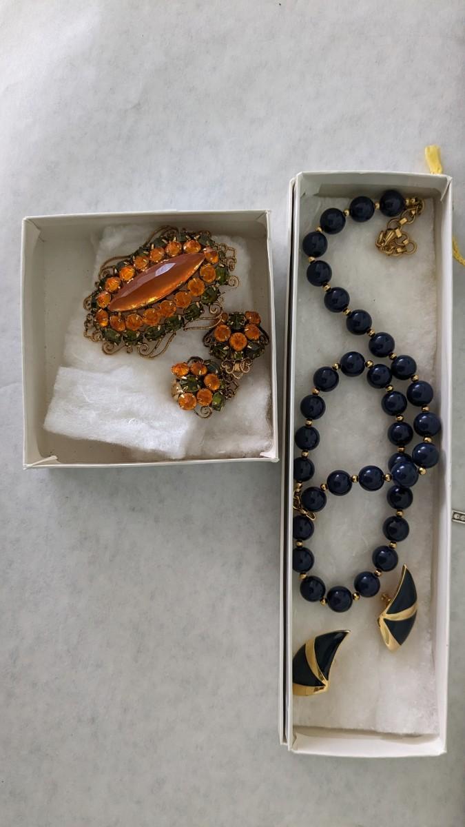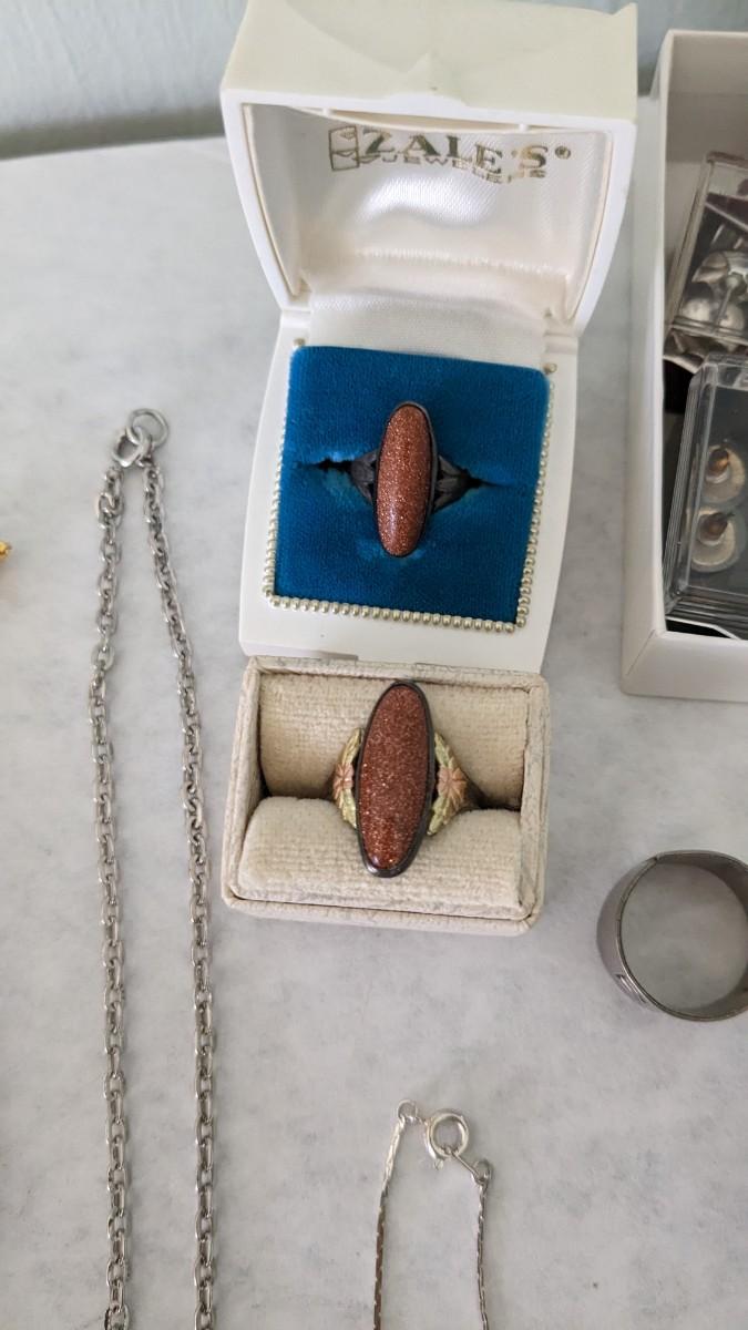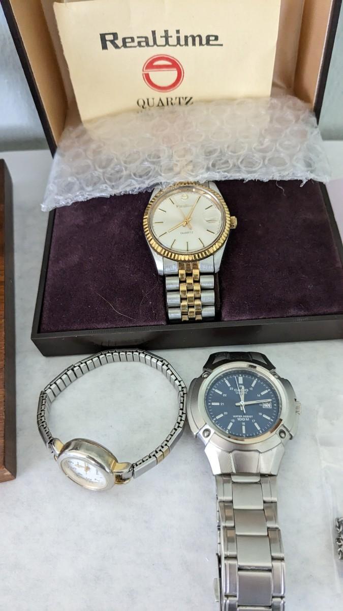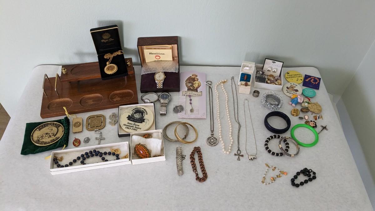 includes Realtime Quartz watch, new in box. Casio mens watch, Carriage women's watch. Costume jewelry sets, gold tone trifari and monet bangles, Catholic rosaries, beautiful goldstone deco rings, a stunning unmarked art deco chevron bracelet, varied necklaces, pendants, and earrings. As well as pins, brooches, and more!! A great little lot! box1