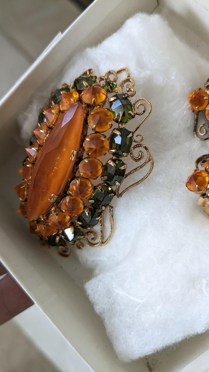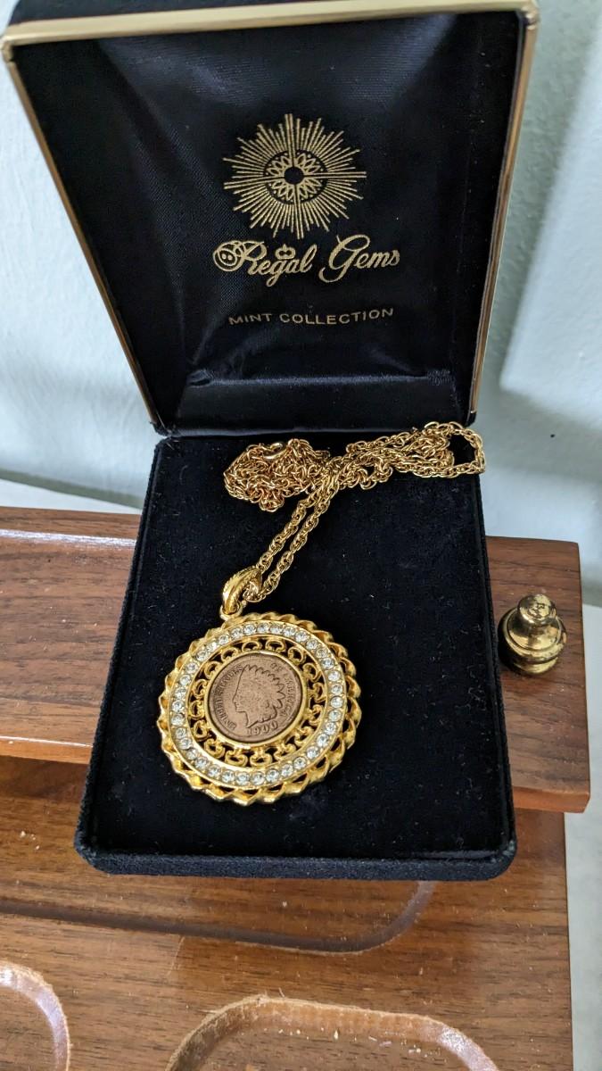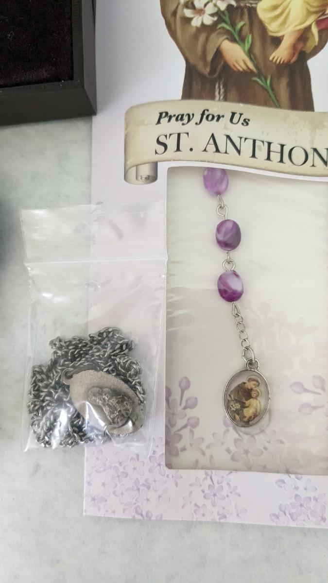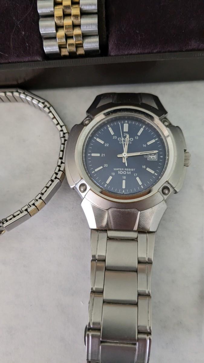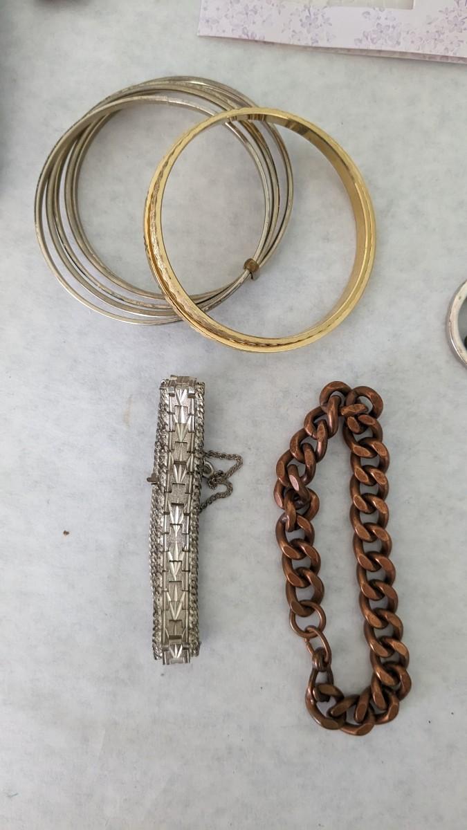 includes Realtime Quartz watch, new in box. Casio mens watch, Carriage women's watch. Costume jewelry sets, gold tone trifari and monet bangles, Catholic rosaries, beautiful goldstone deco rings, a stunning unmarked art deco chevron bracelet, varied necklaces, pendants, and earrings. As well as pins, brooches, and more!! A great little lot! box1