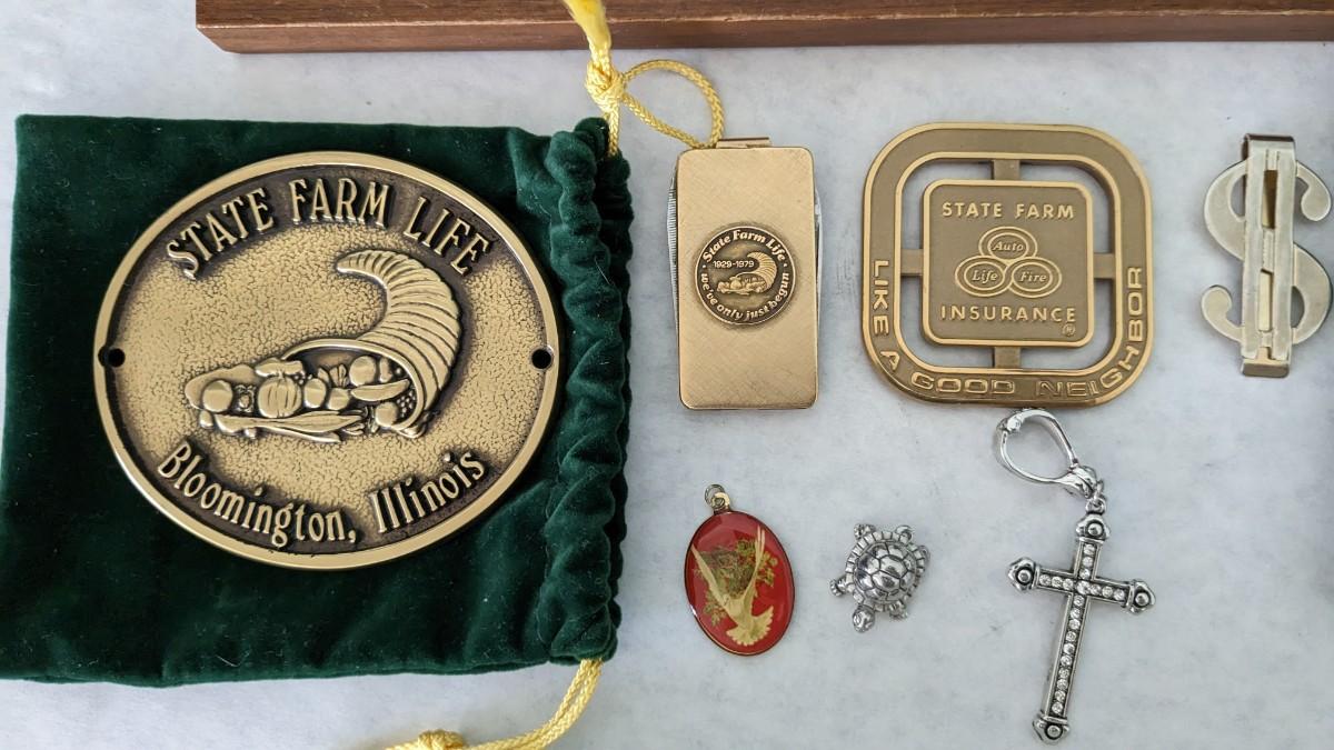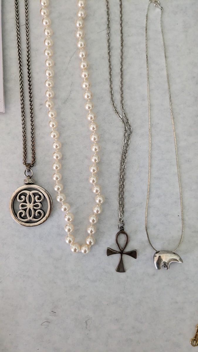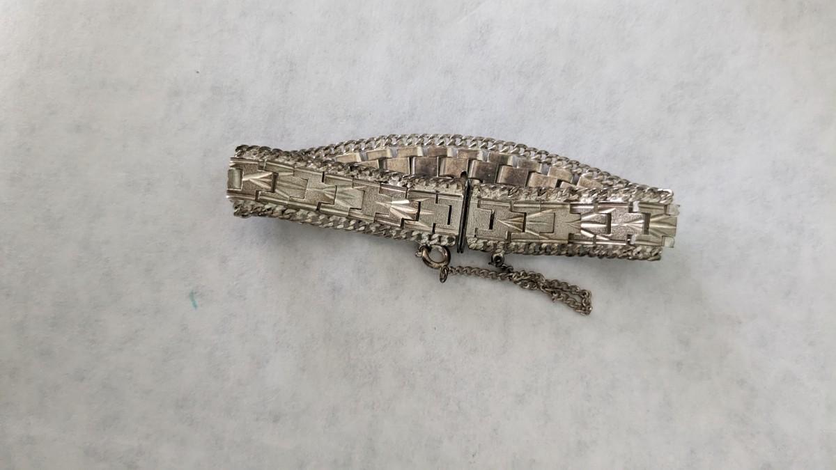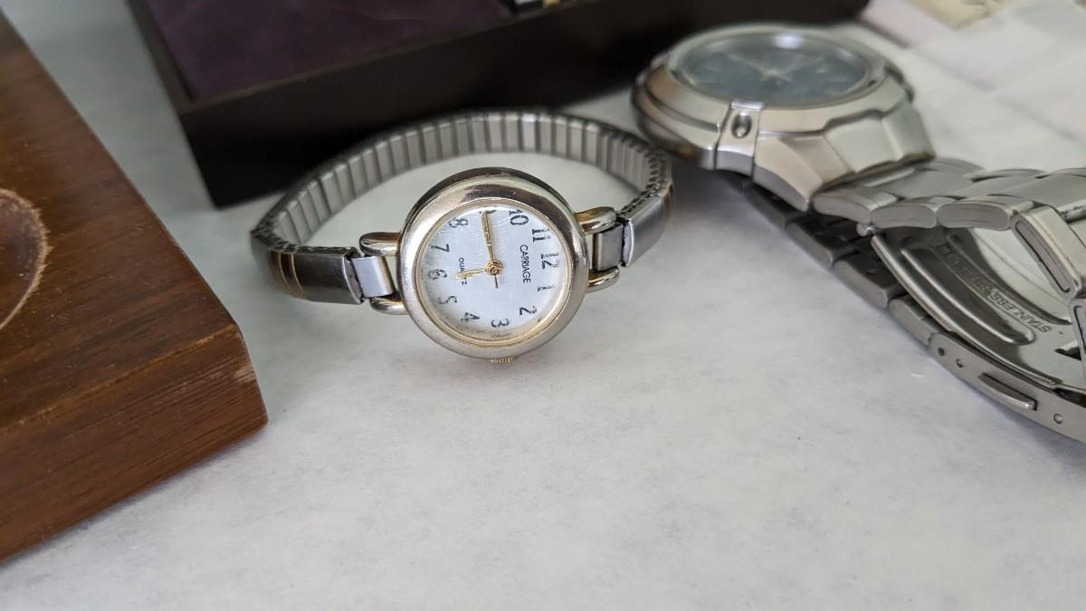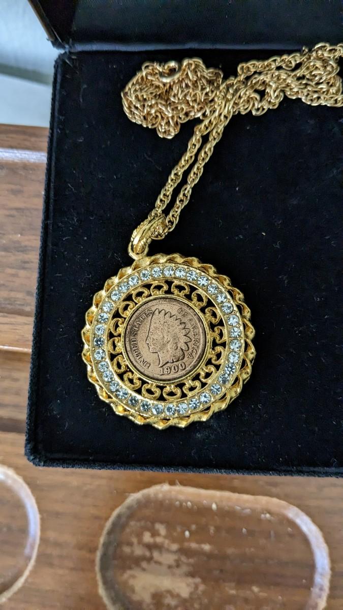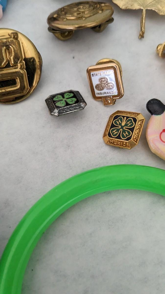 includes Realtime Quartz watch, new in box. Casio mens watch, Carriage women's watch. Costume jewelry sets, gold tone trifari and monet bangles, Catholic rosaries, beautiful goldstone deco rings, a stunning unmarked art deco chevron bracelet, varied necklaces, pendants, and earrings. As well as pins, brooches, and more!! A great little lot! box1