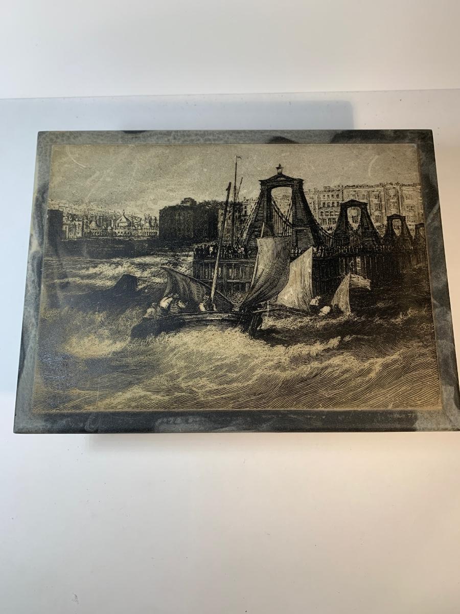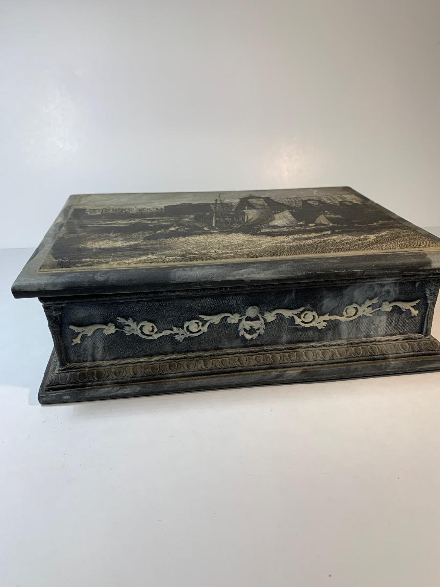 Beautiful estate fresh jewelry box made of inlaid stone and decorated with a coastal scene with ships