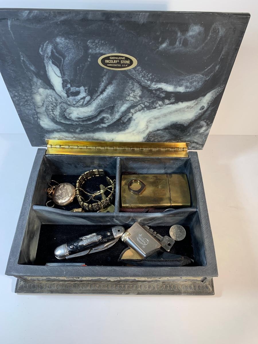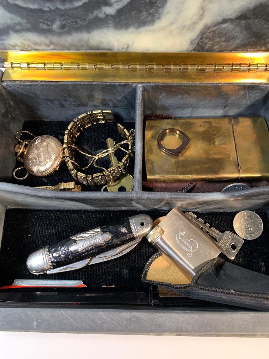 Interesting contents include Waltham pocket watch, perfume bottle and ww2 era container
