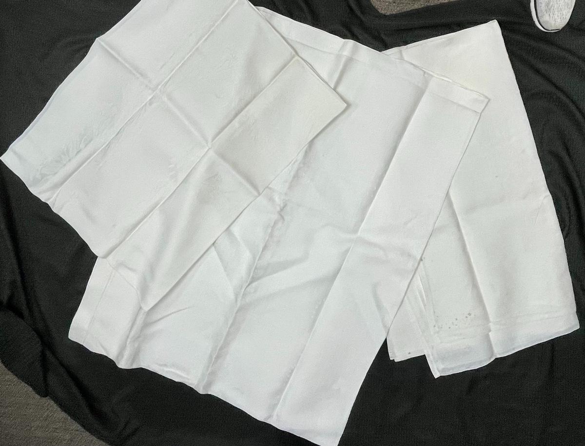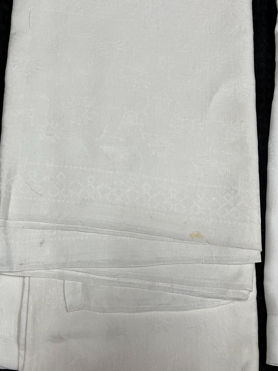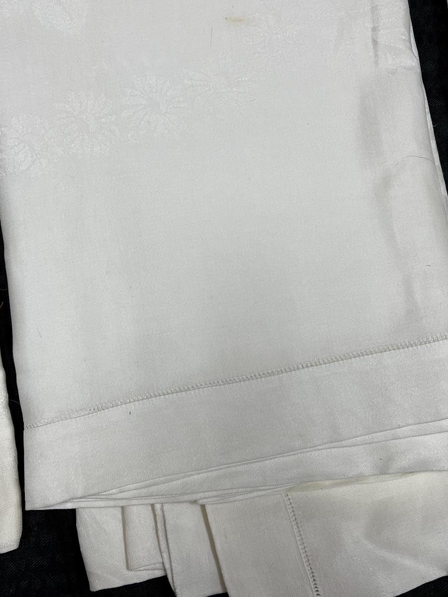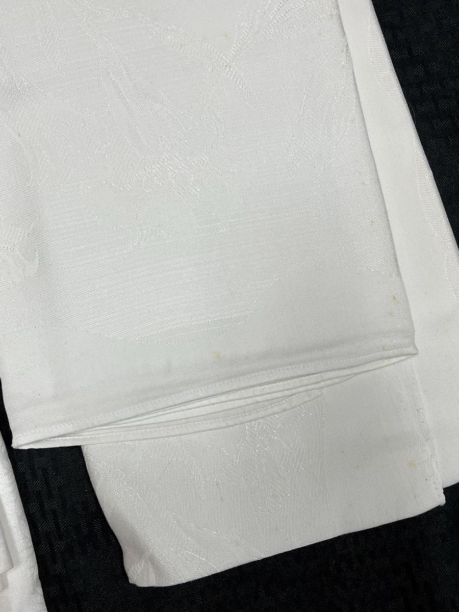 Vintage Lot of Fine Cotton White Linen Tablecloths, there are no significant rips or tears to the tablecloths, but there are some minor stains. Each of the tablecloths have some floral brocade pattern. The two largest tablecloth measures 75" X 144" and the smallest measures 60" X 72." Check pictures for more details.