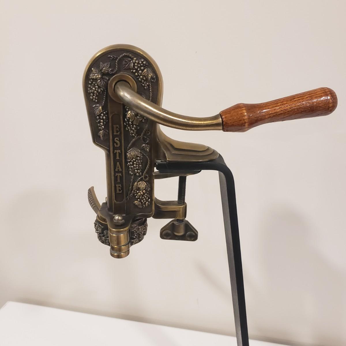 This heavy duty wine opener is made by Estate. The opener is made of metal with a wooden base. Opener measures 12" x 7" x 24"H.