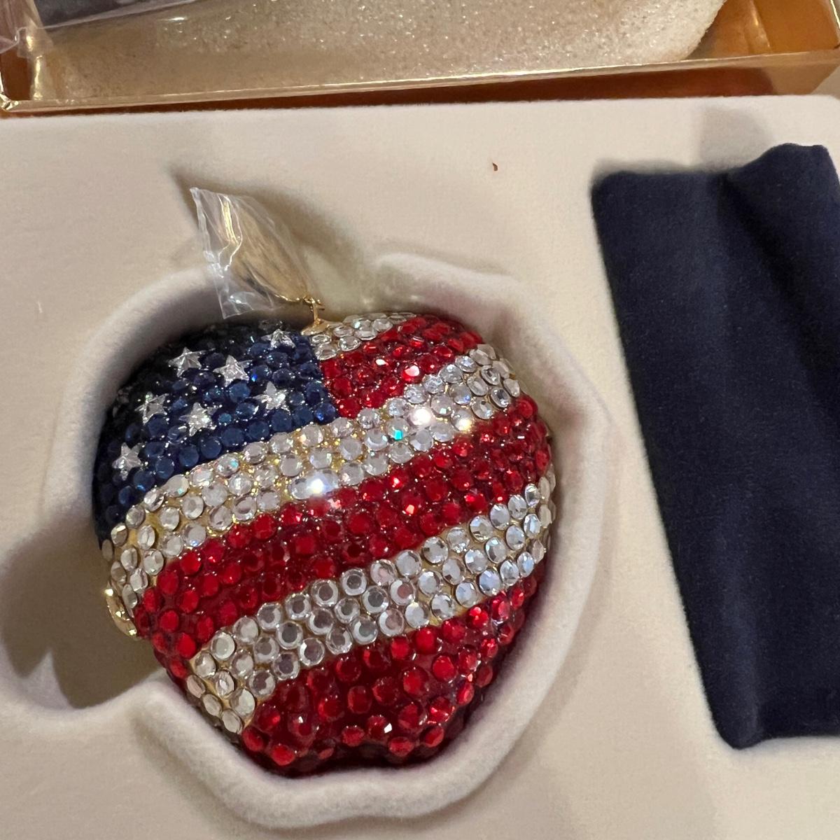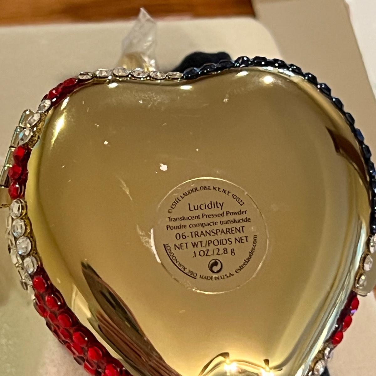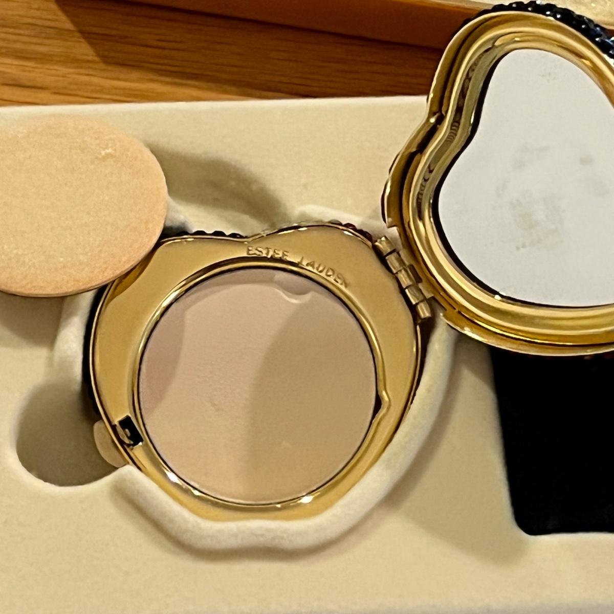 New in box rhinestone powder compact with black velvet carry case. See close up of powder - has small chip. Does not look to be used but decide for yourself. The leaf on the apple is still wrapped in plastic. Plus set 3 Estee Lauder makeup brushes.