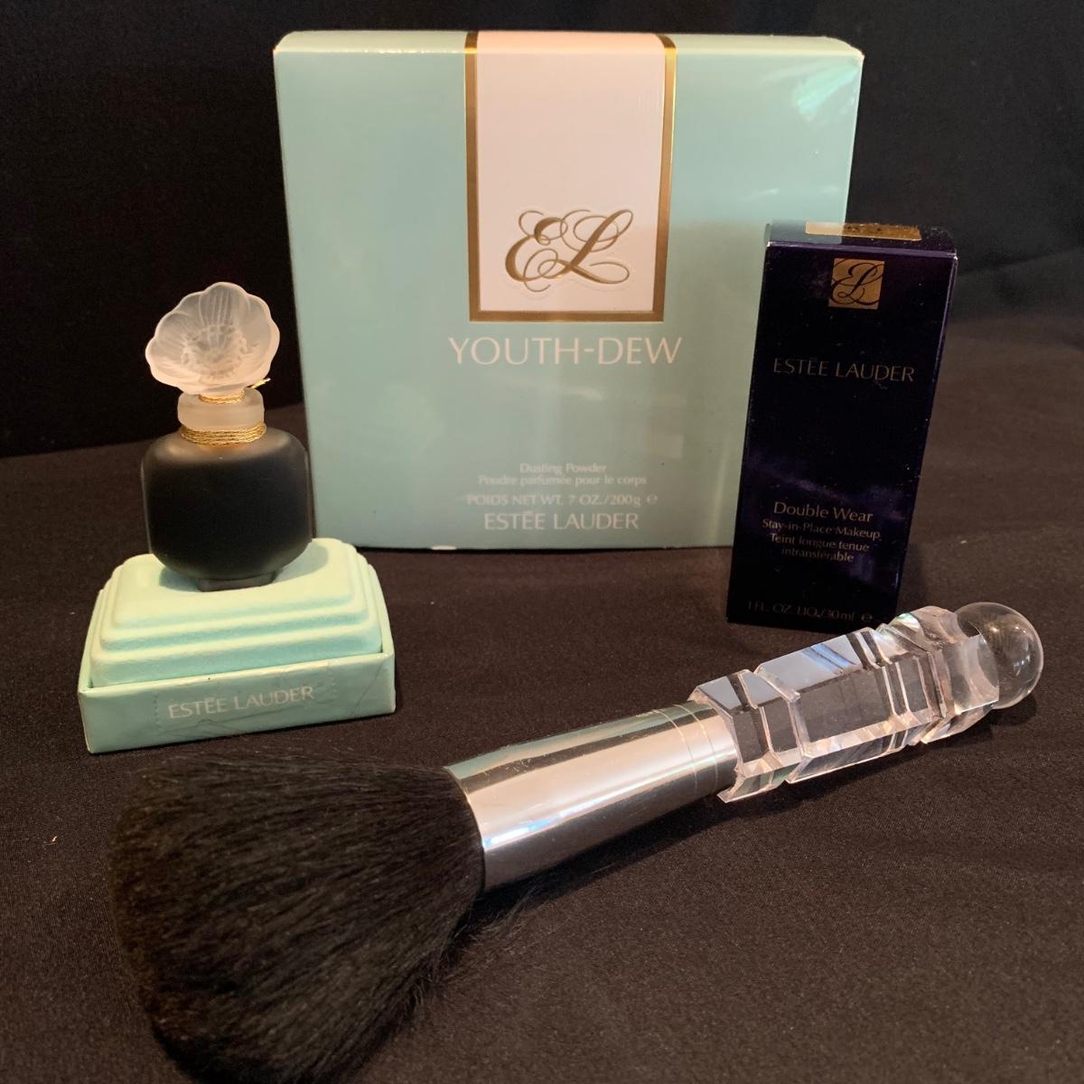 Large selection of Estèe Lauder Youth-Dew beauty products. Lot includes three body powders, vile of bath oil, cylinder of dust powder, Youth-dew perfume, and more. Please note that perfume and cylinder of powder have been used. We cannot guarantee that contents of items are as advertised. Largest box measures, 5” x 2” x 5”H. Shipping available.