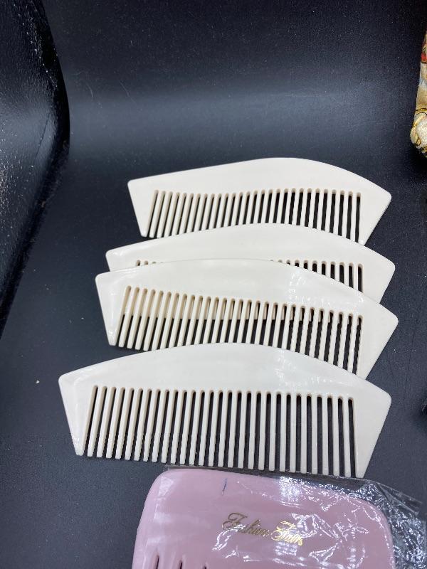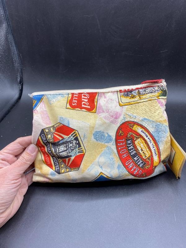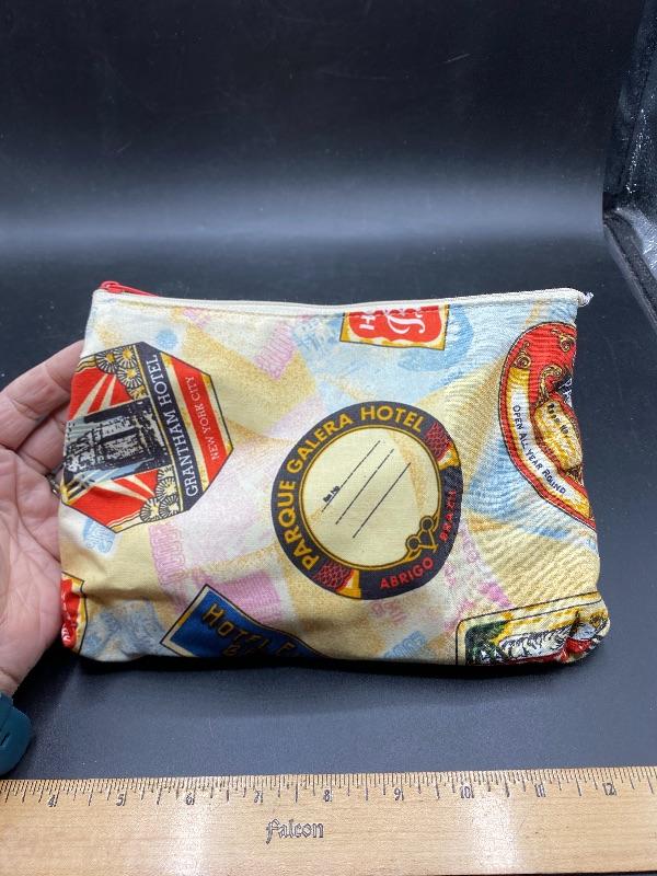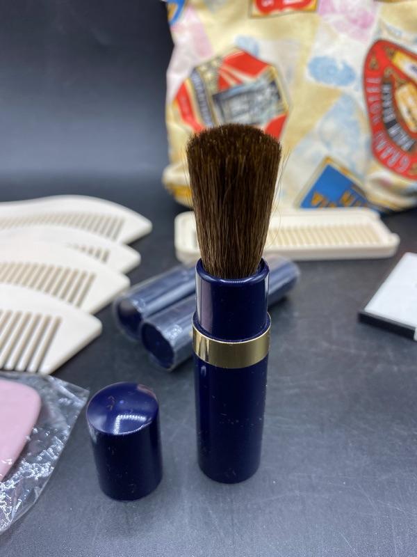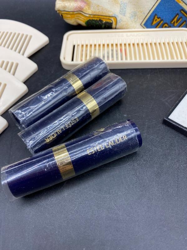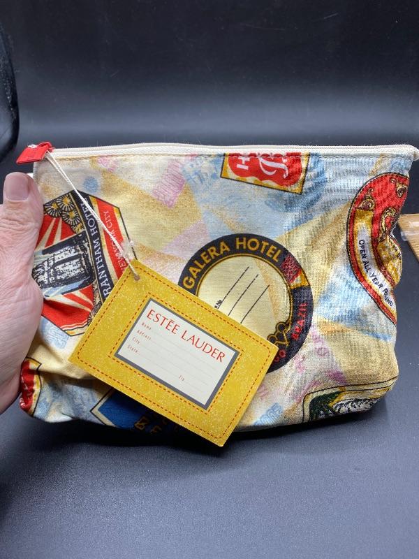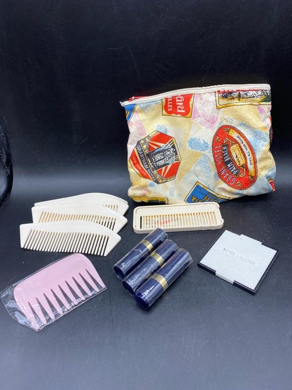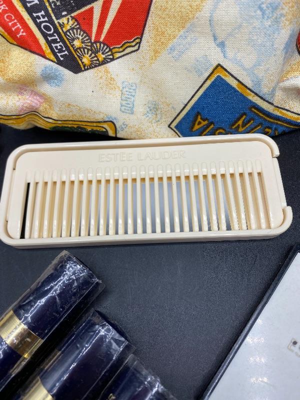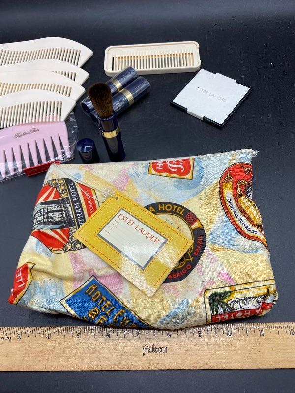 Estee Lauder cosmetic bag with accessories. Everything is new, unused. Bag has a travel theme to it. Comes with combs, mirrors, retractable blush brushes. One come is a vintage Fashion Fair pick style comb.