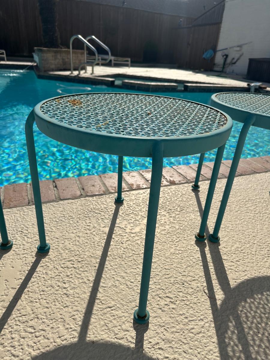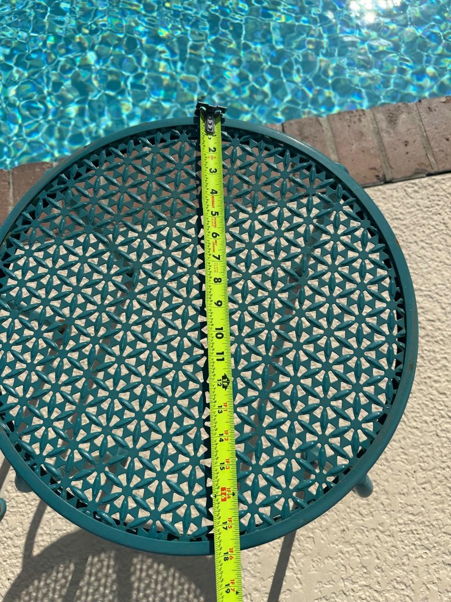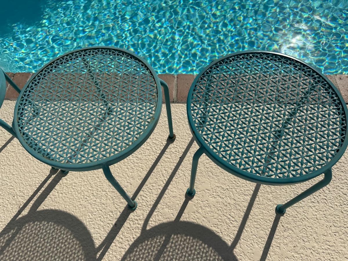 Set of metal outdoor side tables with pierced tops and teal finish. Show surface wear, rust spots, and staining consistent with outdoor use (see photos). Structurally solid.