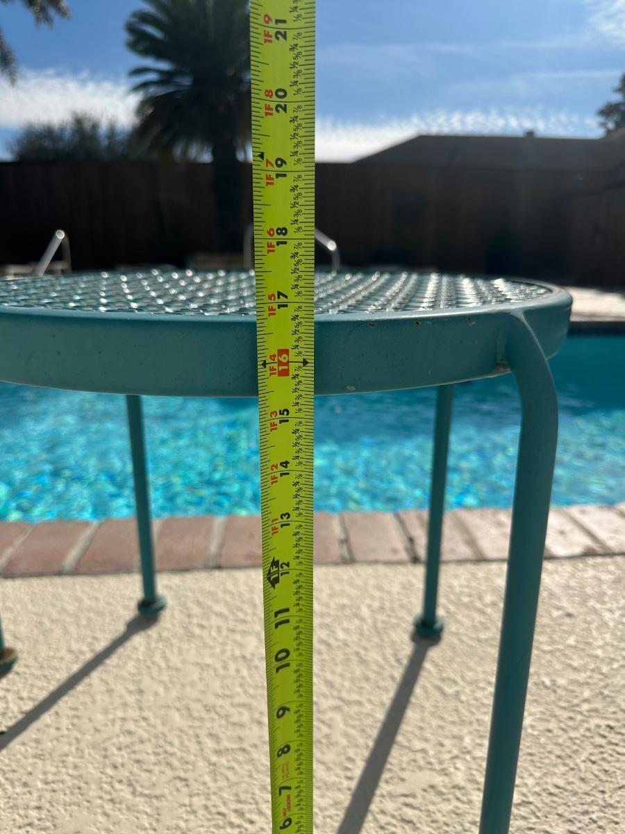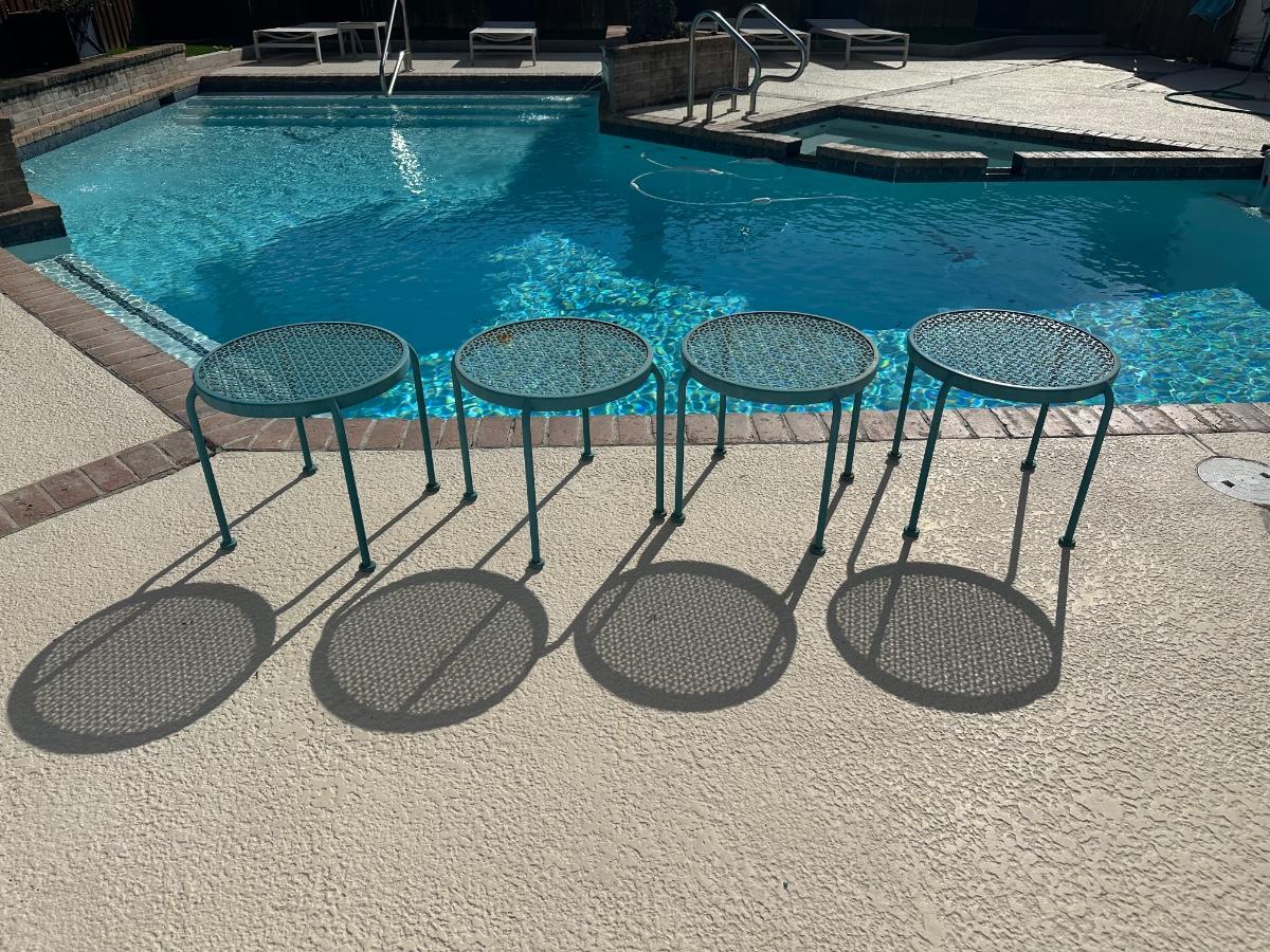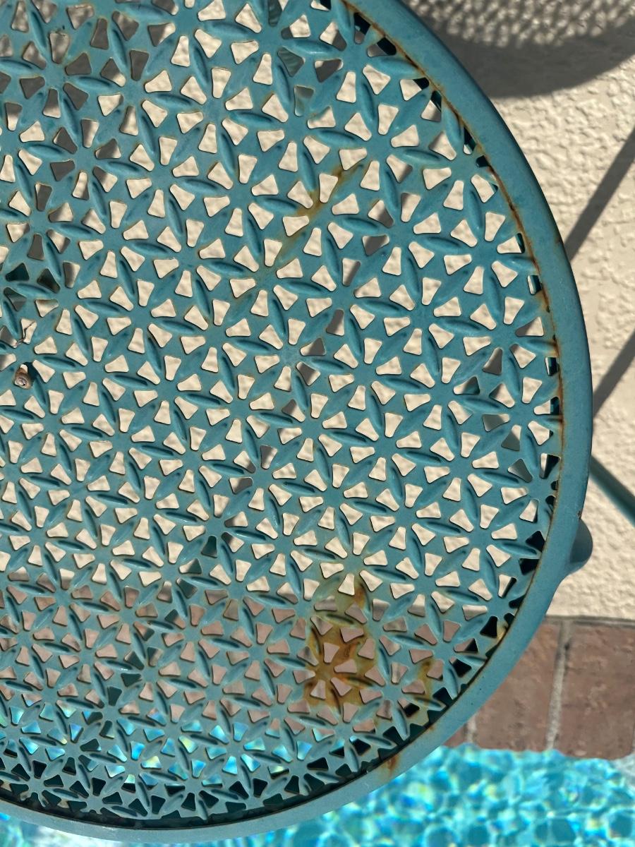 Set of metal outdoor side tables with pierced tops and teal finish. Show surface wear, rust spots, and staining consistent with outdoor use (see photos). Structurally solid.