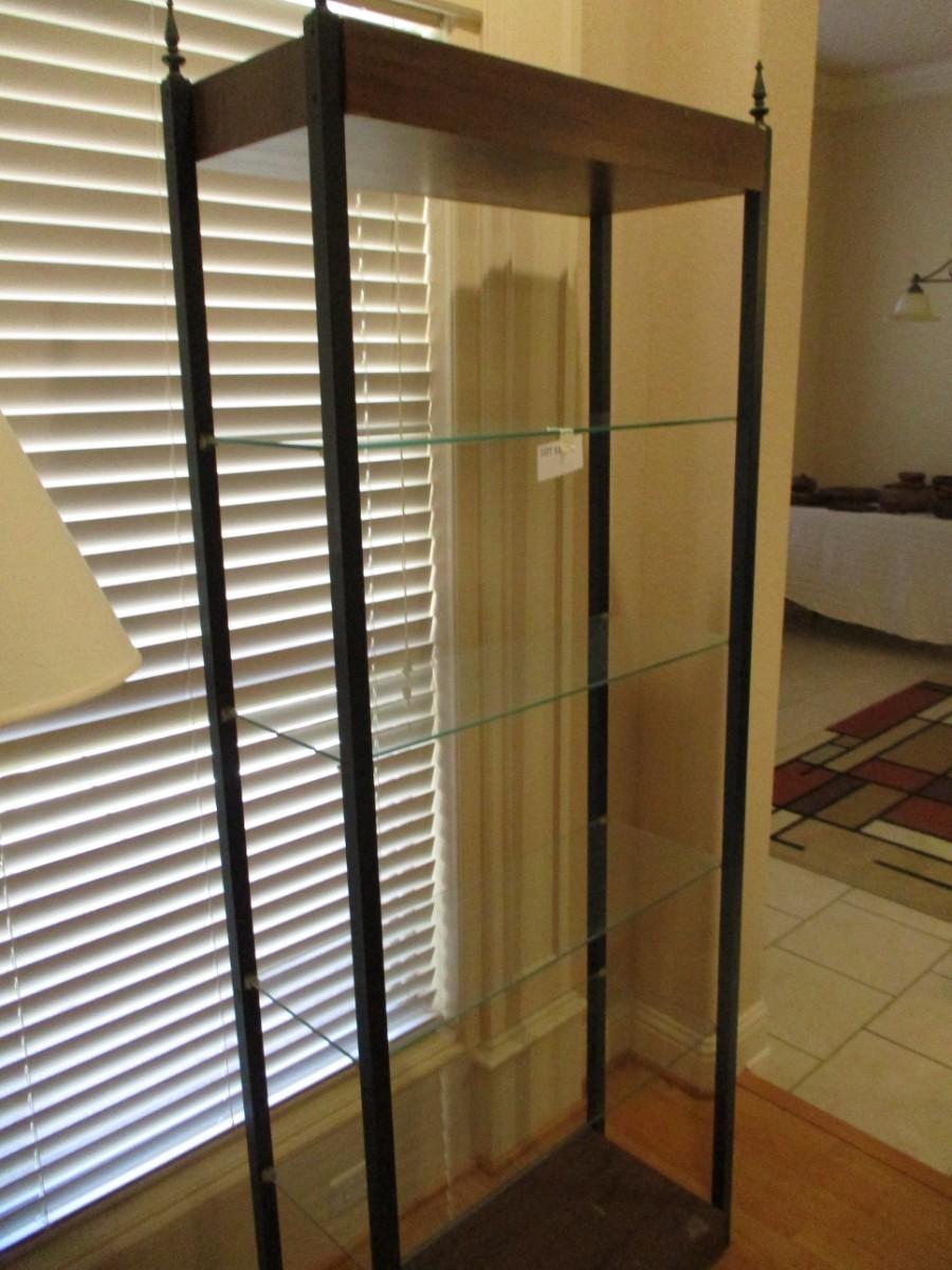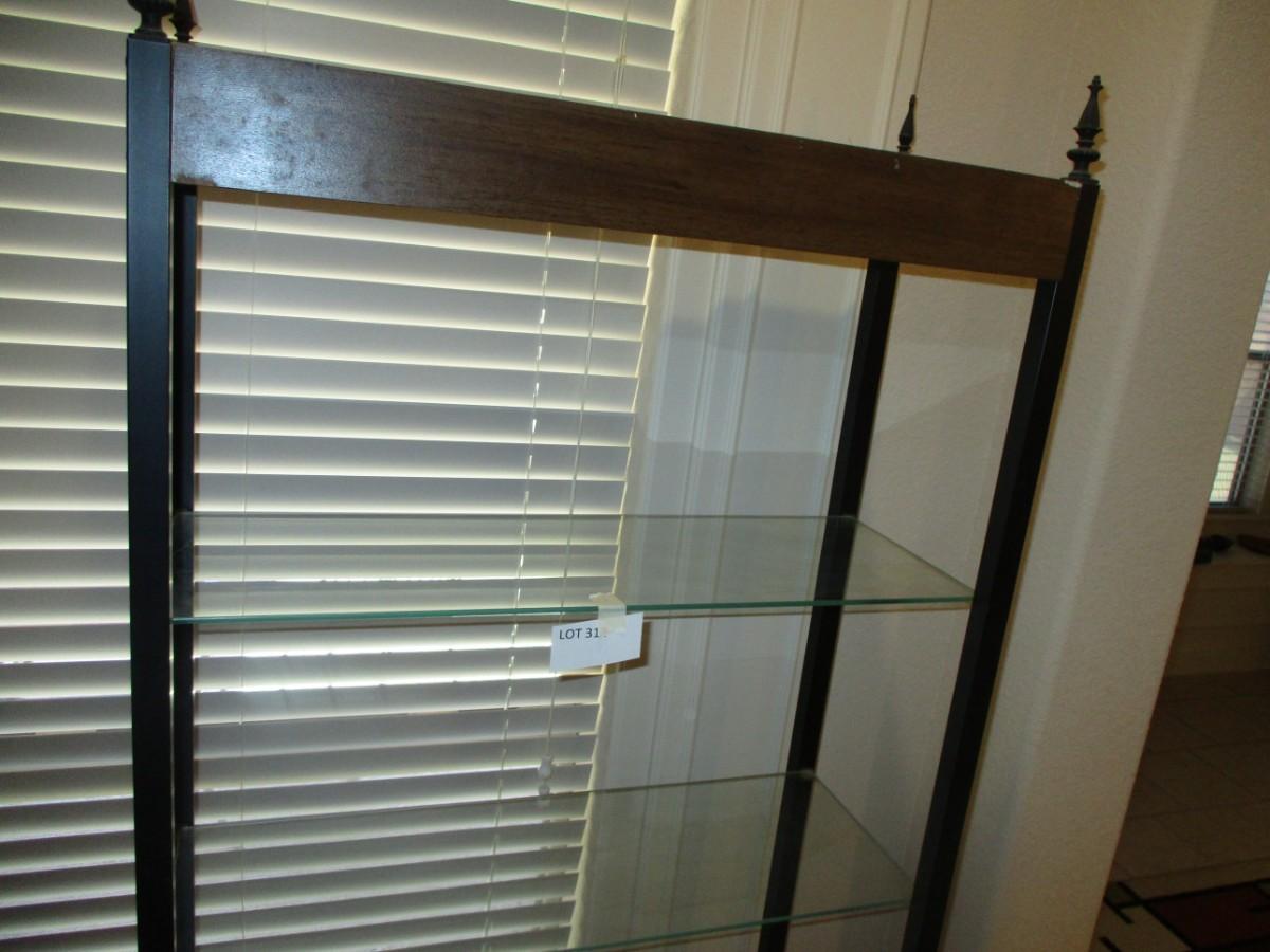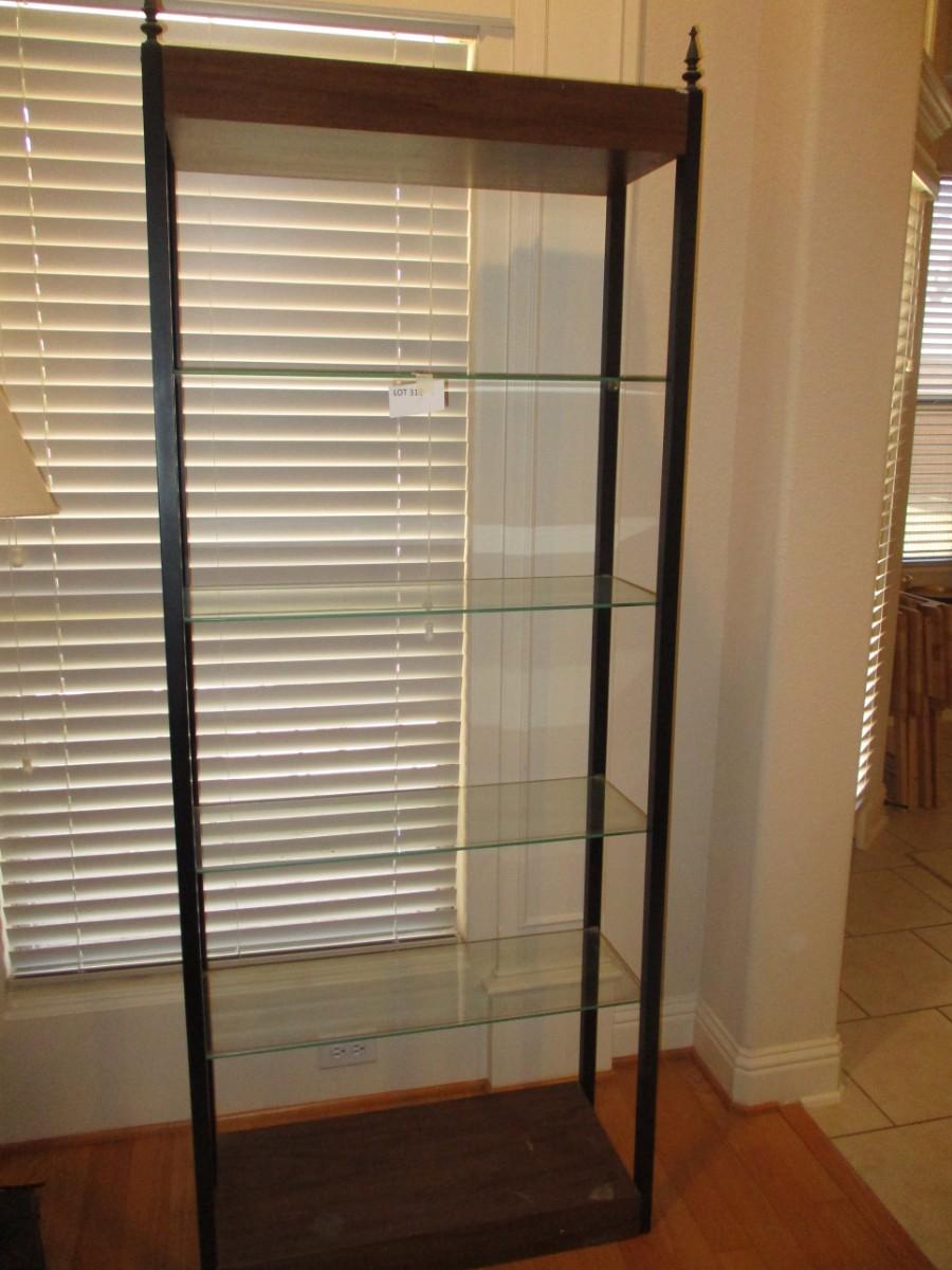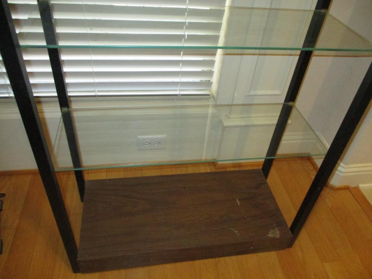 Approx 6"4' height. 2'6" width. Wood frame with glass shelves. Excellent condition