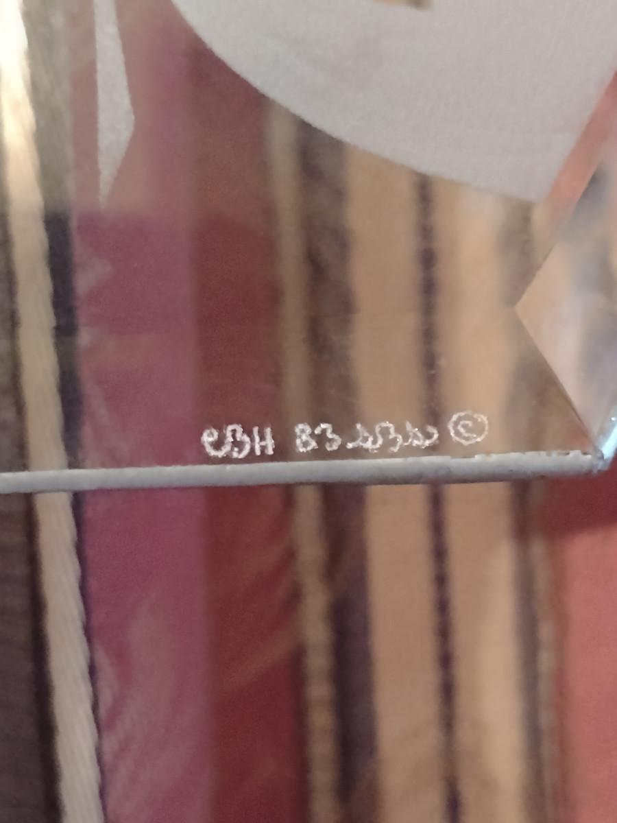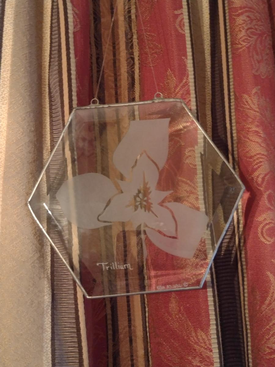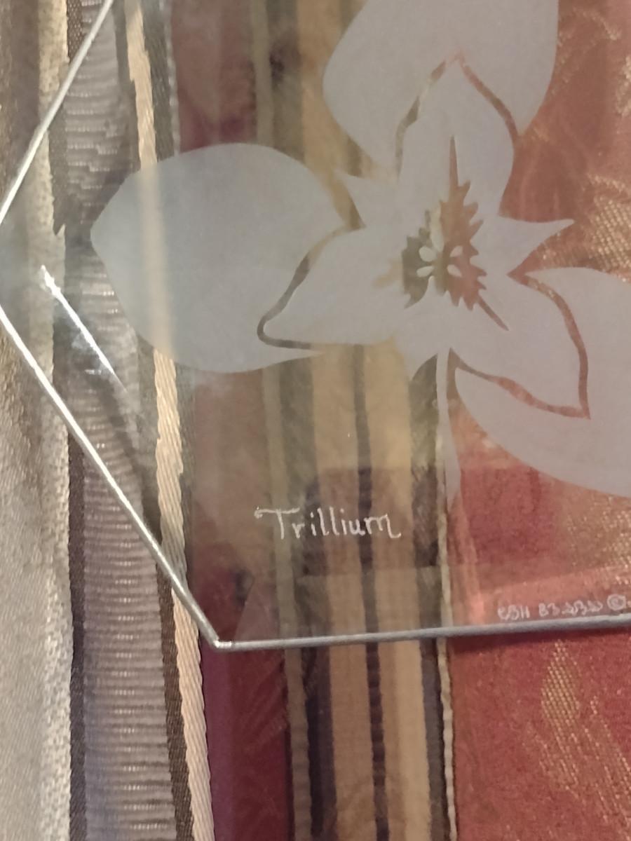Etched Beveled Glass Trillium Design Window Art- Signed by Artist. Approx 5 1/4" tall, 6" wide.