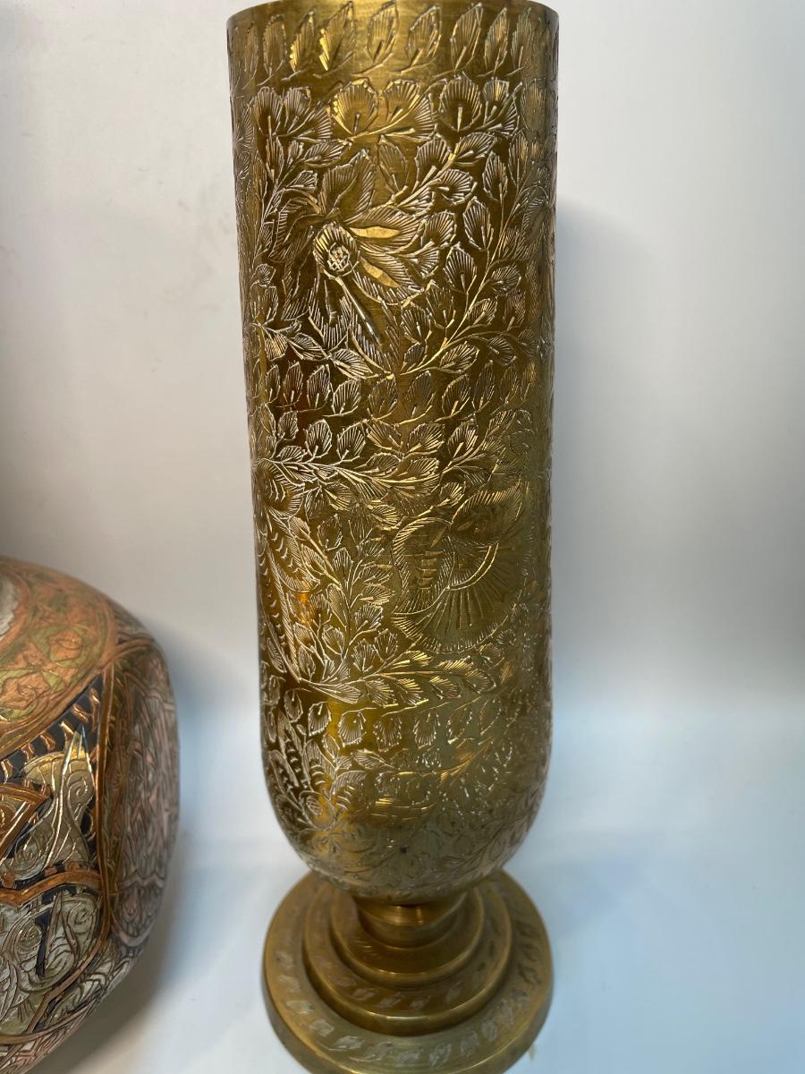 Vase on left has silver, gold & copper look inlays. 12 x 6. Right brass vase 10x3.5
