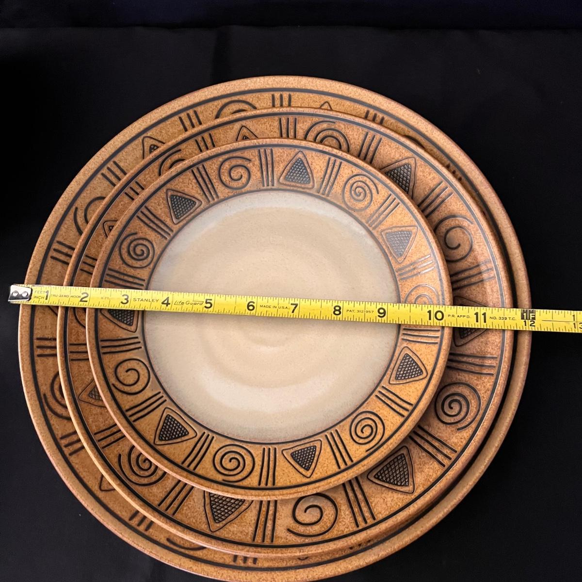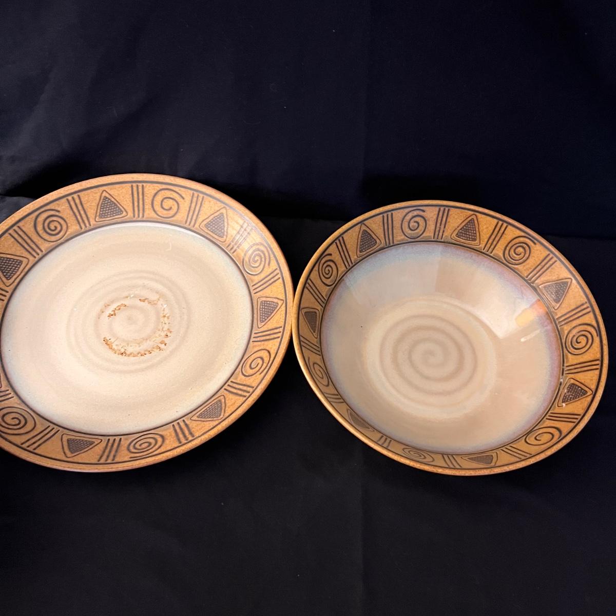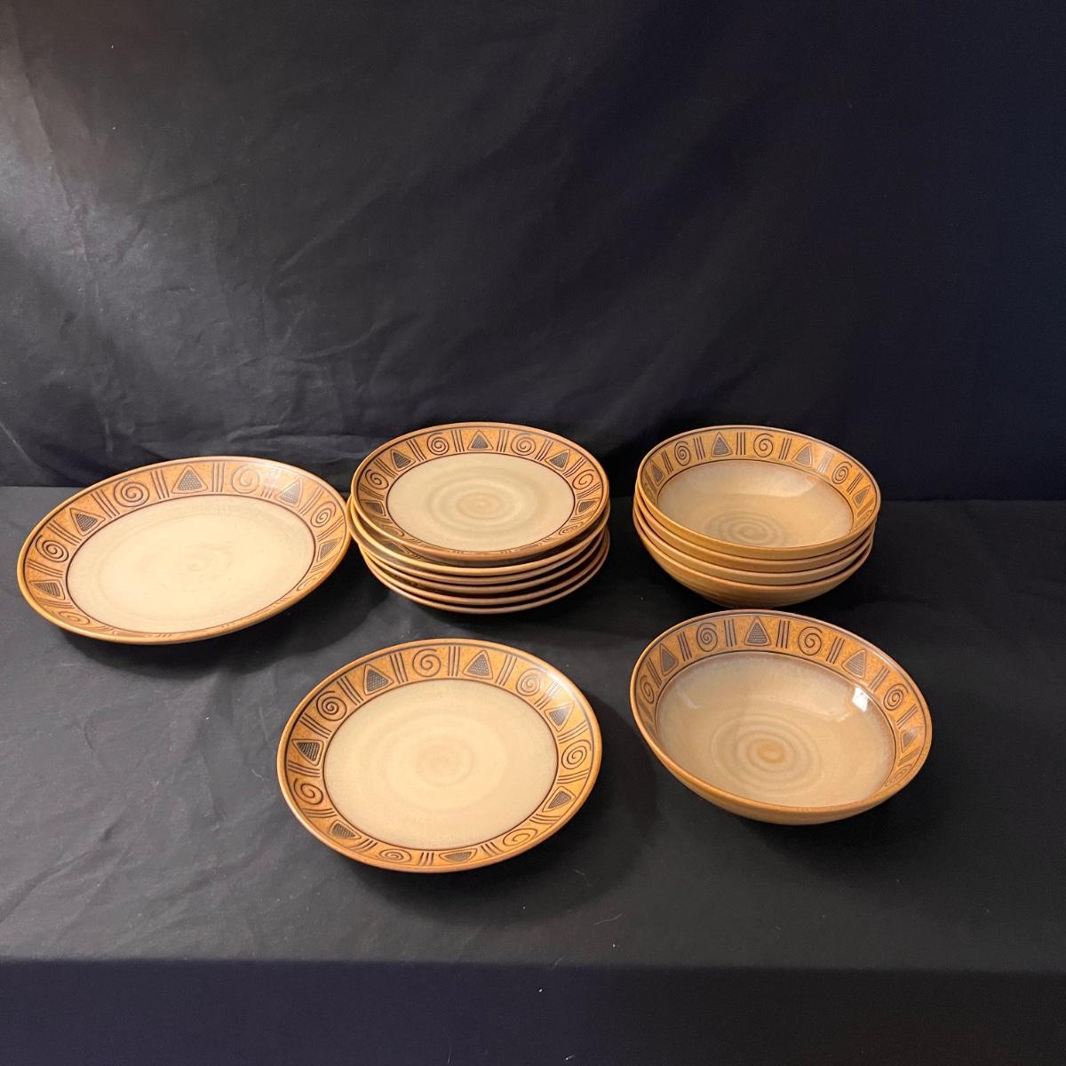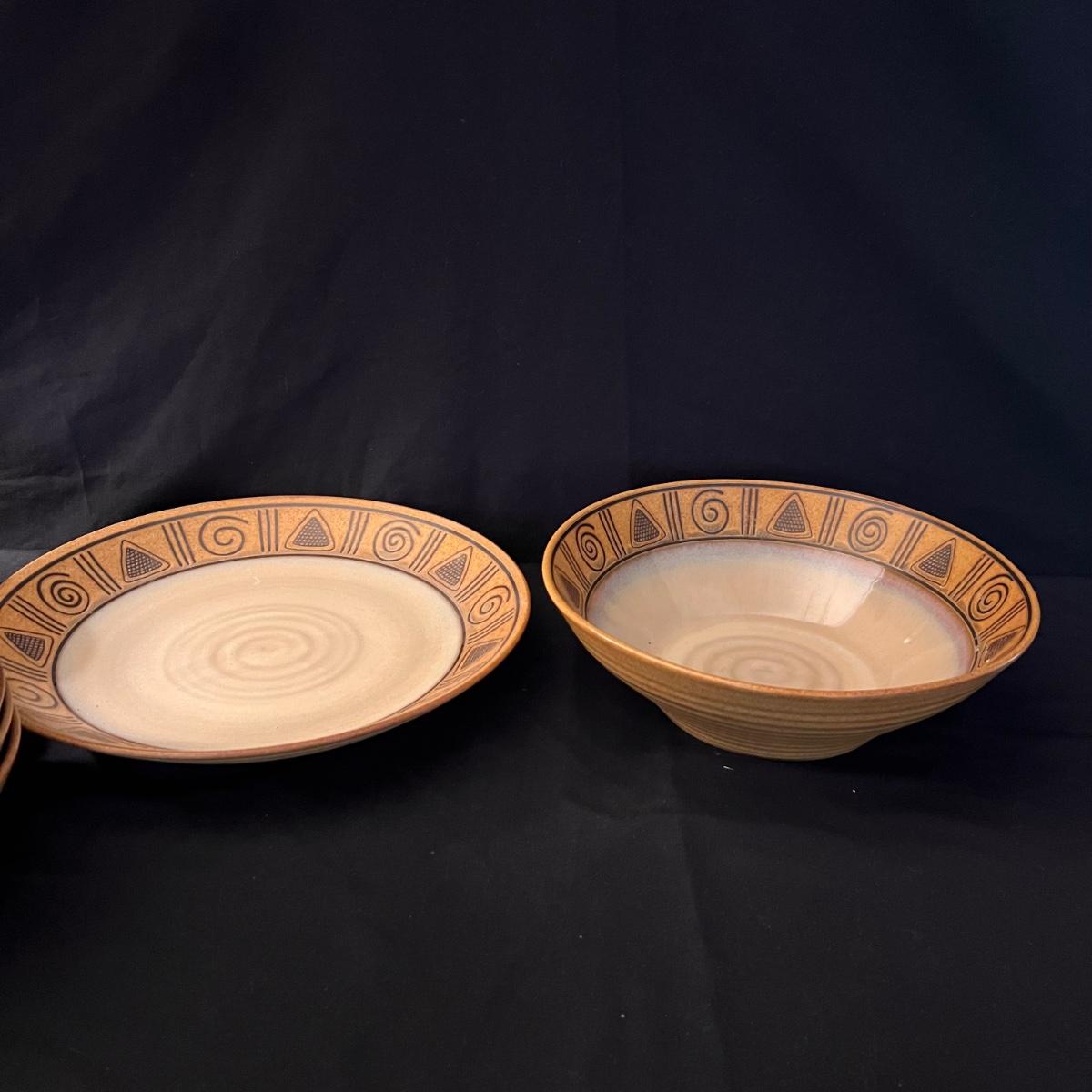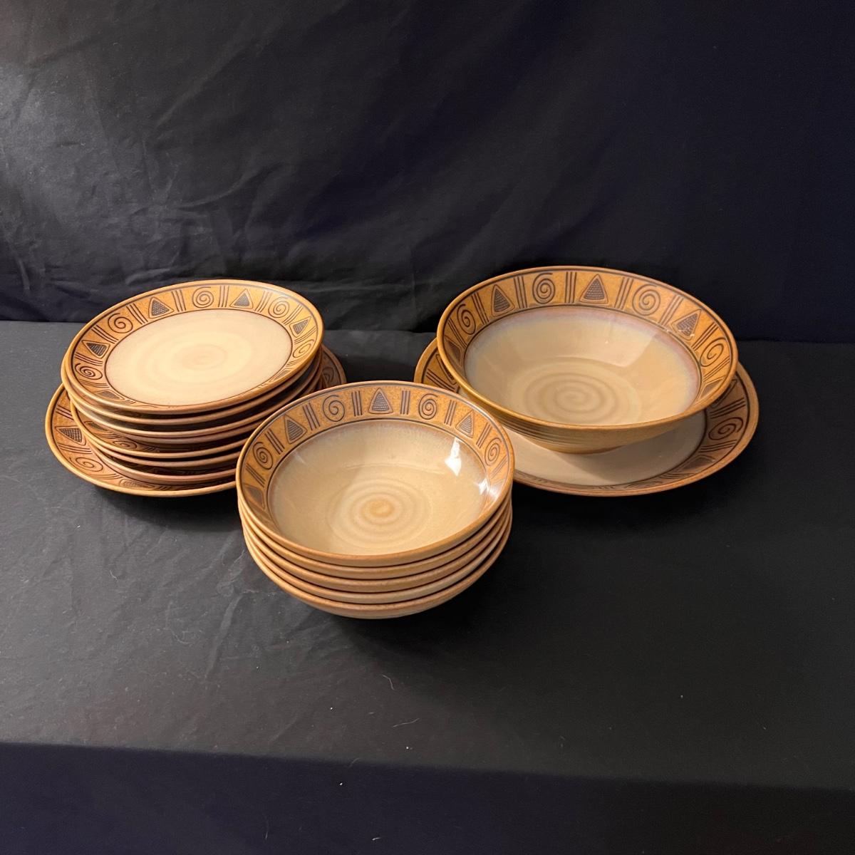 15 piece dinnerware set. With five bowls, seven plates, two serving plates, and a large bowl. See pics for more information and measurements.