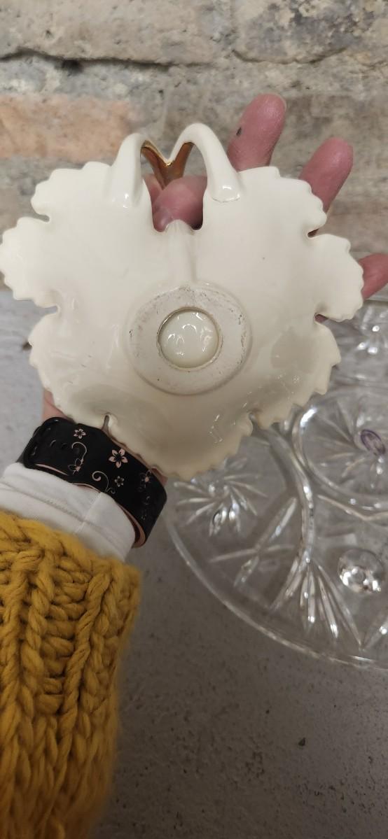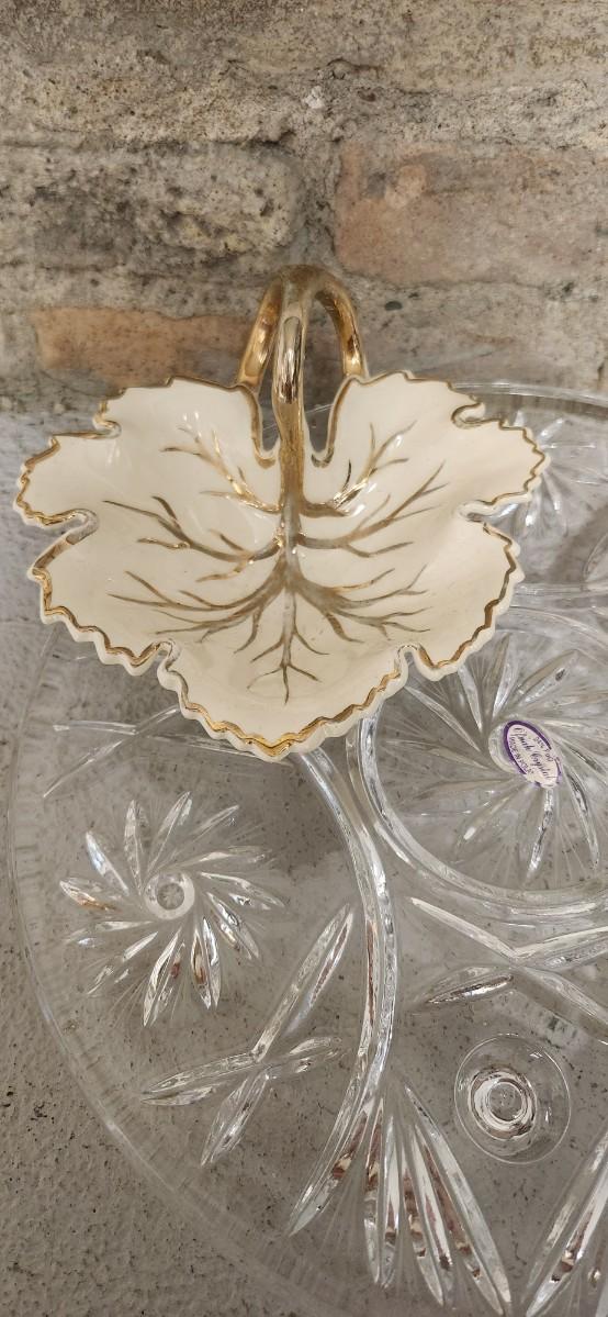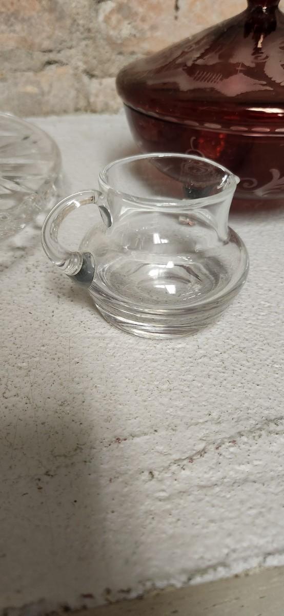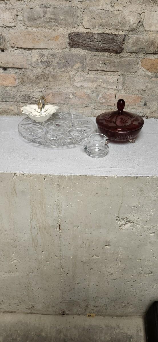 Crystal cake plate, beautiful little blown creamer, vintage leaf bowl and a fantastic Egermann etched candy dish in cranberry