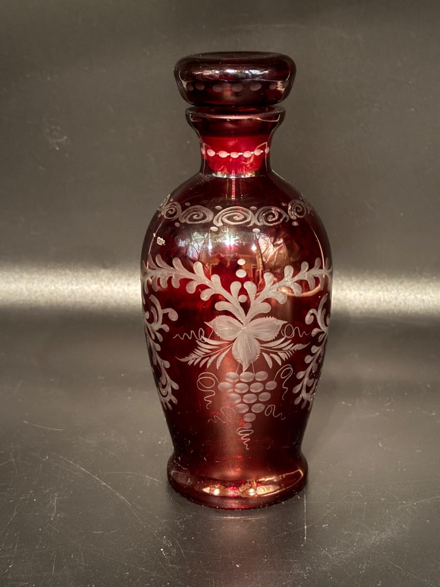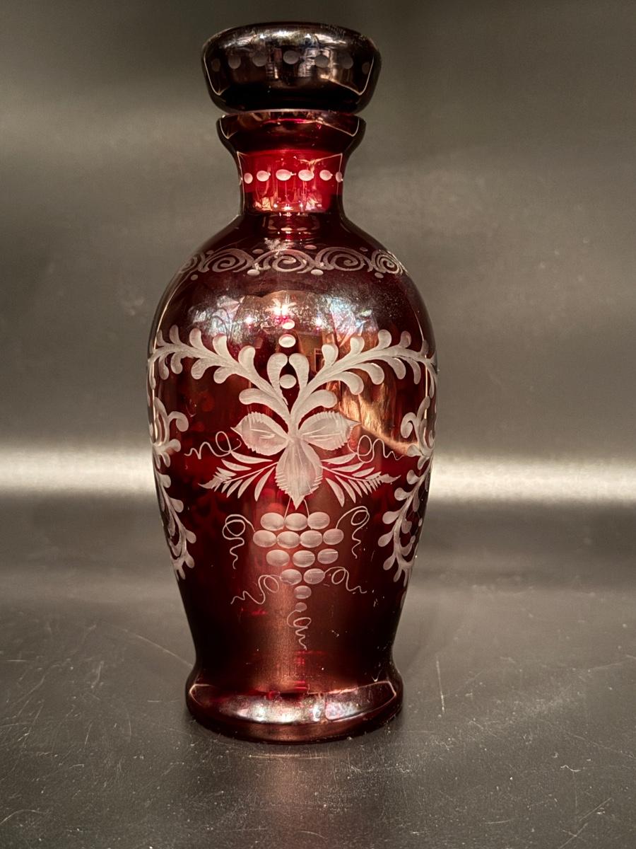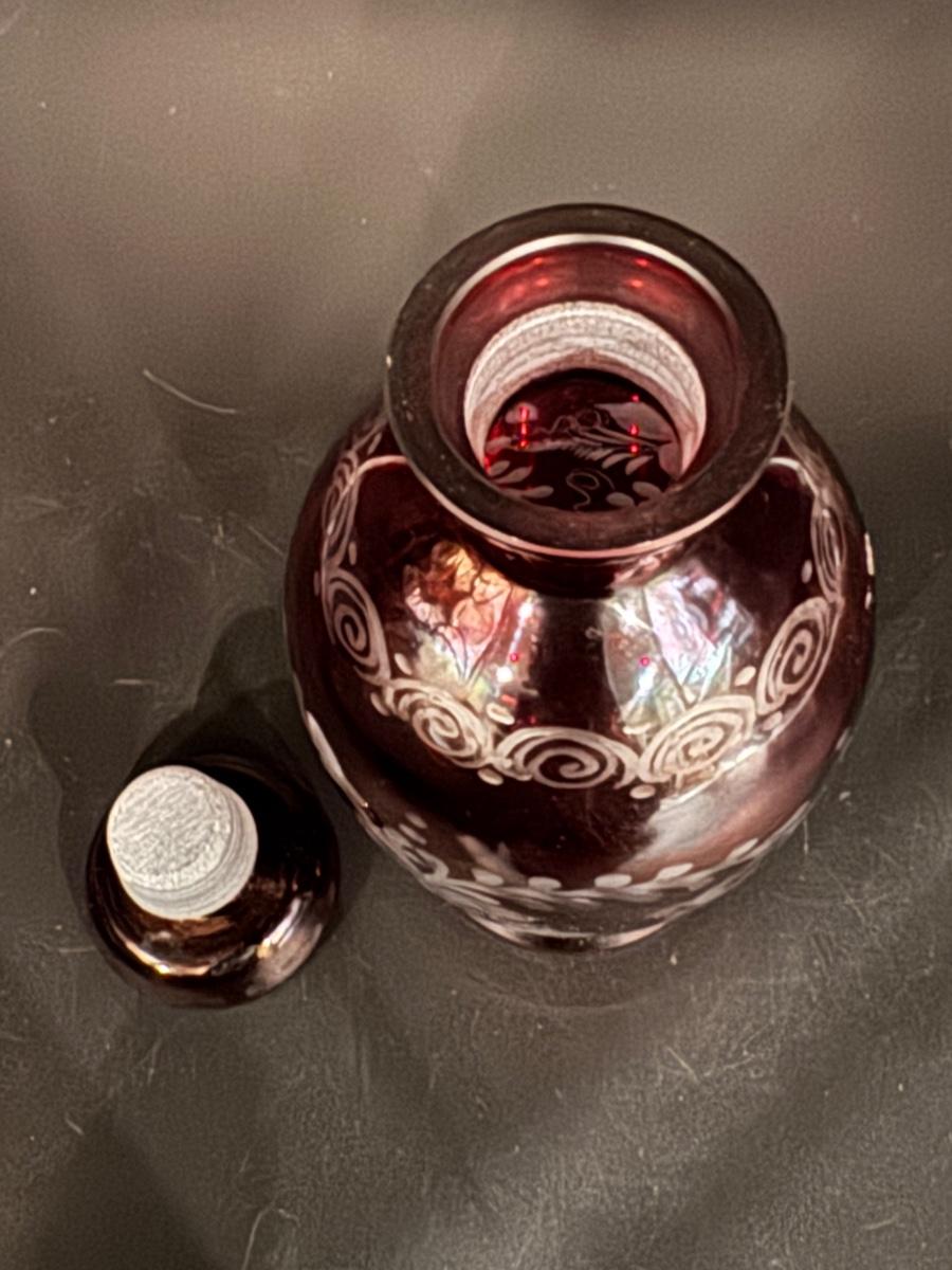 Etched Cranberry Antique Glass Decanter with Ground Stopper
