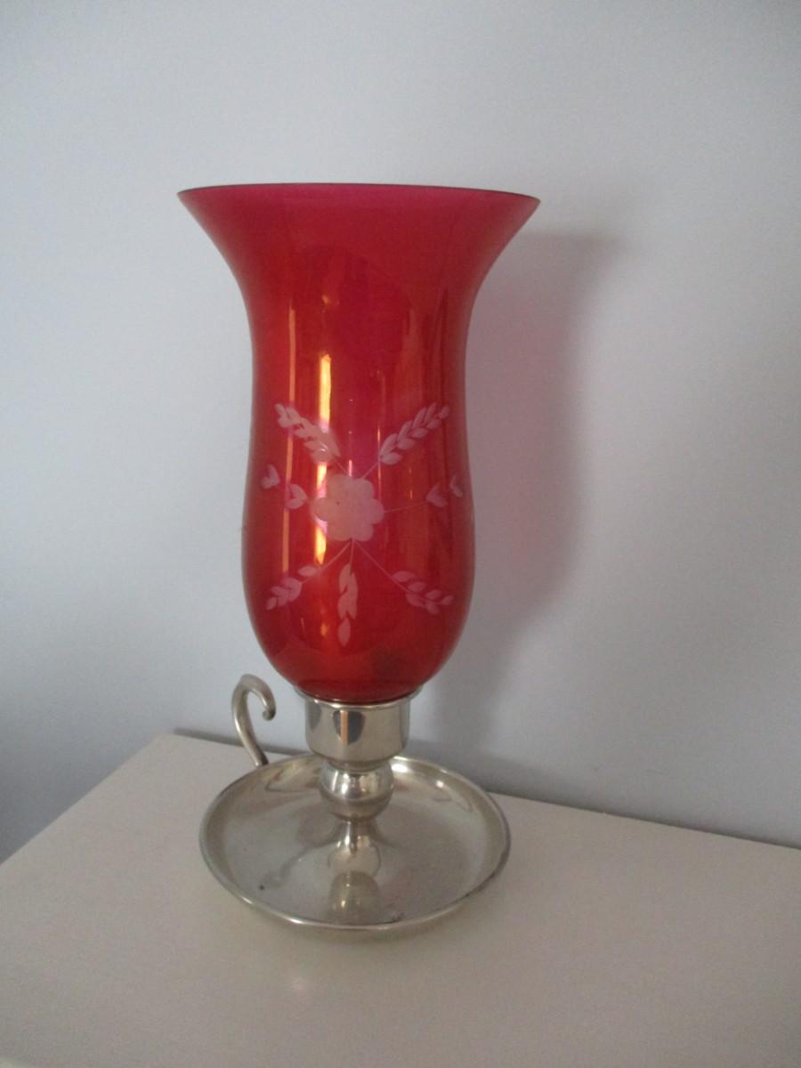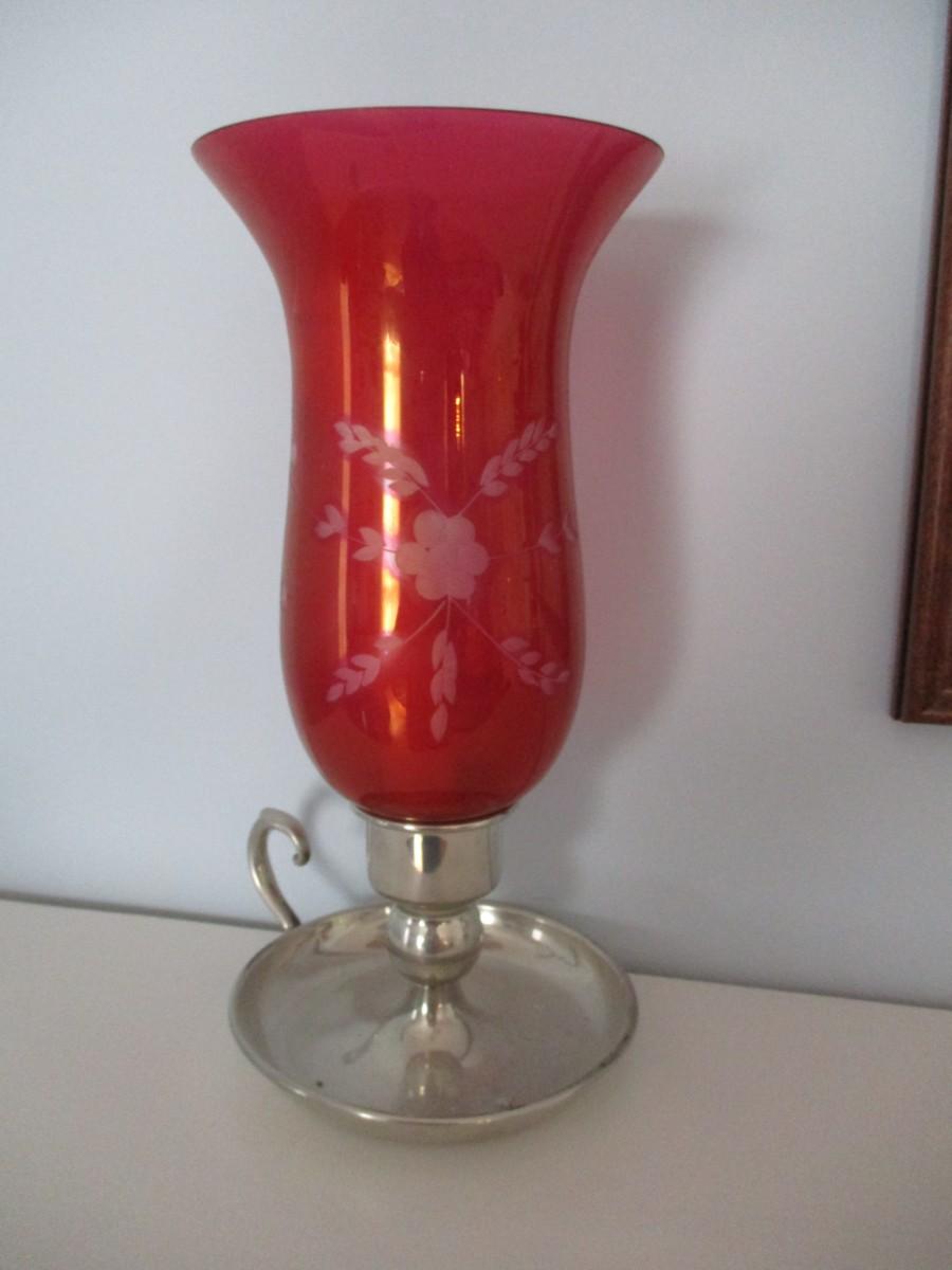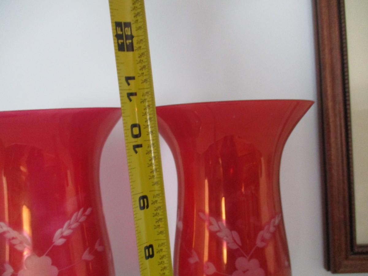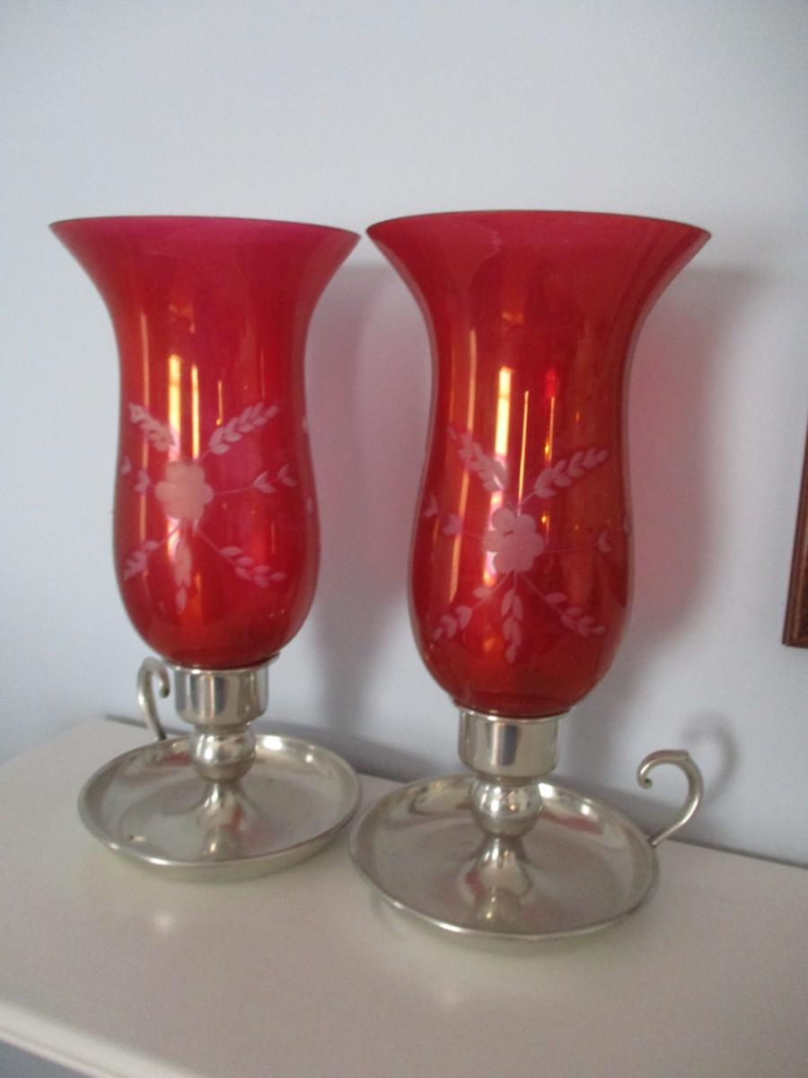 Etched Cranberry Glass Hurricane Shade Candlestick Holders - A