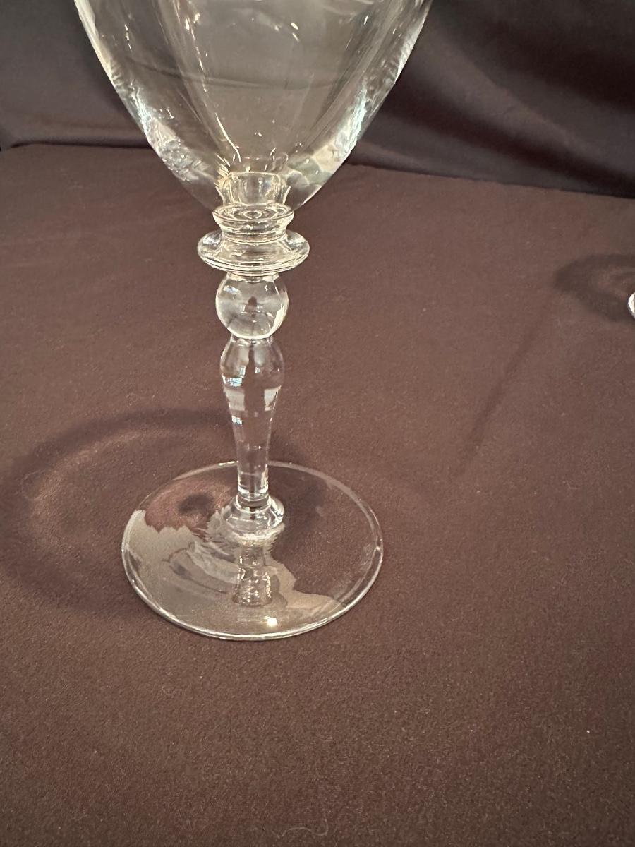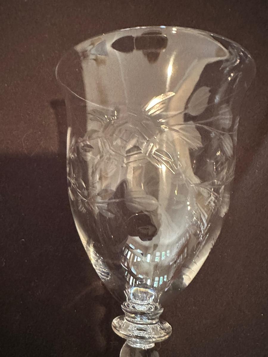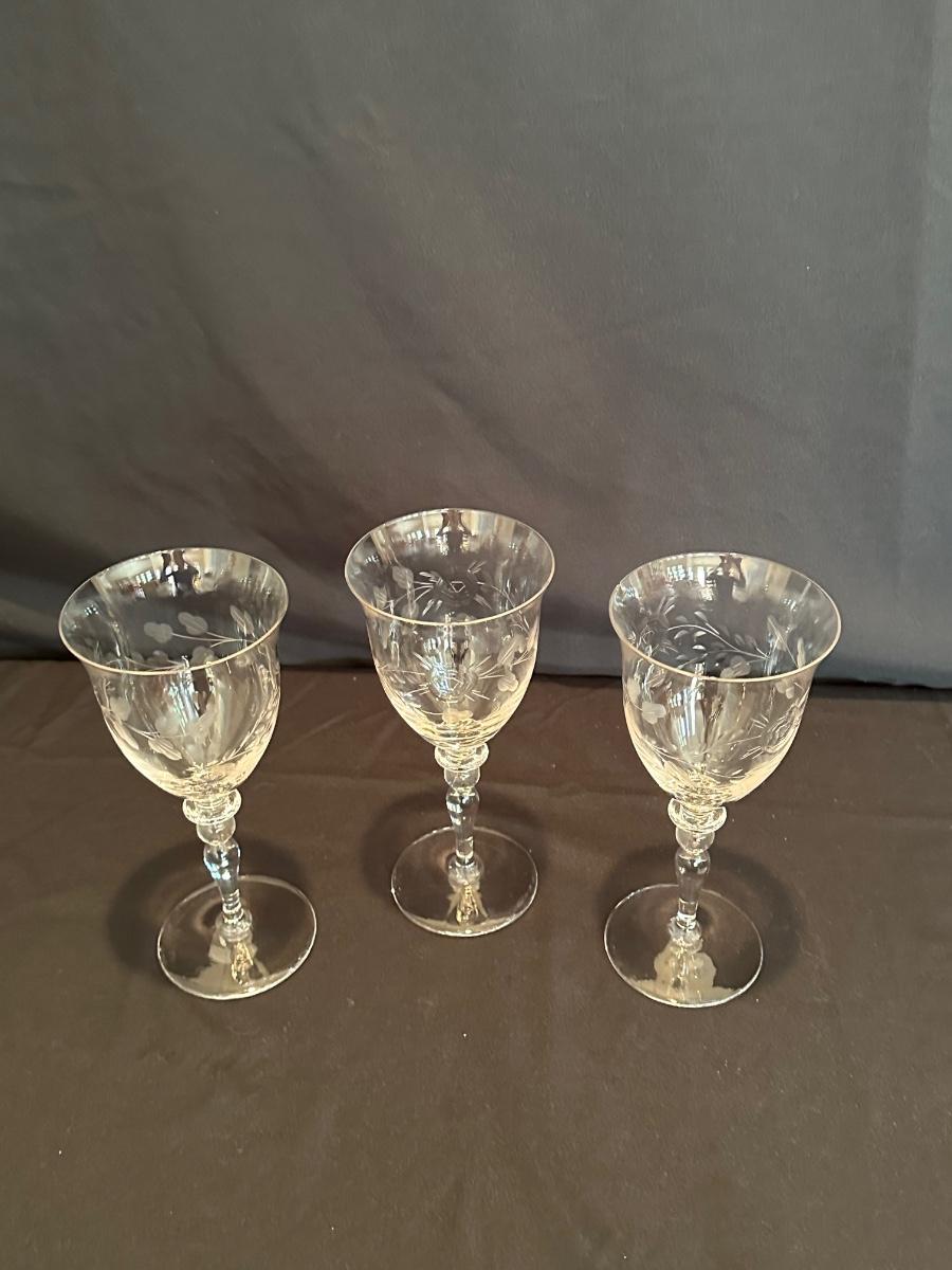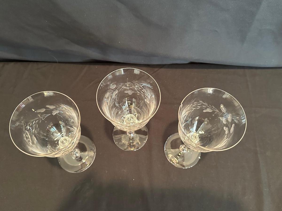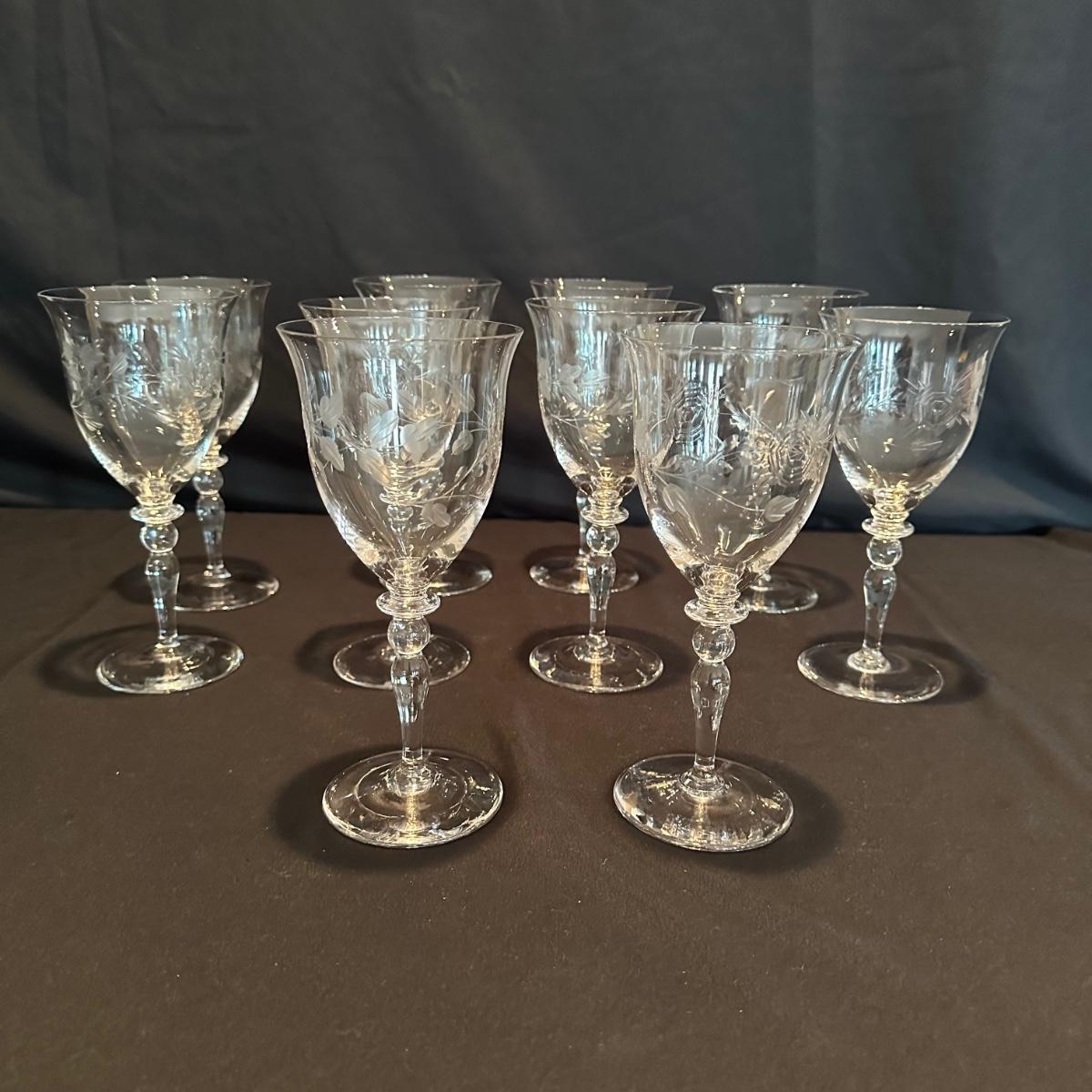Ten floral and leaf etched crystal wine glasses. No visible scratches or chips.