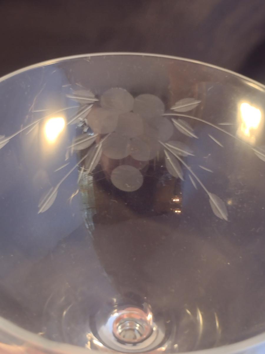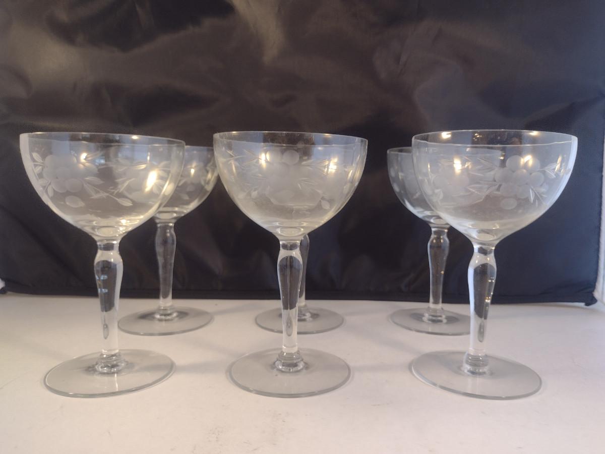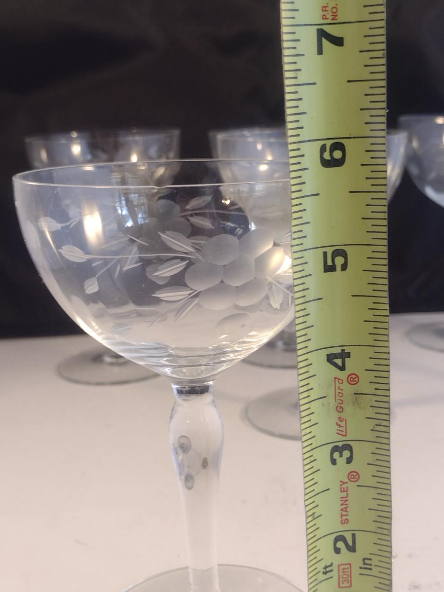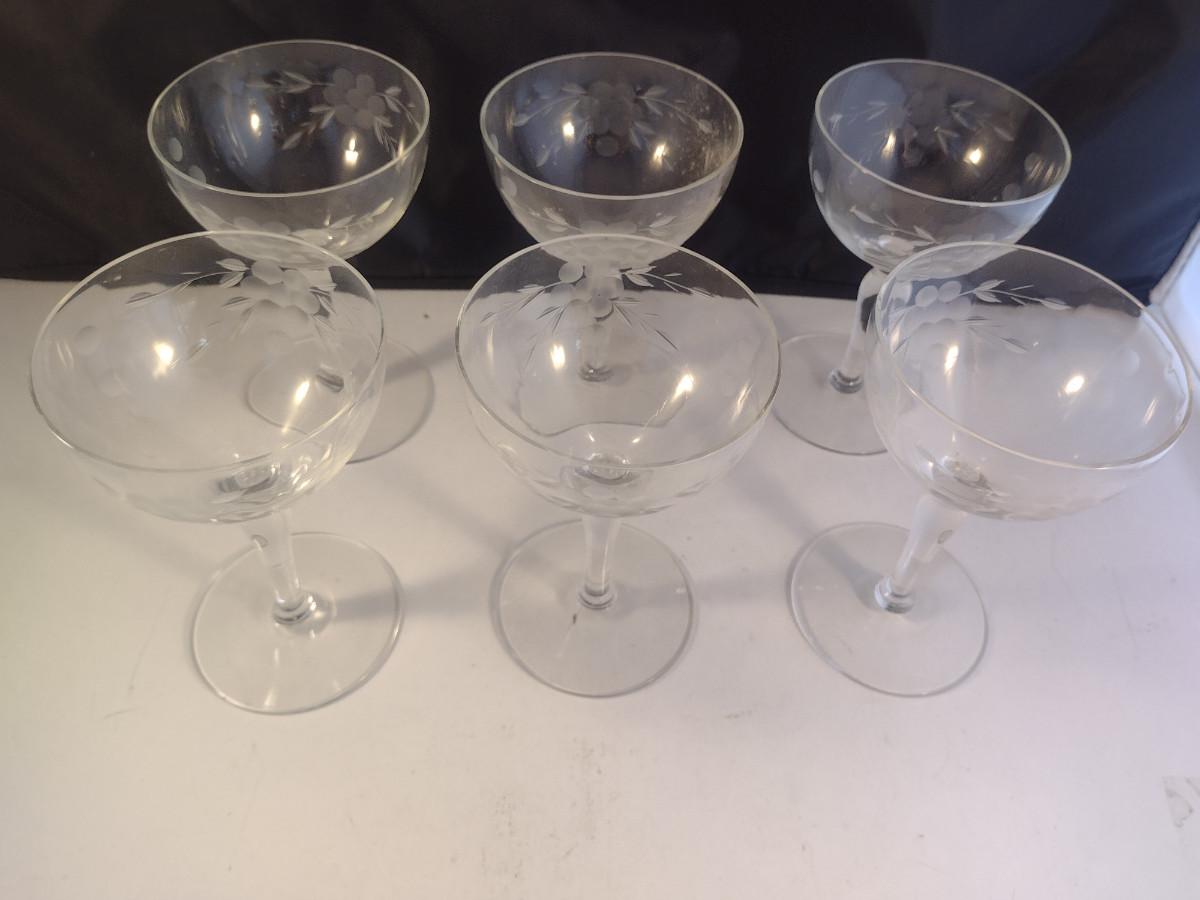 Etched Crystal Wine/Sherbet Glasses- 6 Piece. Items are in used condition and have small 'chigger bite' chipping.