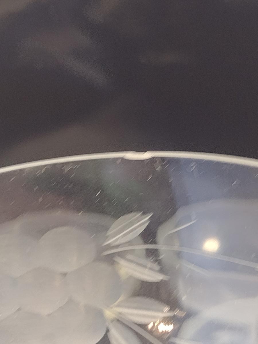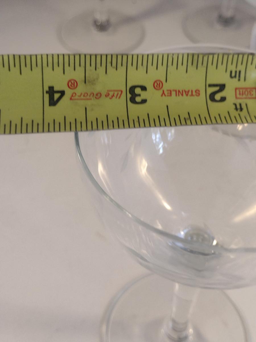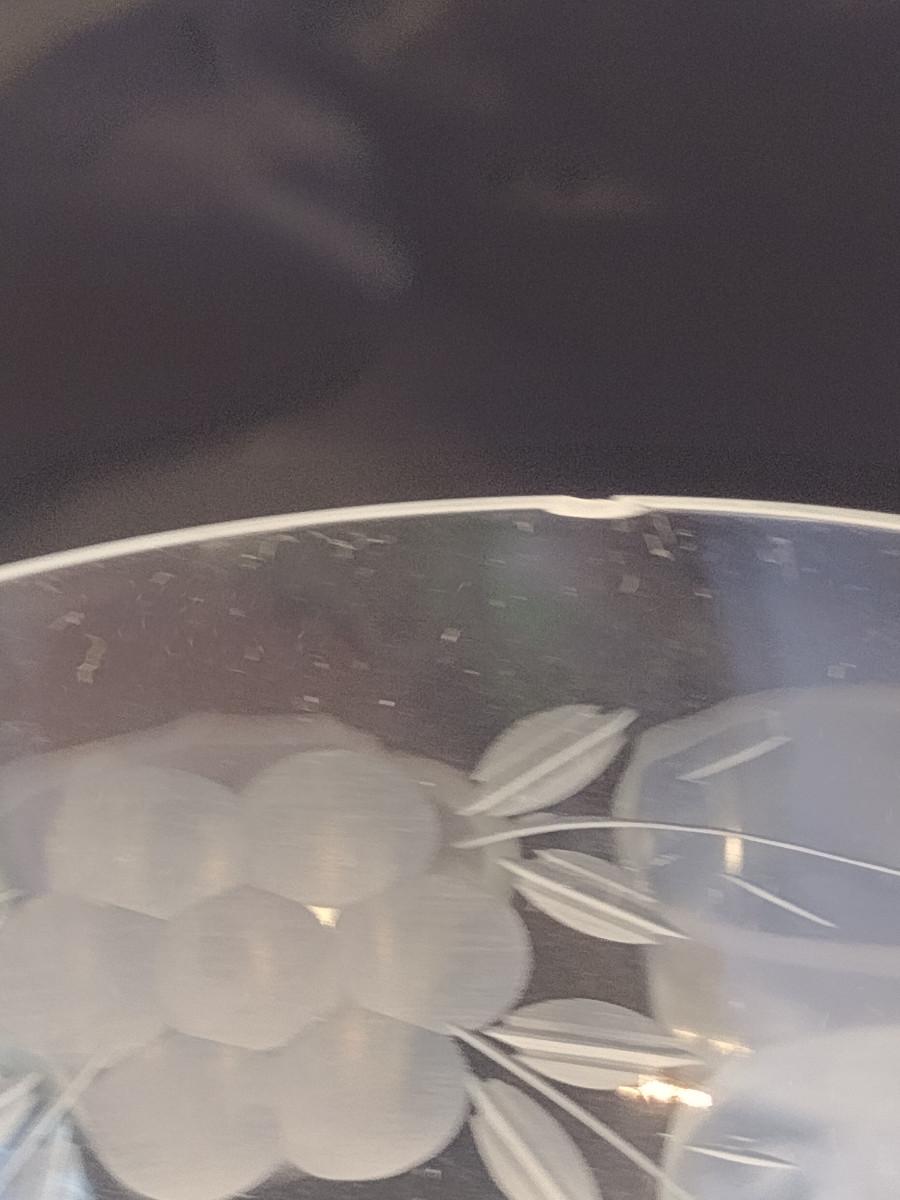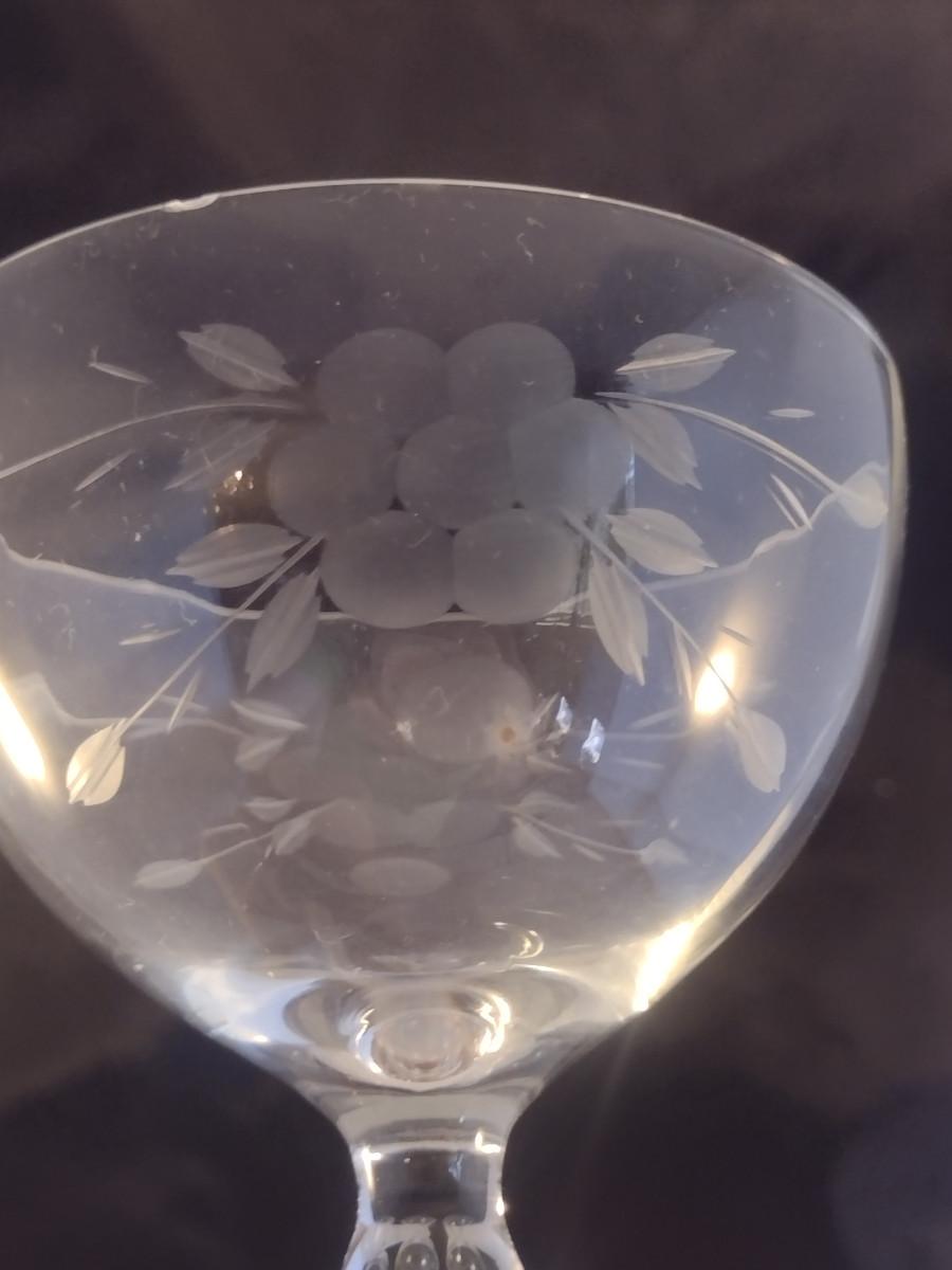 Etched Crystal Wine/Sherbet Glasses- 6 Piece. Items are in used condition and have small 'chigger bite' chipping.