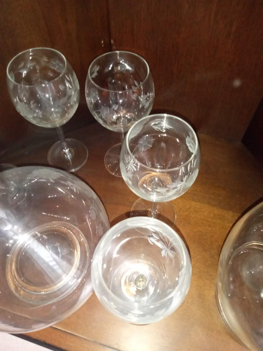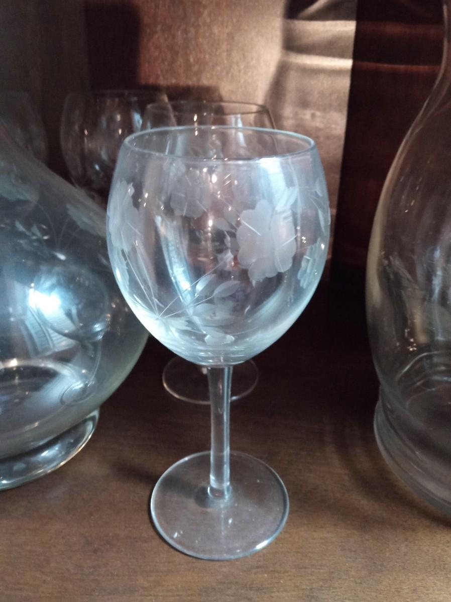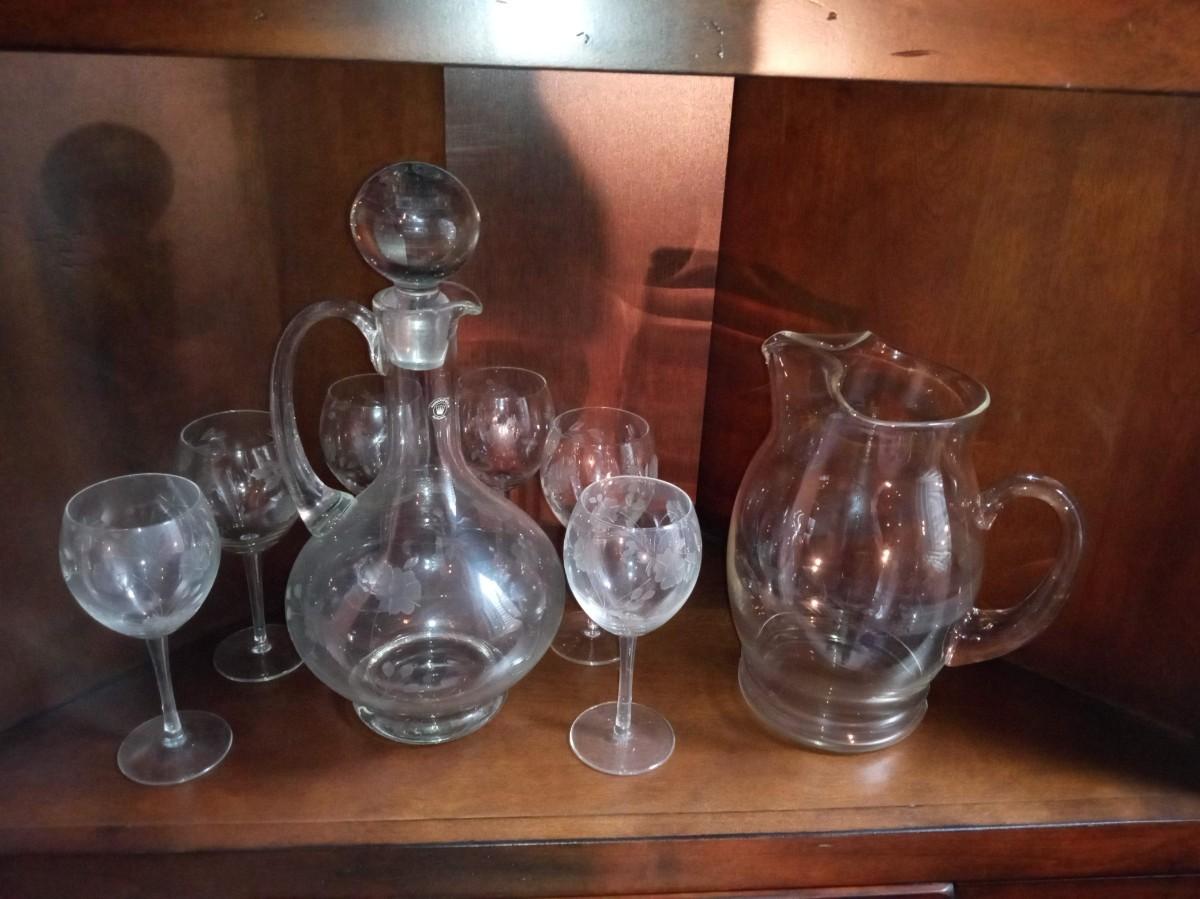 ETCHED DECANTER W/MATCHING STEMMED GLASSES AND GLASS PITCHER