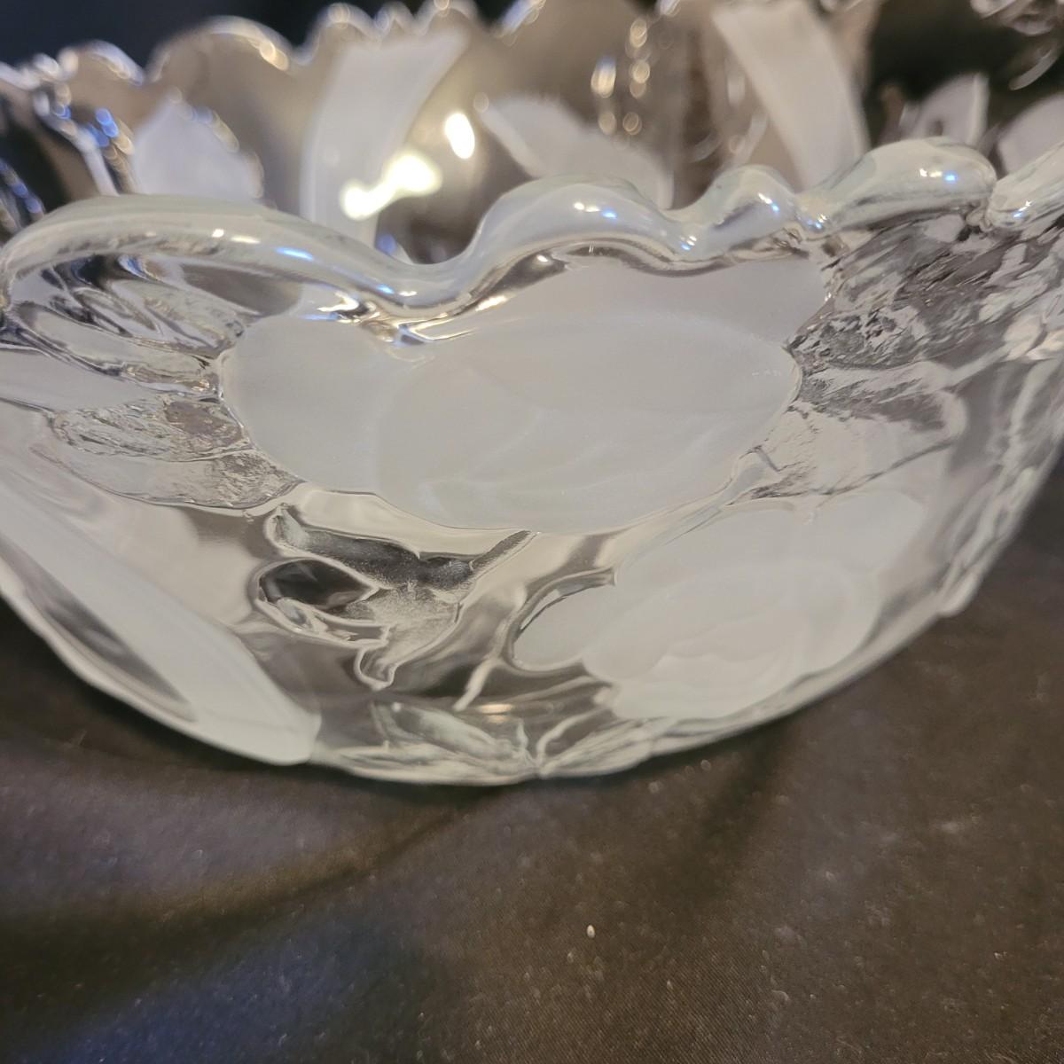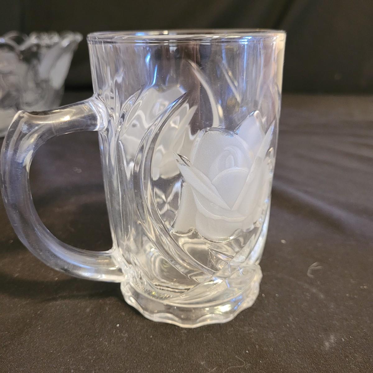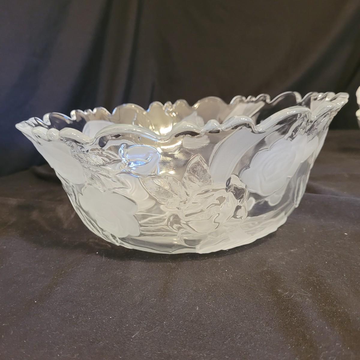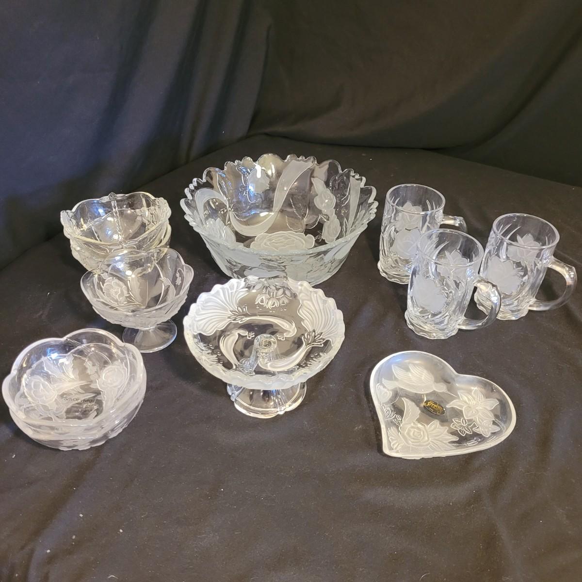 This lot includes eight serving bowls and dishes, and three mugs. Each piece has a unique floral etched design with frosting, adding depth and character. Some items still have original stickers, will need light cleaning to remove them. Large punch bowl measures approximately 11"DIA x5"H. Shipping available. Shipping can be costly. We suggest calling our local UPS with dimensions and getting an estimate before bidding: (828) 252-6930.