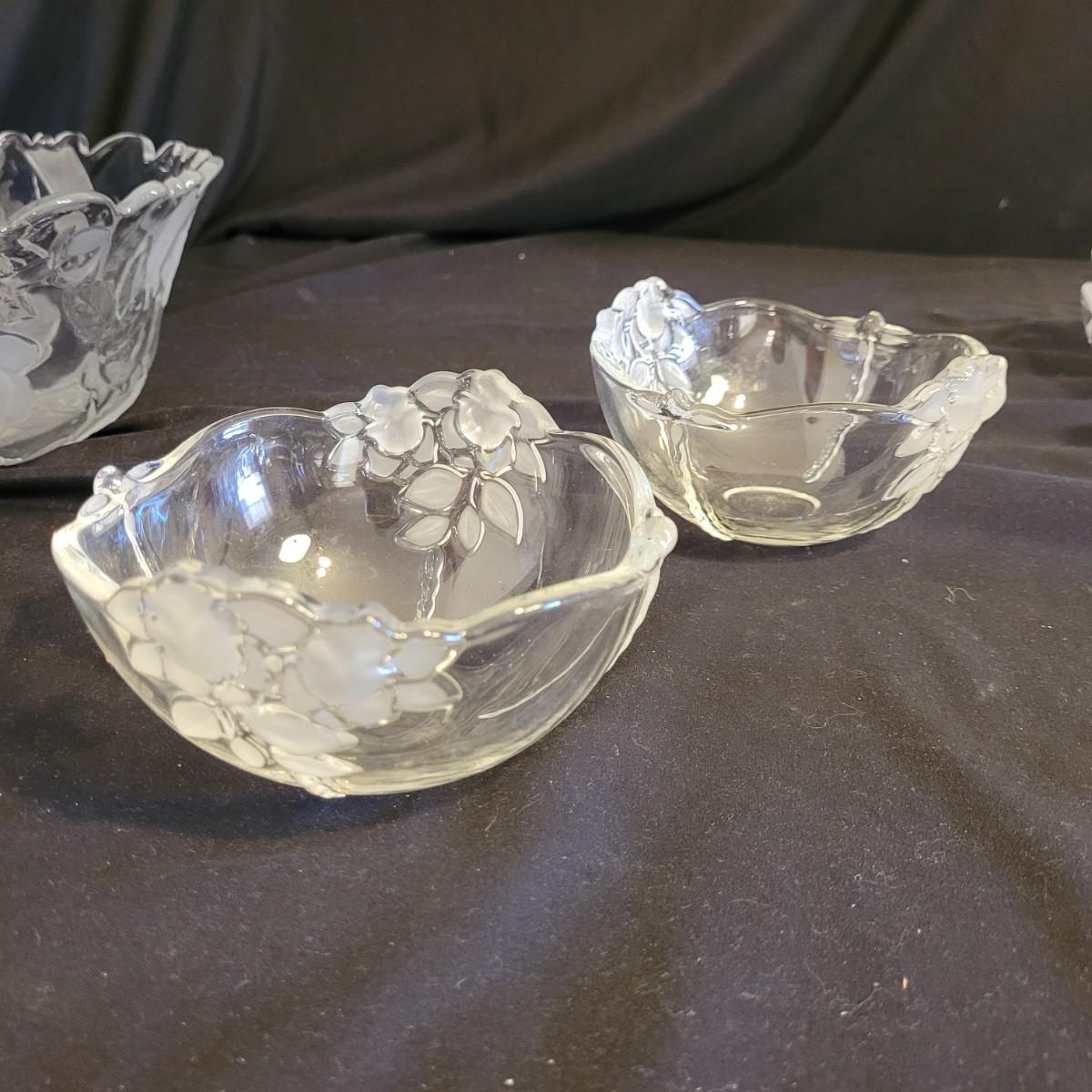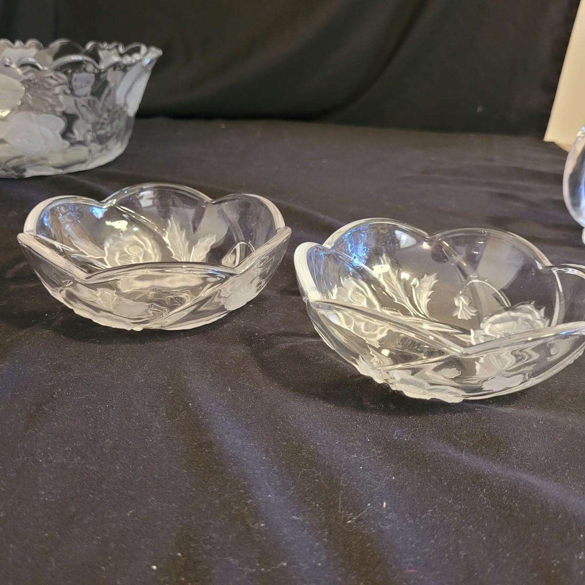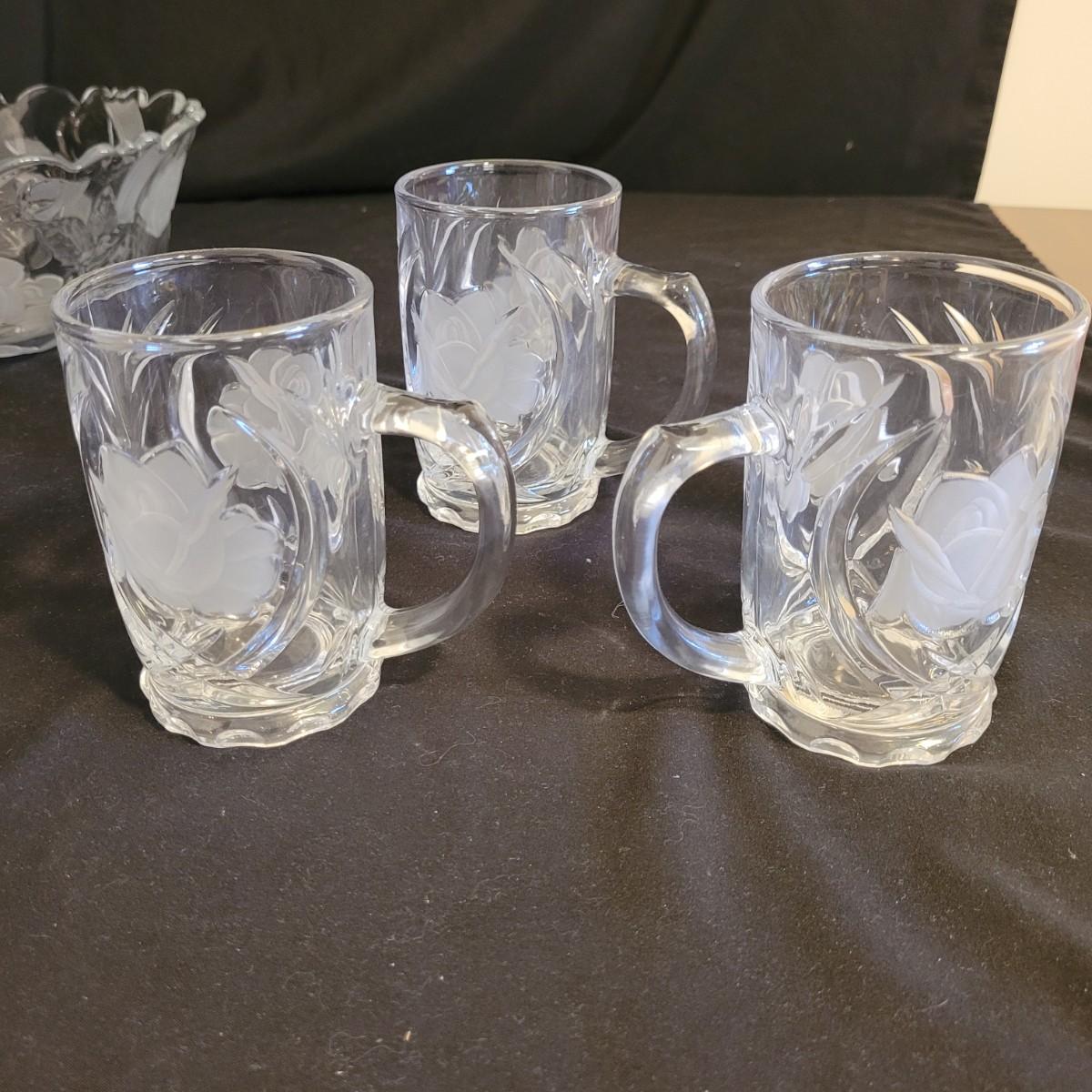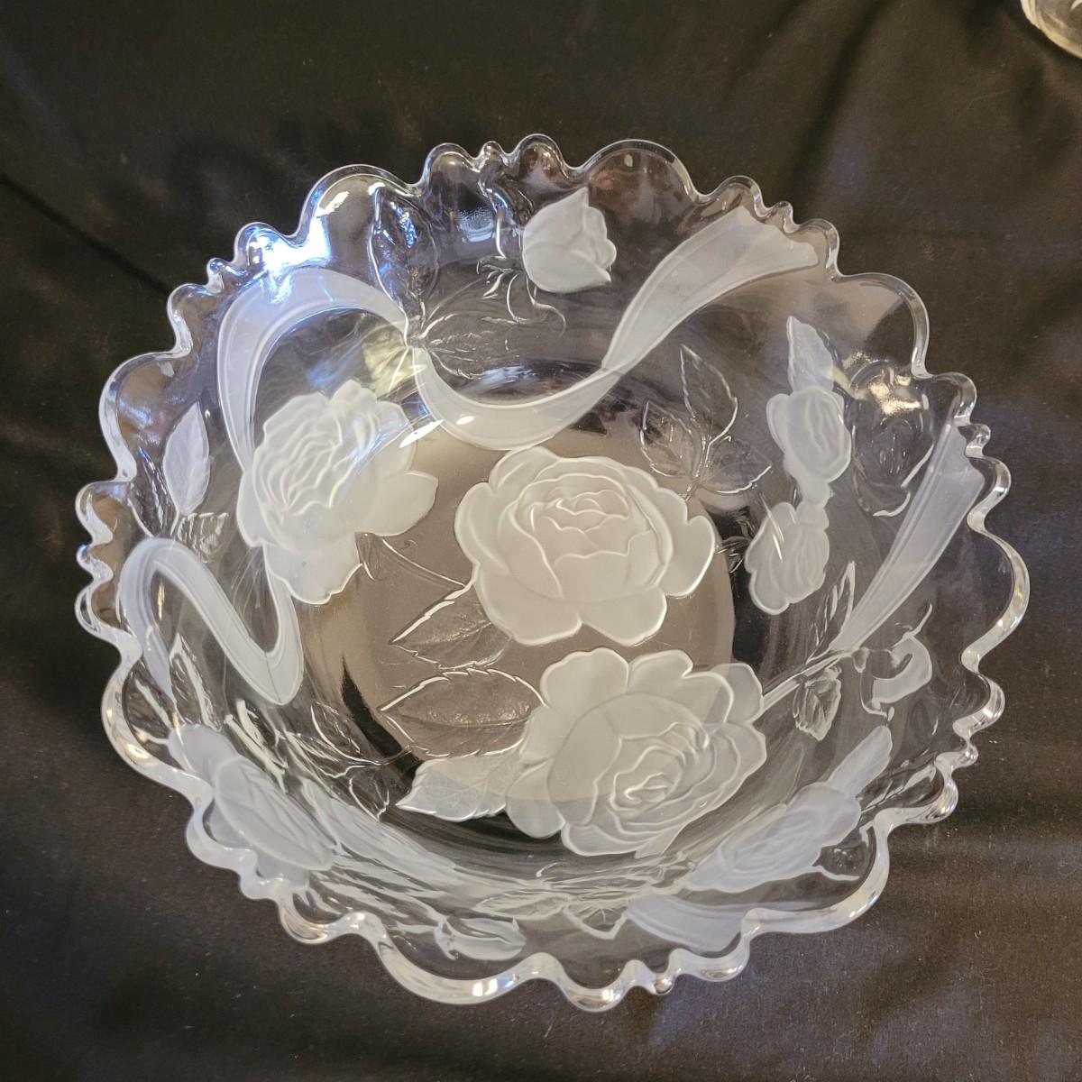 This lot includes eight serving bowls and dishes, and three mugs. Each piece has a unique floral etched design with frosting, adding depth and character. Some items still have original stickers, will need light cleaning to remove them. Large punch bowl measures approximately 11"DIA x5"H. Shipping available. Shipping can be costly. We suggest calling our local UPS with dimensions and getting an estimate before bidding: (828) 252-6930.