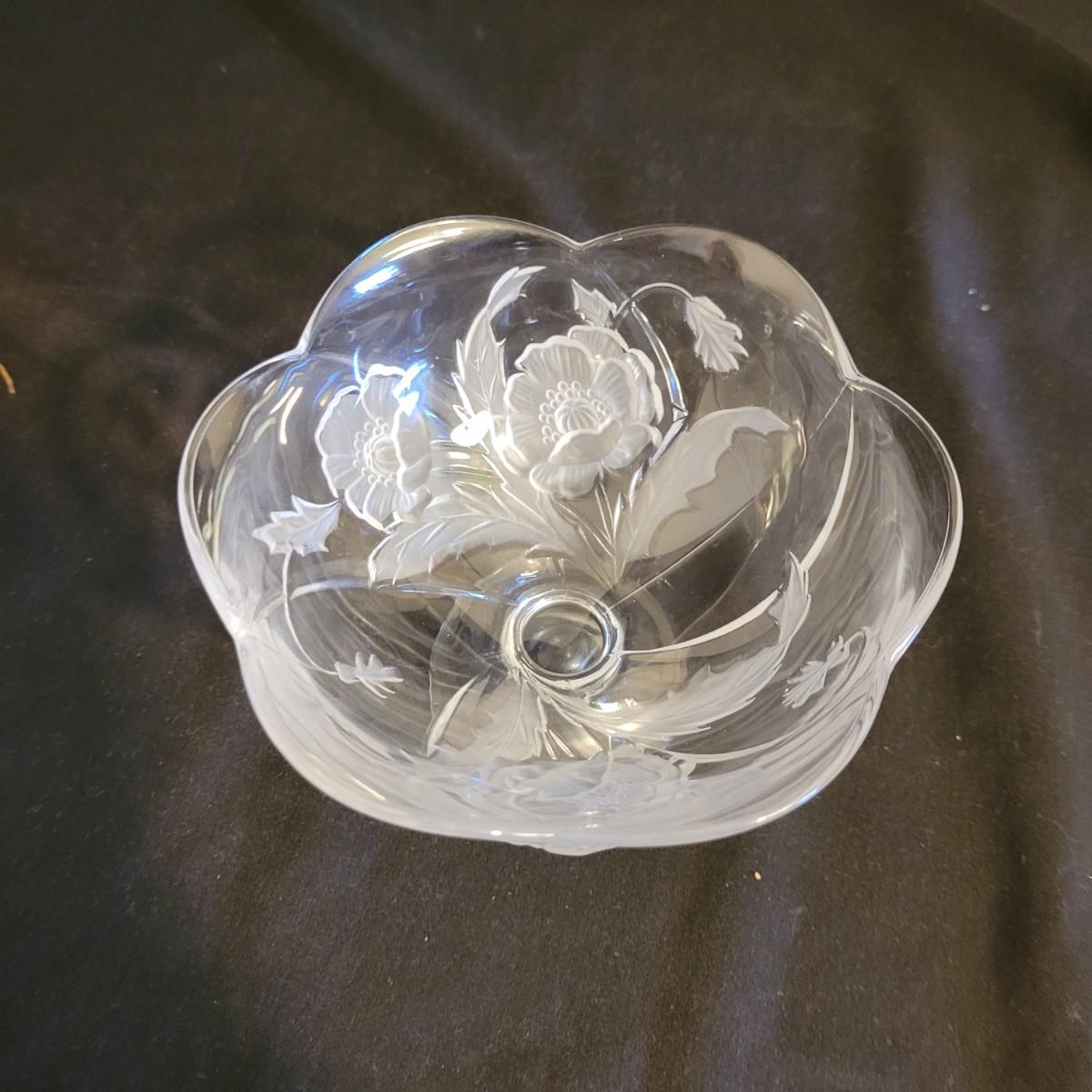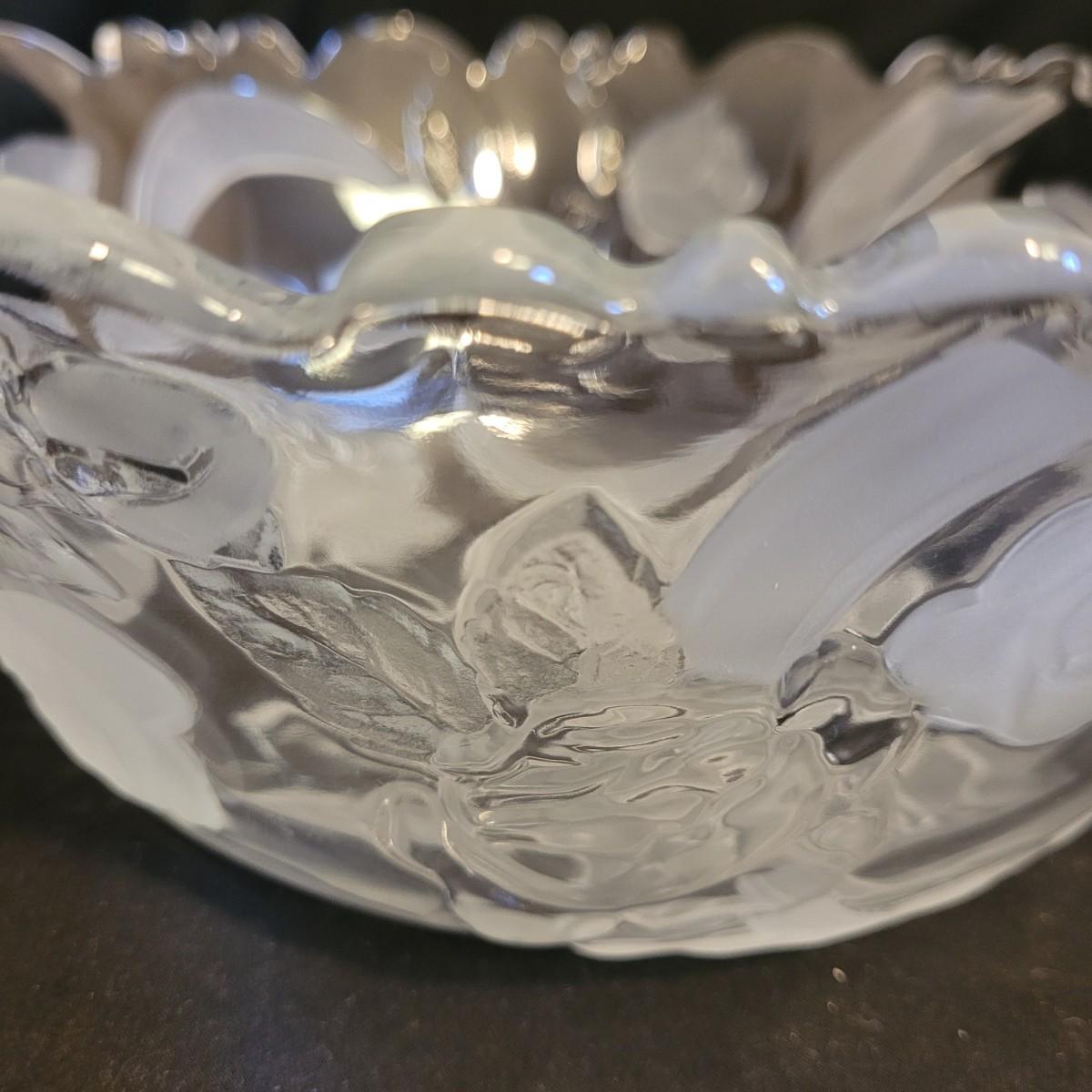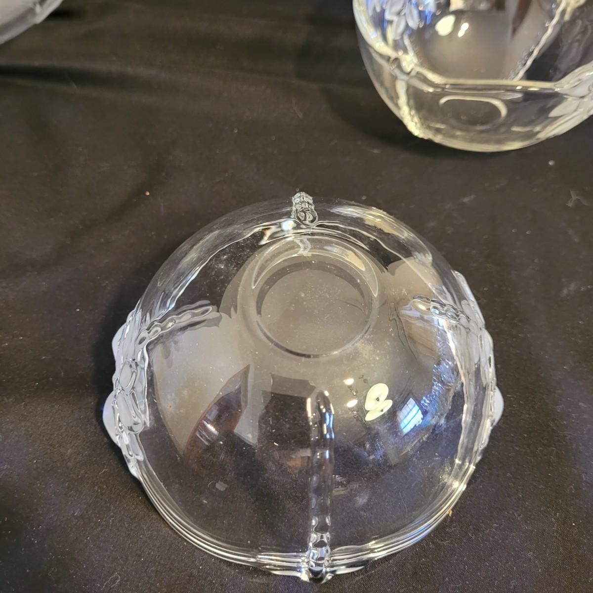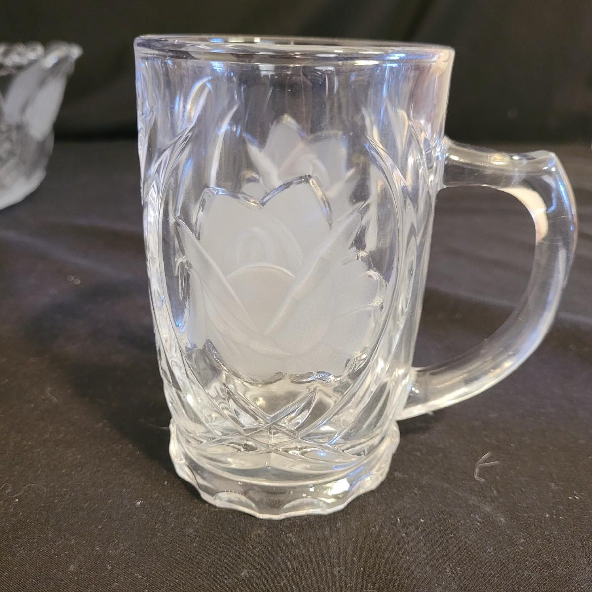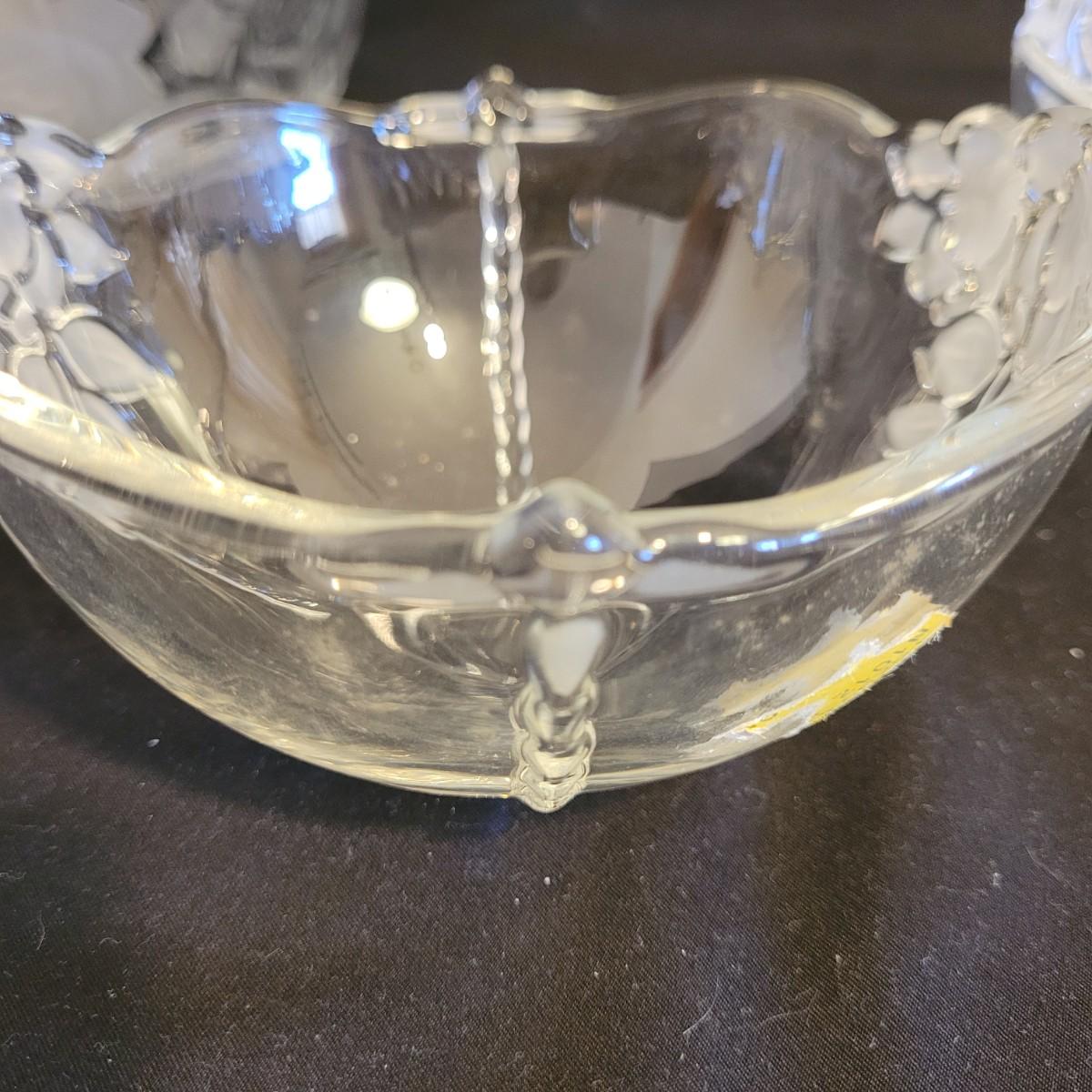 This lot includes eight serving bowls and dishes, and three mugs. Each piece has a unique floral etched design with frosting, adding depth and character. Some items still have original stickers, will need light cleaning to remove them. Large punch bowl measures approximately 11"DIA x5"H. Shipping available. Shipping can be costly. We suggest calling our local UPS with dimensions and getting an estimate before bidding: (828) 252-6930.