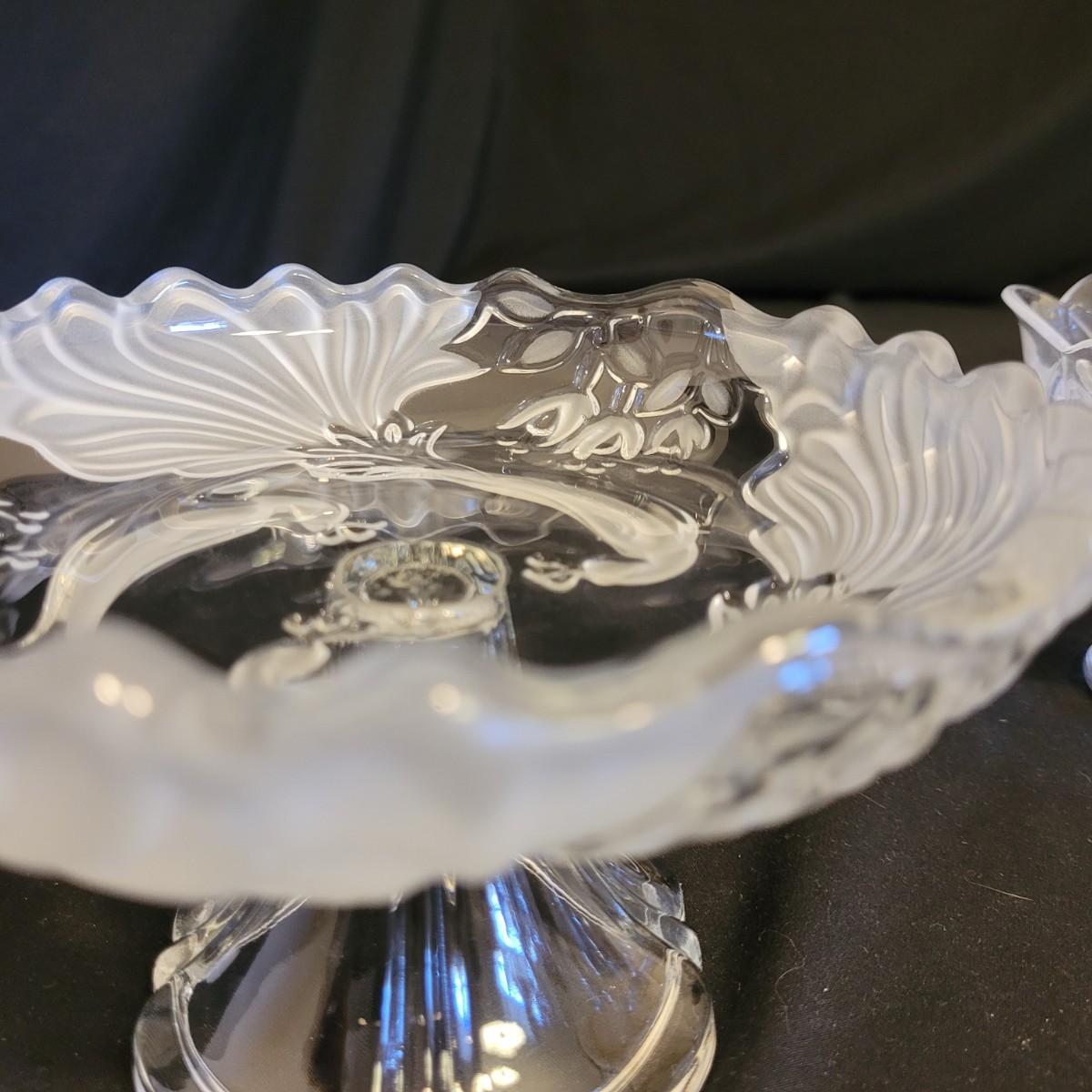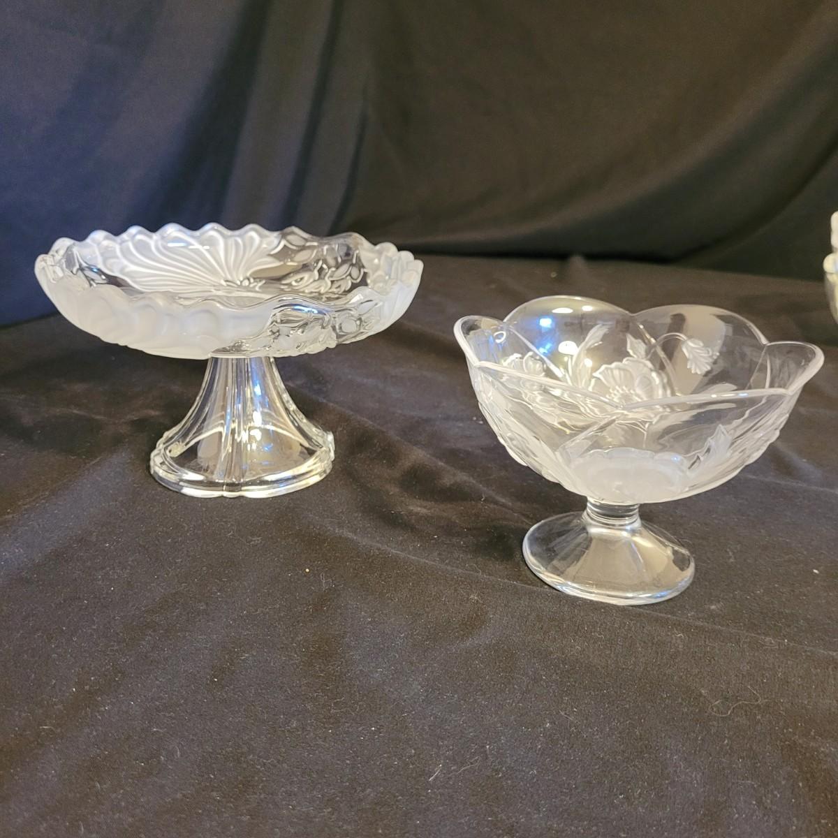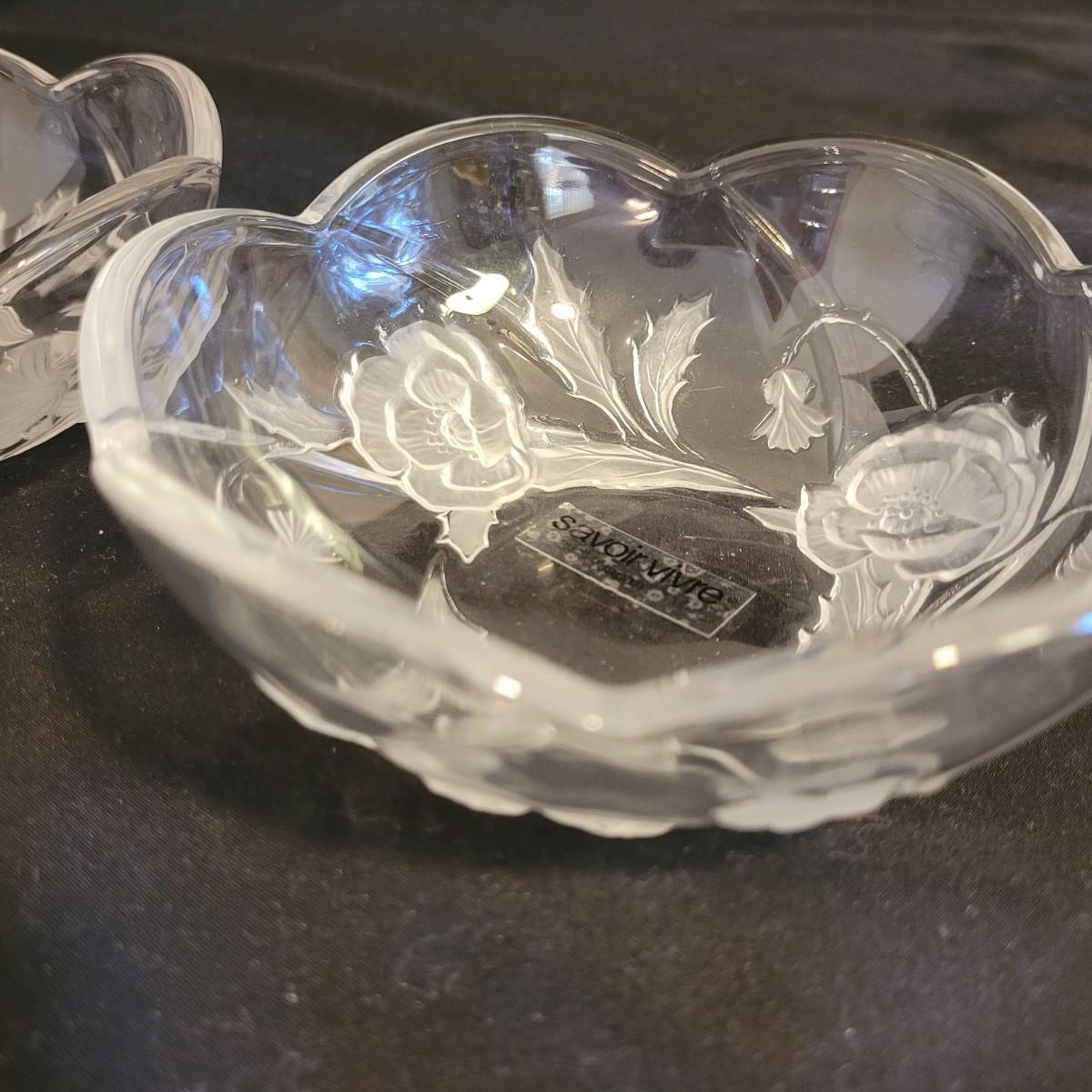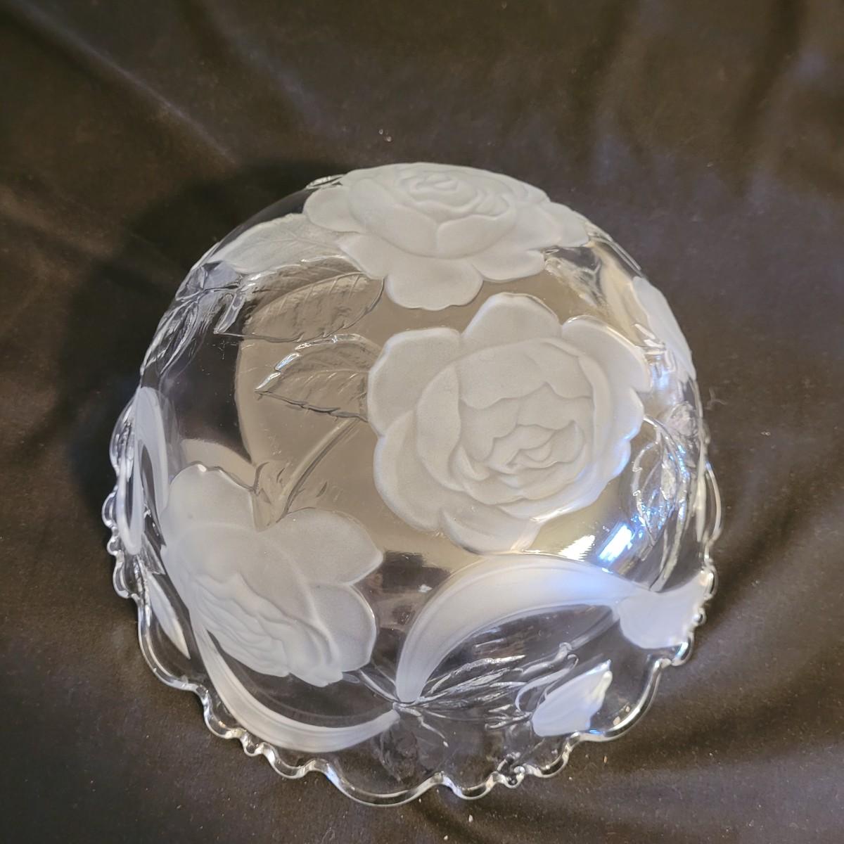 This lot includes eight serving bowls and dishes, and three mugs. Each piece has a unique floral etched design with frosting, adding depth and character. Some items still have original stickers, will need light cleaning to remove them. Large punch bowl measures approximately 11"DIA x5"H. Shipping available. Shipping can be costly. We suggest calling our local UPS with dimensions and getting an estimate before bidding: (828) 252-6930.