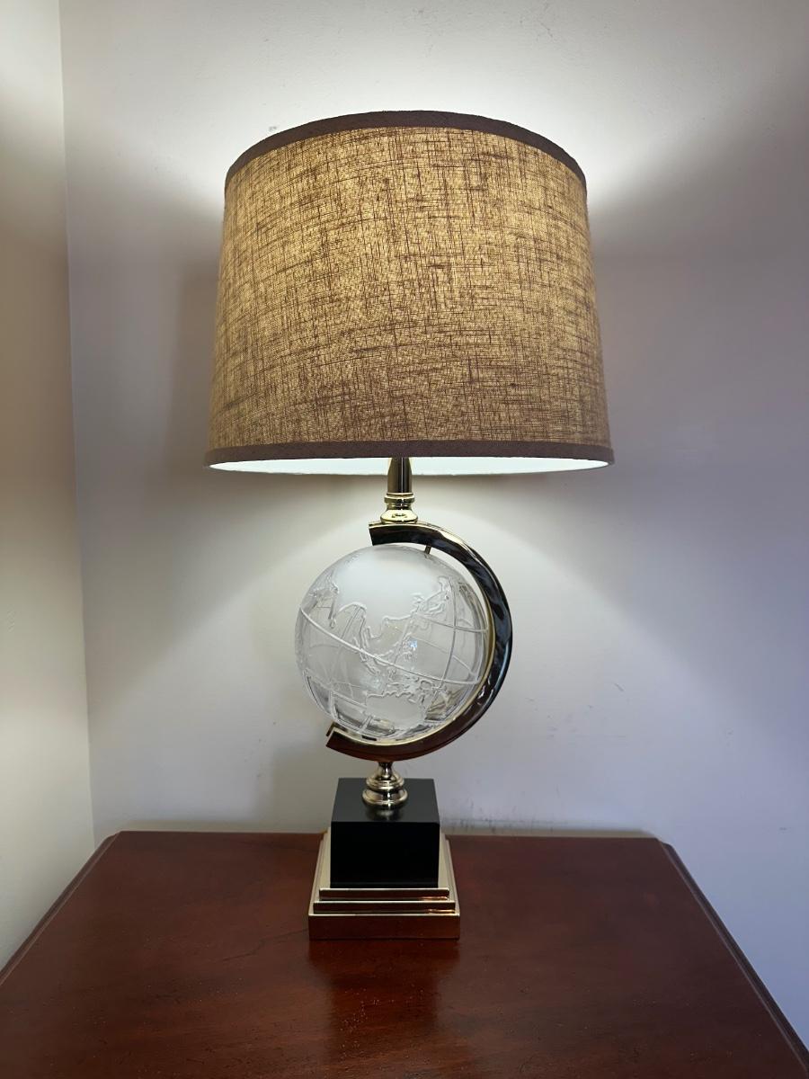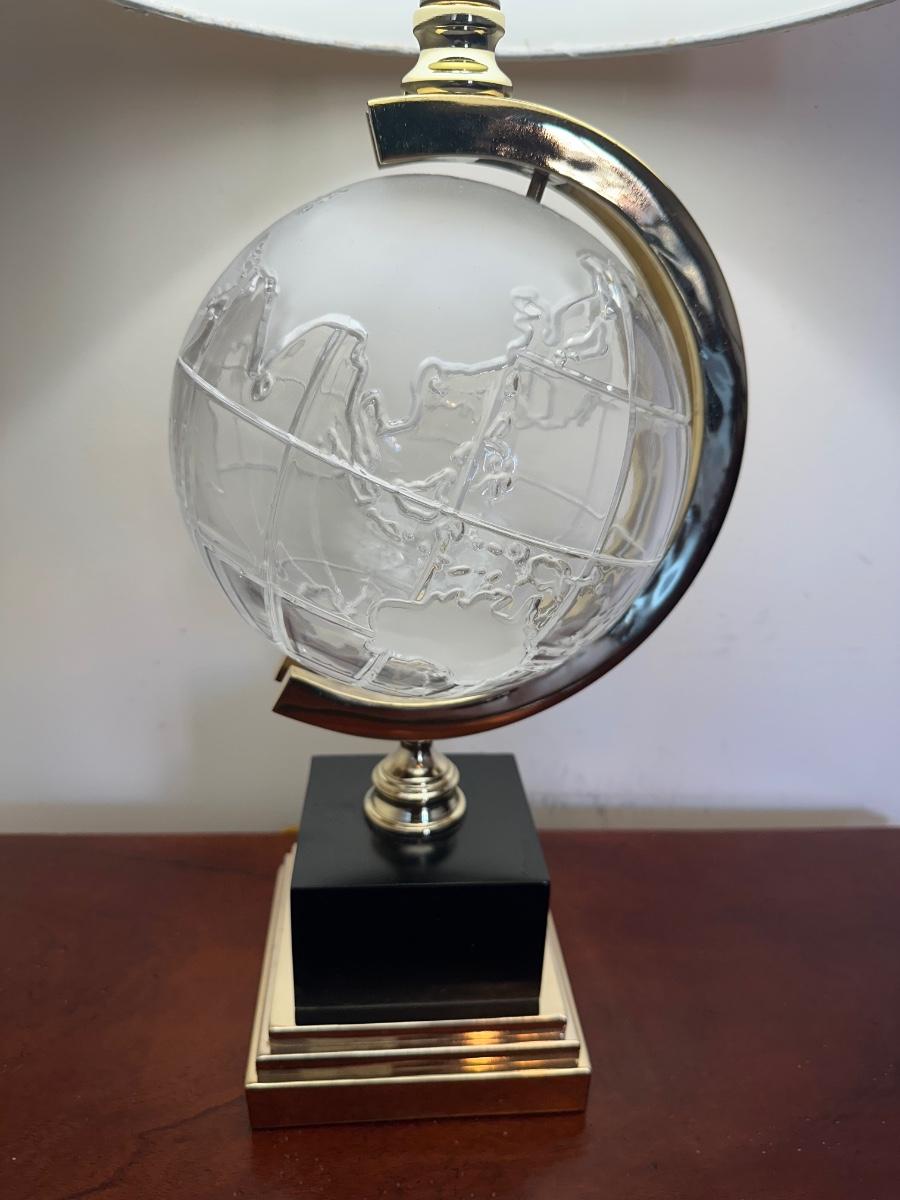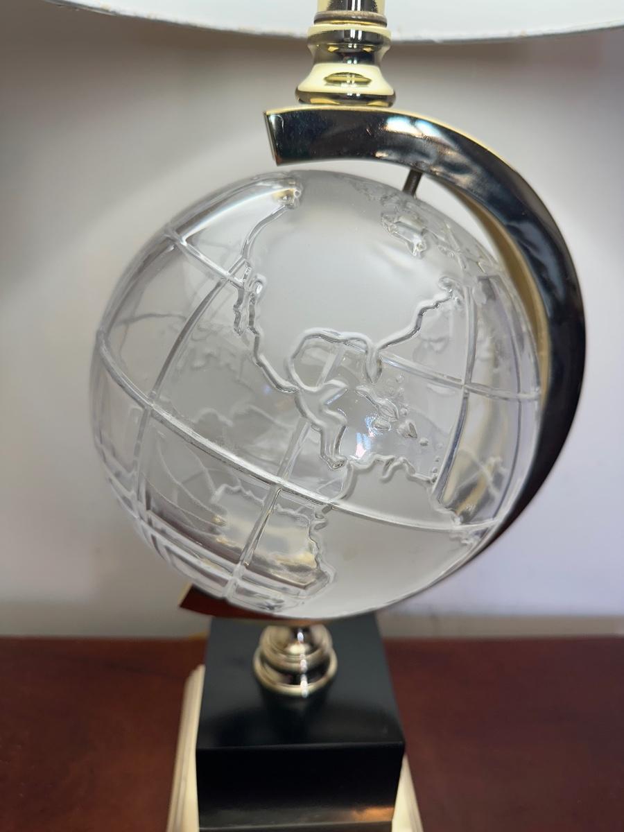 Contemporary table lamp featuring a rotating frosted glass globe with raised continent detail.