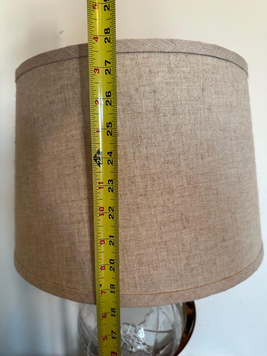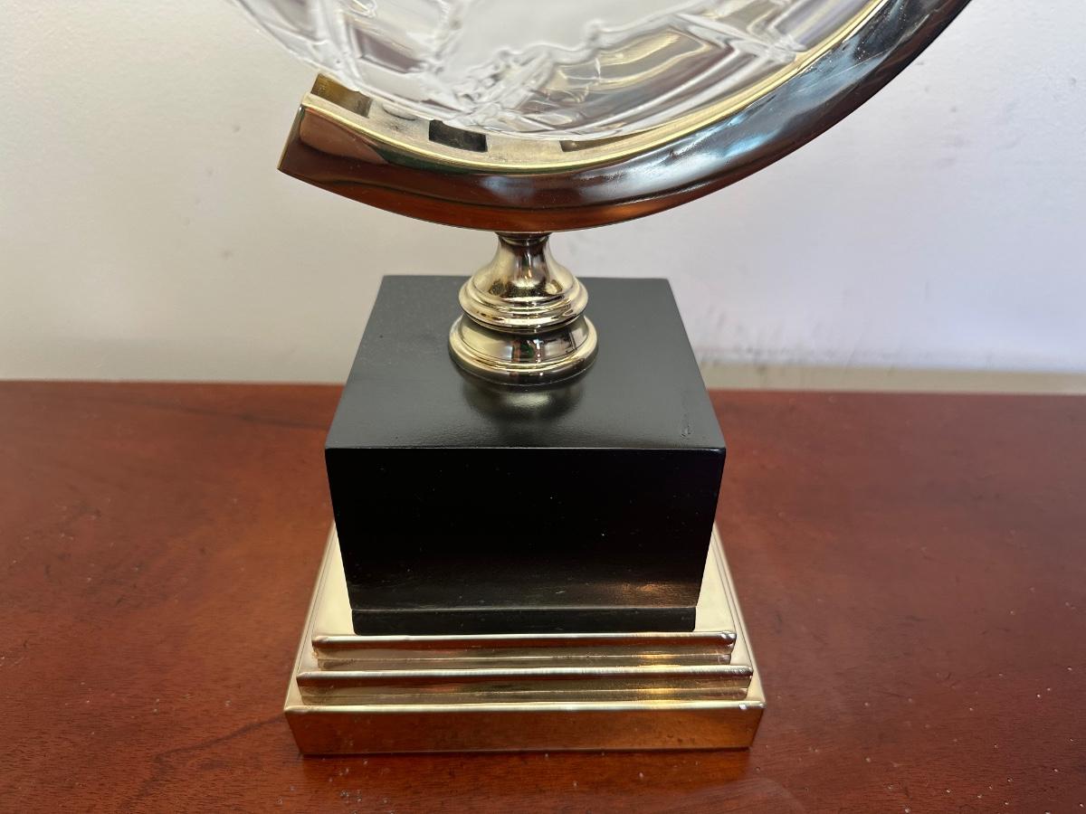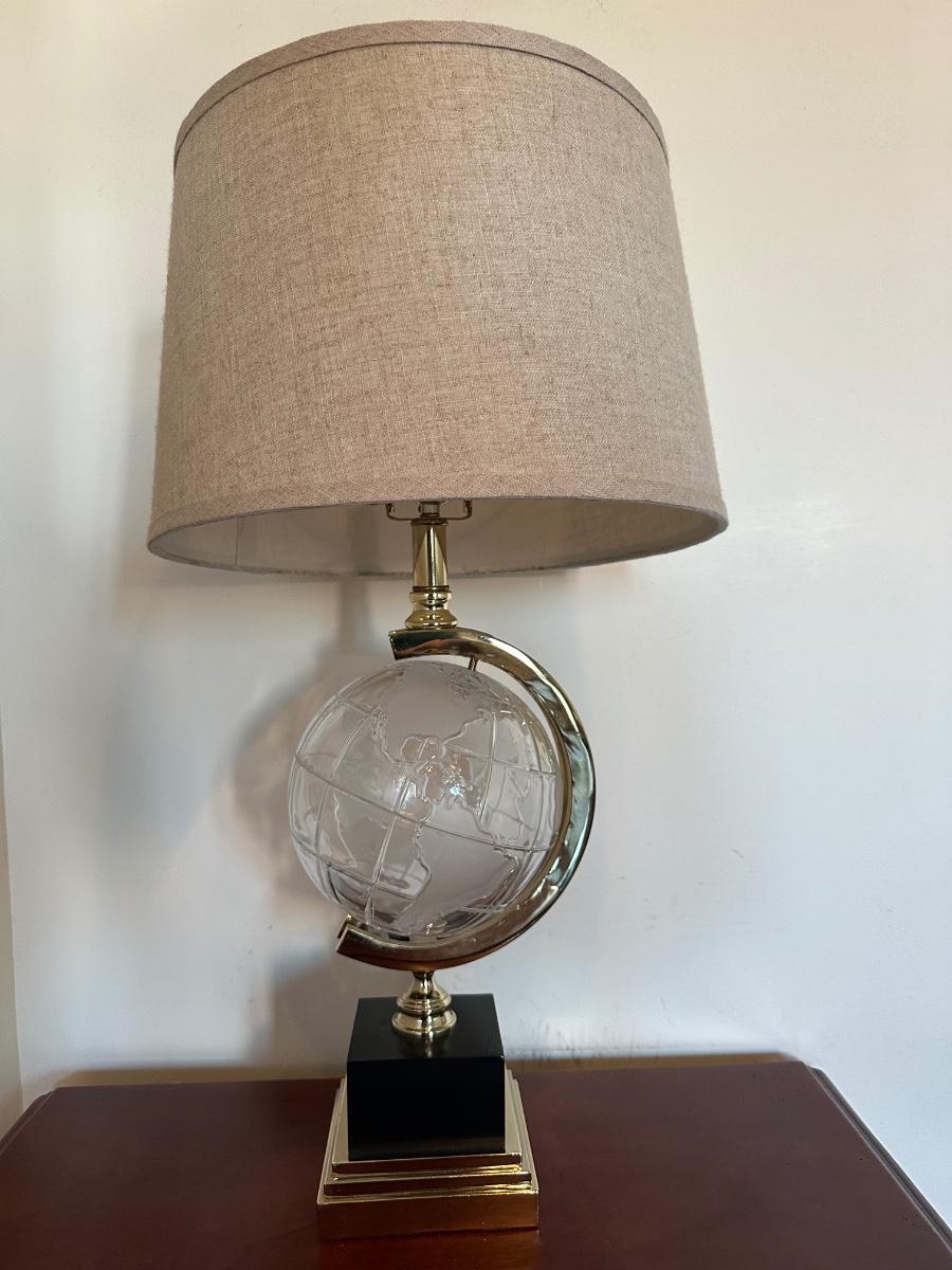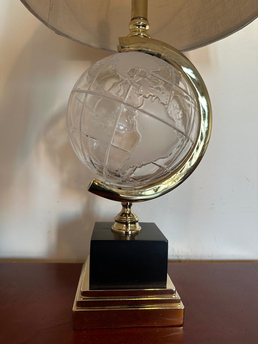 Contemporary table lamp featuring a rotating frosted glass globe with raised continent detail.