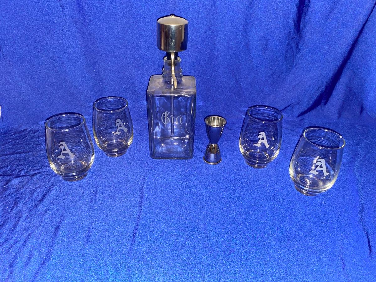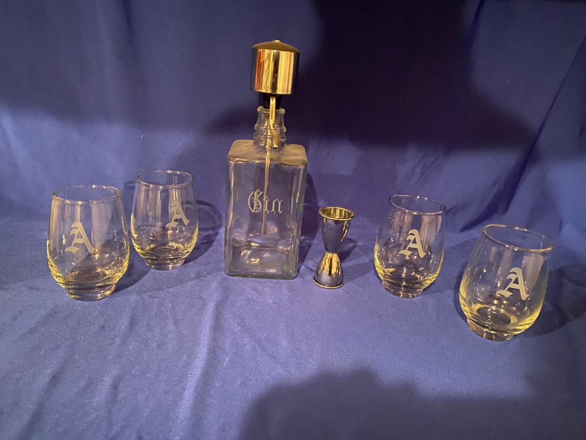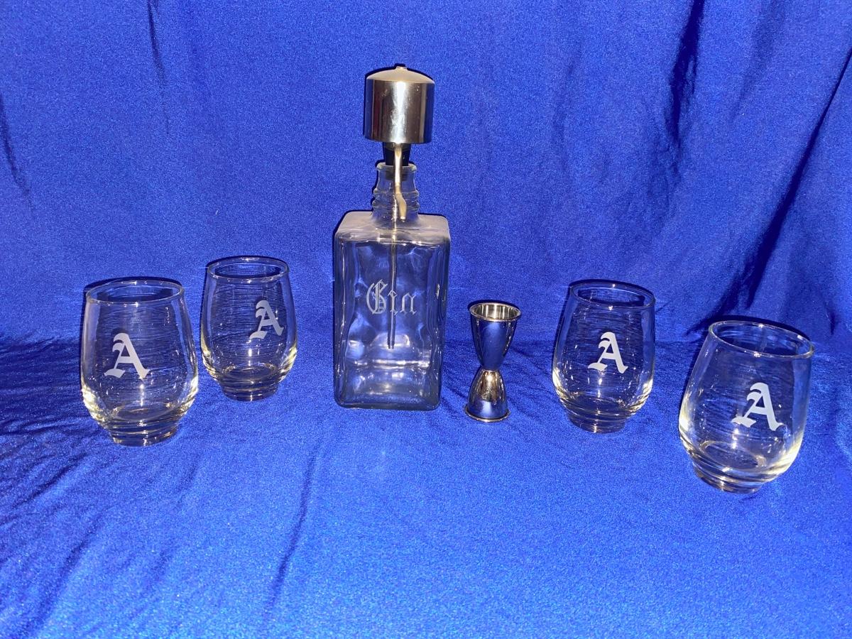 ETCHED GIN DISPENSER BOTTLE AND DRINK GLASSES WITH “A” ETCHED ON SIDE