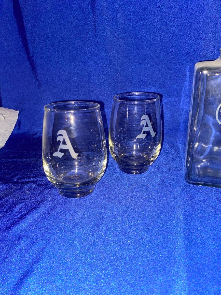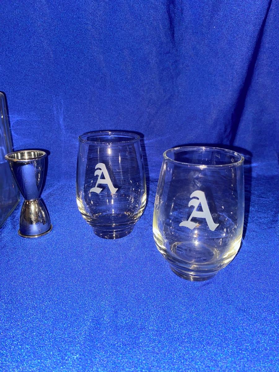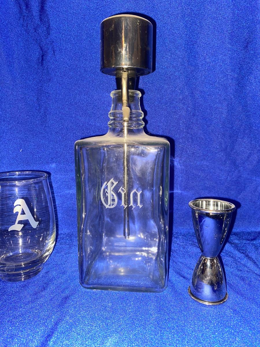 ETCHED GIN DISPENSER BOTTLE AND DRINK GLASSES WITH “A” ETCHED ON SIDE